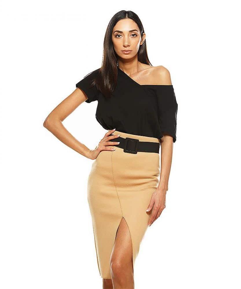 A beige skirt is easy to match with white and black colors. Gray will not be an exception either.