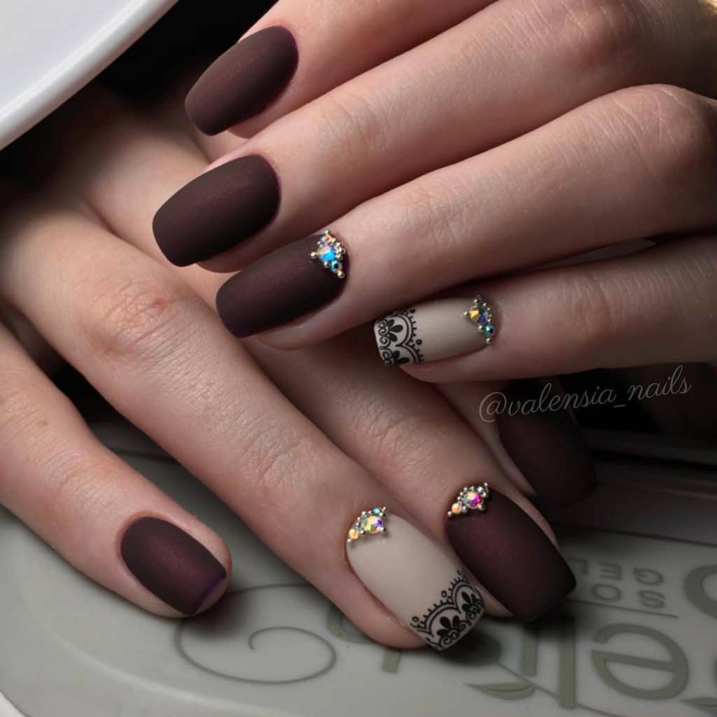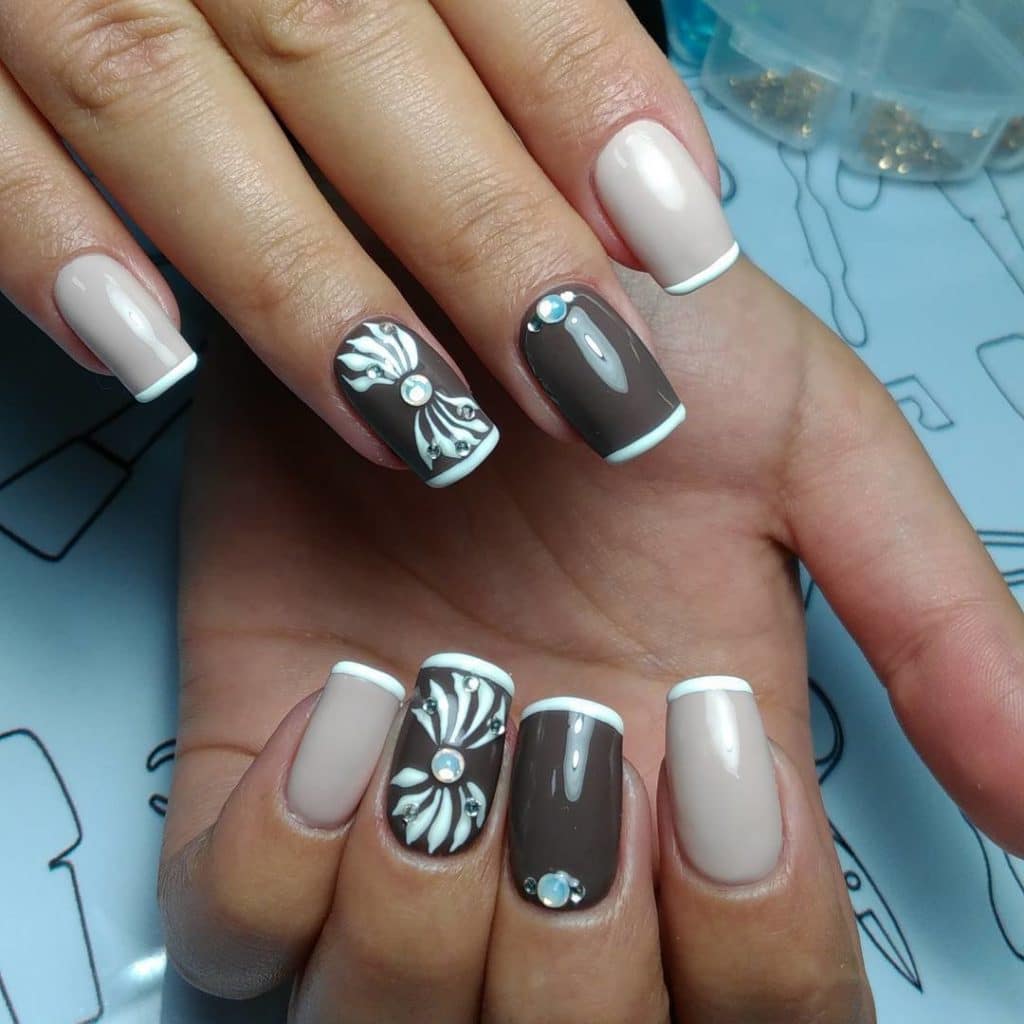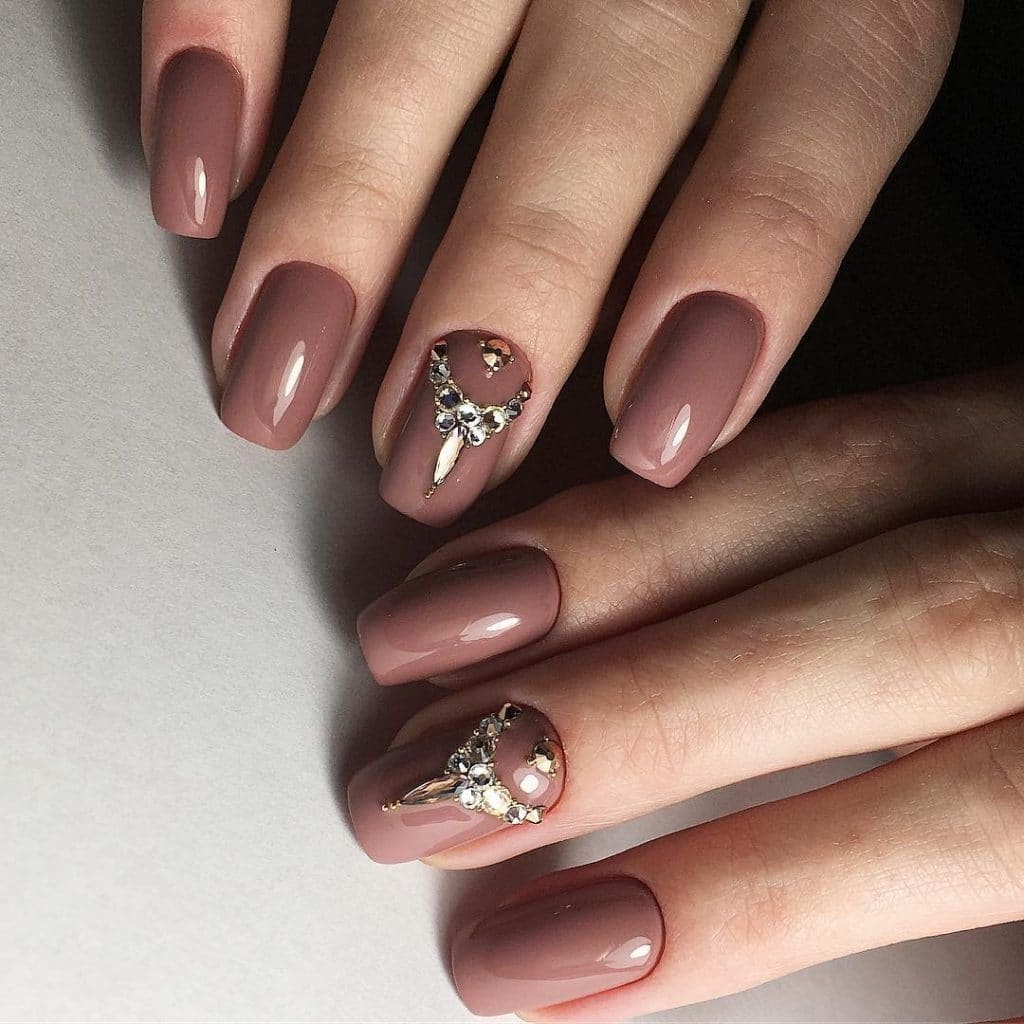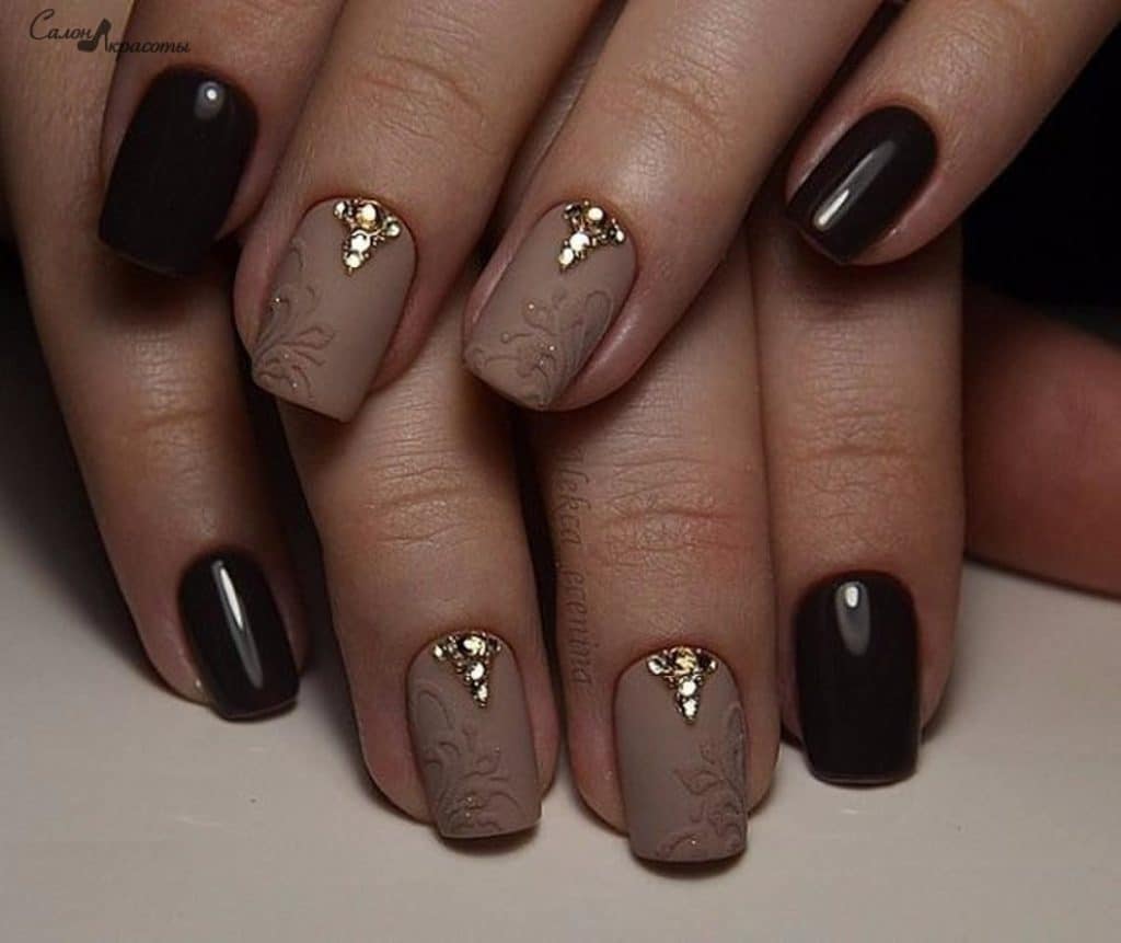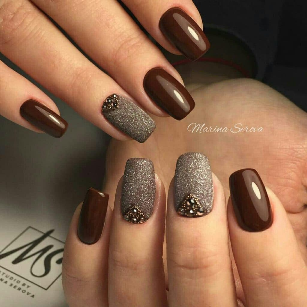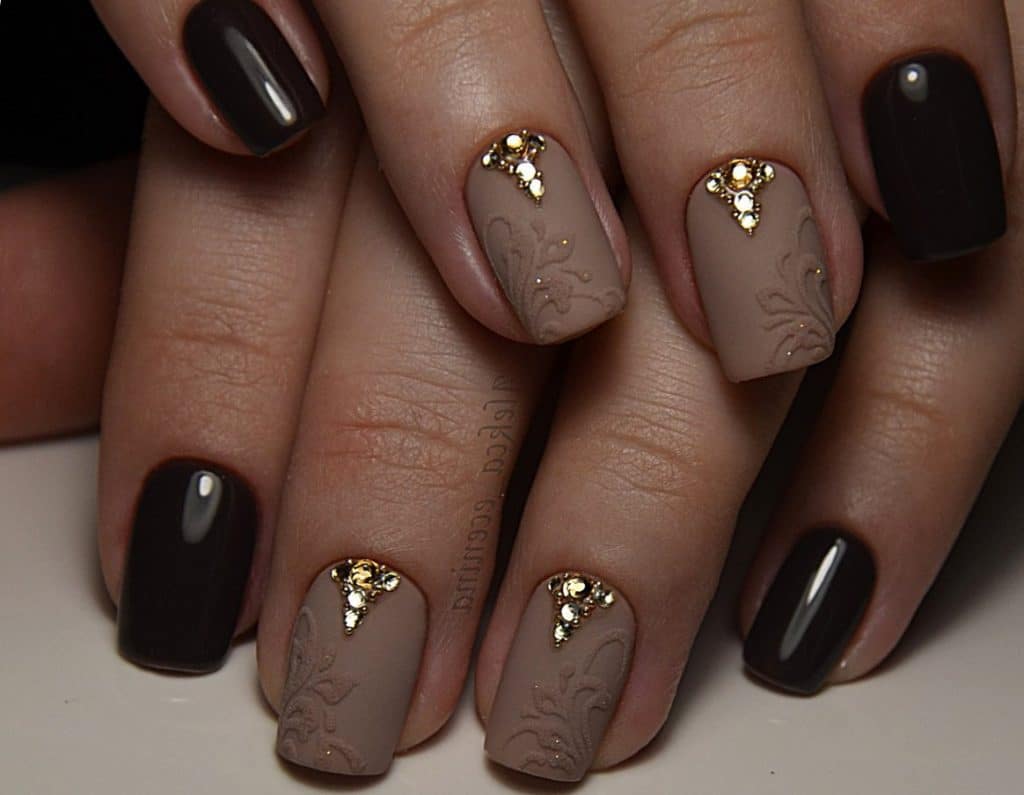 - Coffee manicure with rhinestones.