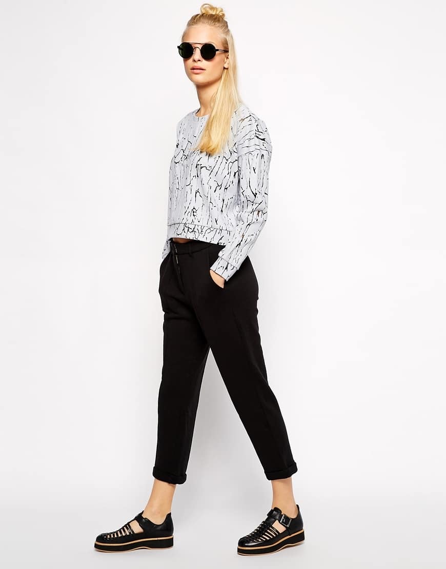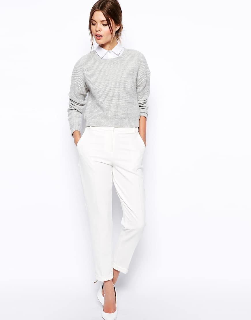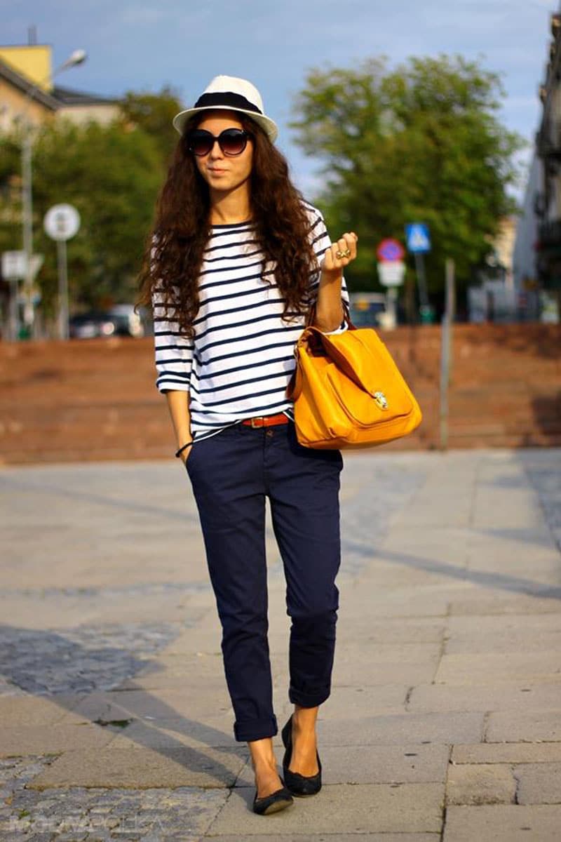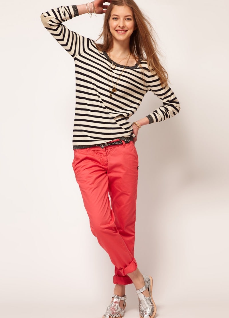To create a marine style for such trousers, it’s enough to pick up a white striped sweater.