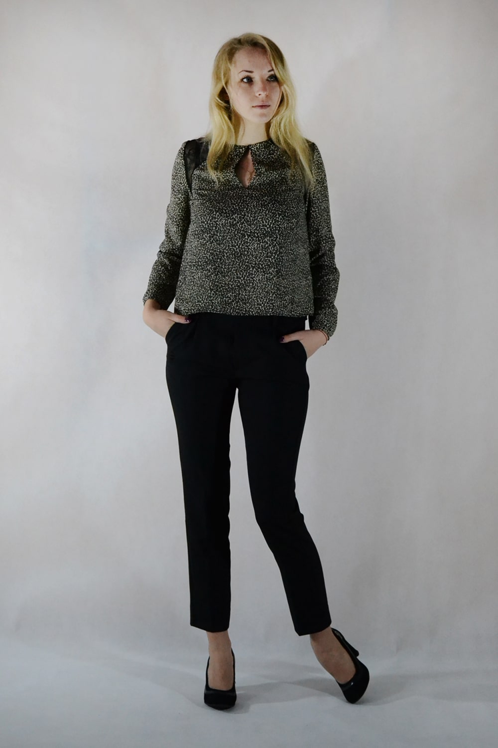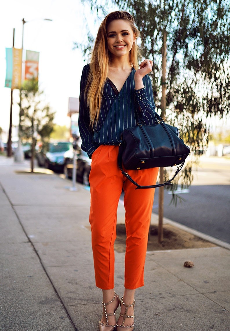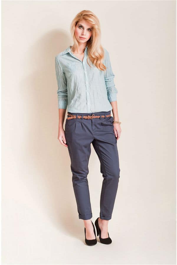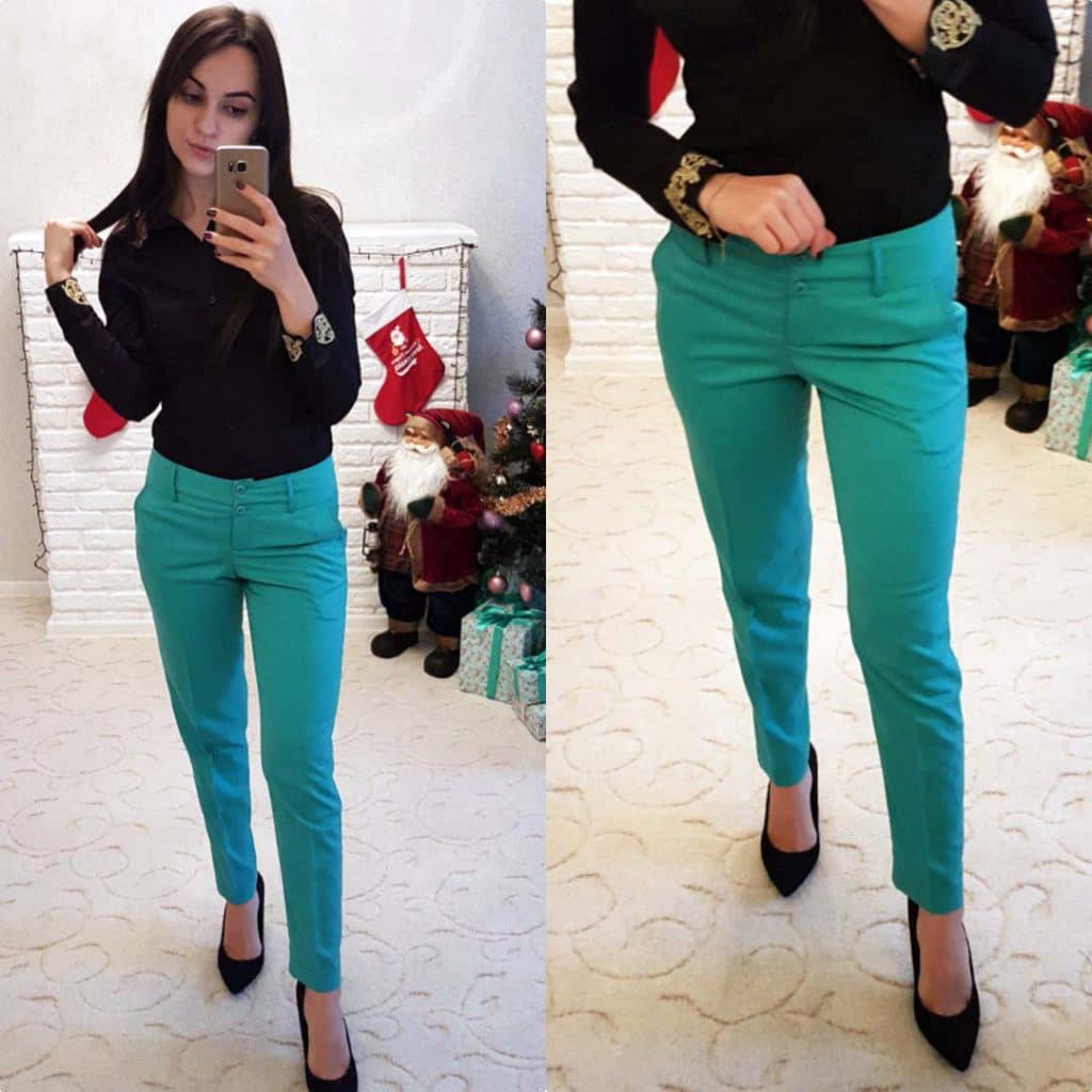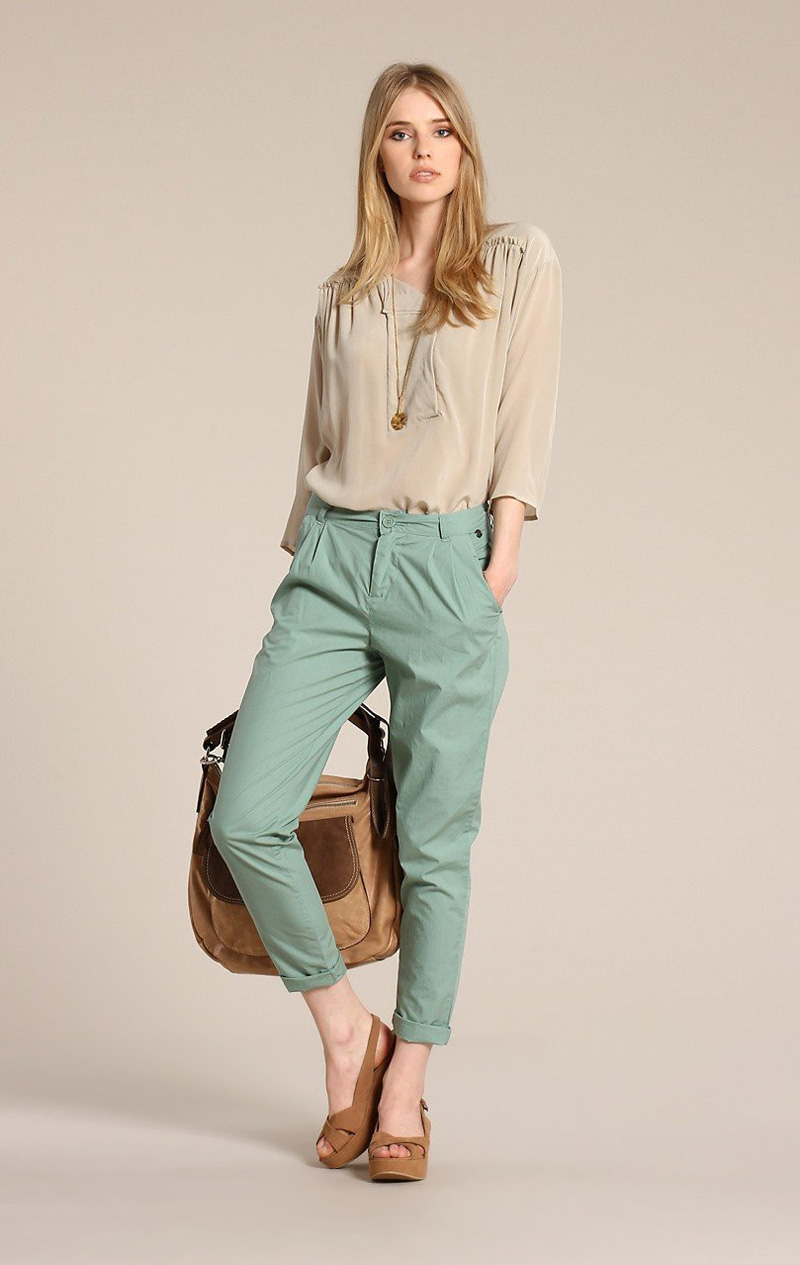 With trousers of this color, blouses of white or bright cold colors are excellent to combine.