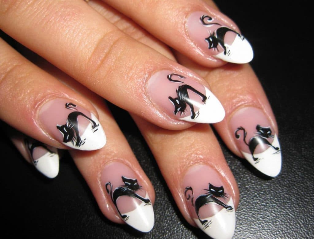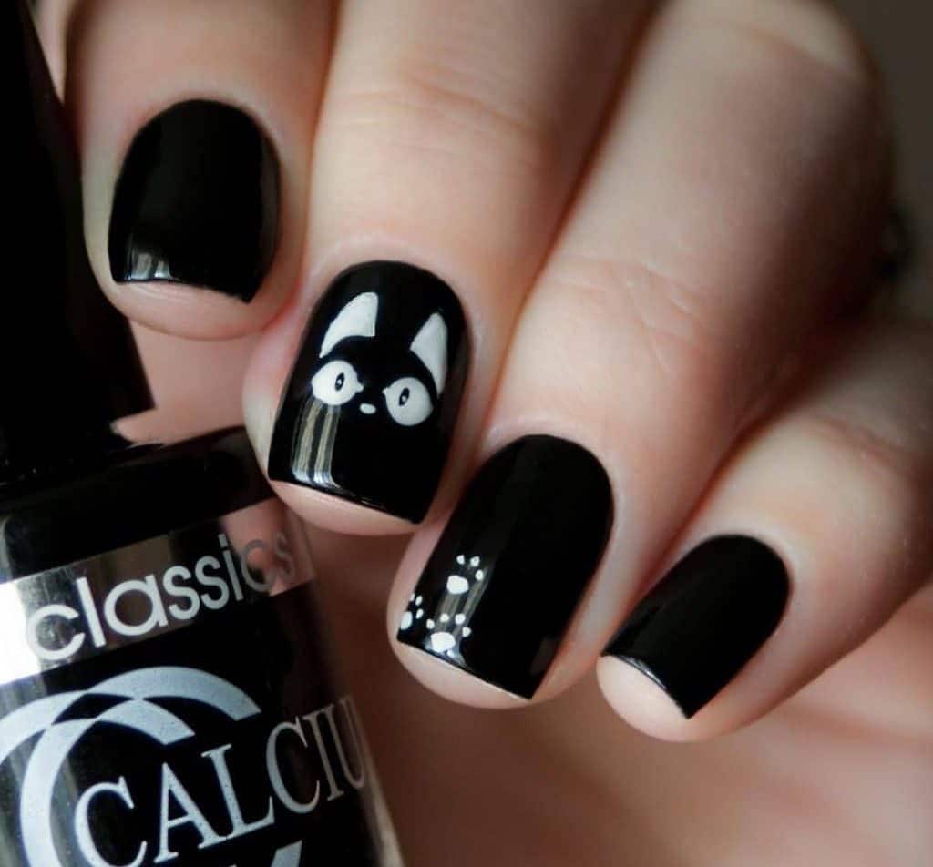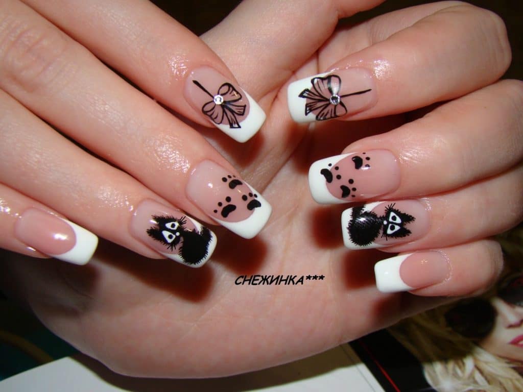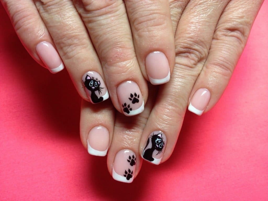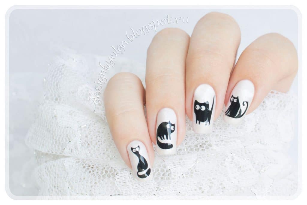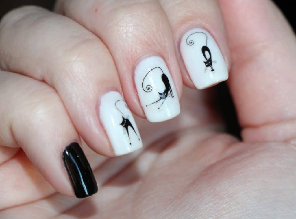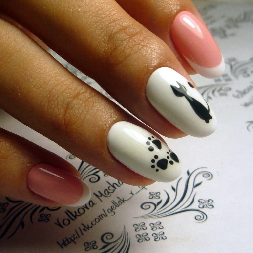 A white manicure with a black cat looks very nice. It is important to show individualism and imagination. You can depict cat eyes, you can complement such a manicure with rhinestones and other decor. It all depends on your taste.