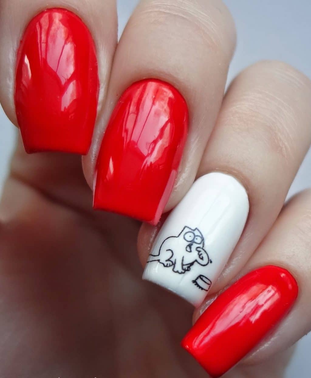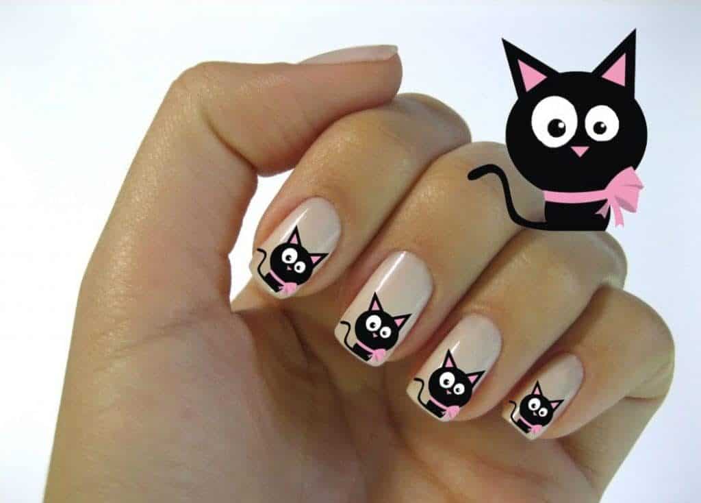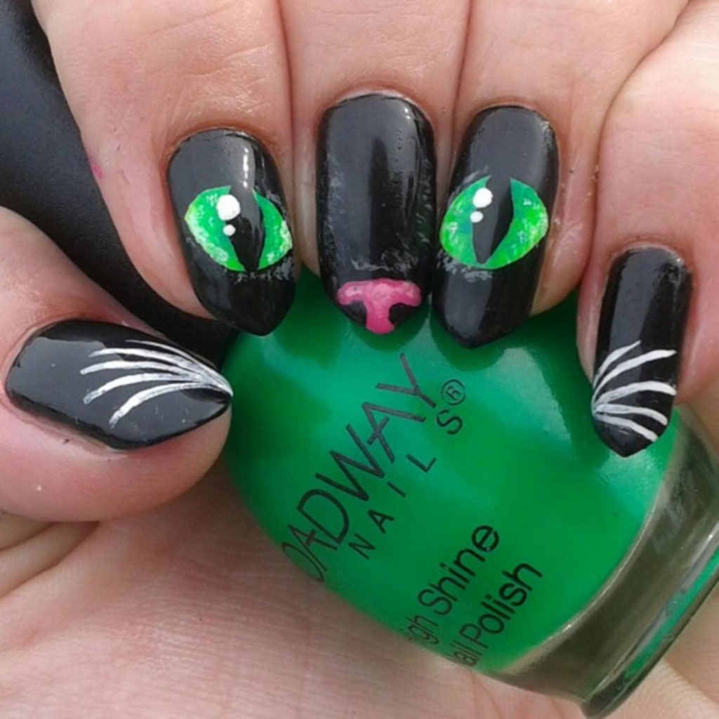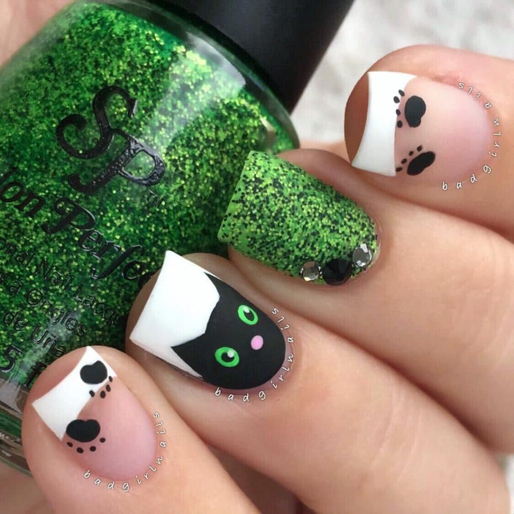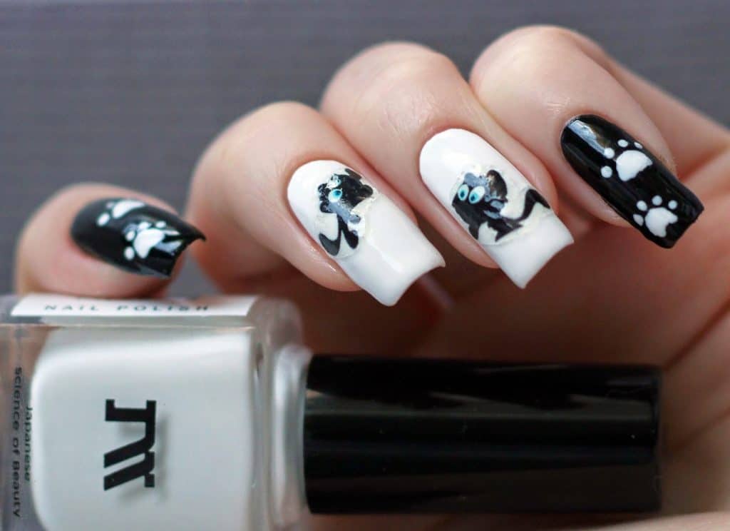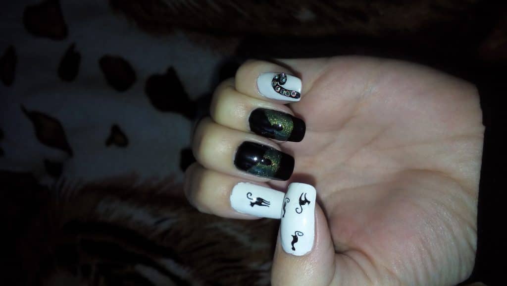 A white manicure with a black cat looks very nice. It is important to show individualism and imagination. You can depict cat eyes, you can complement such a manicure with rhinestones and other decor. It all depends on your taste.