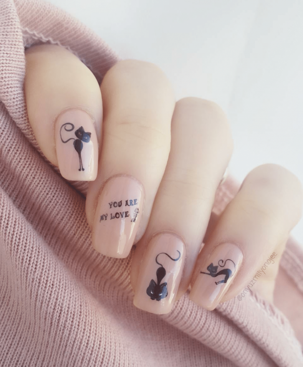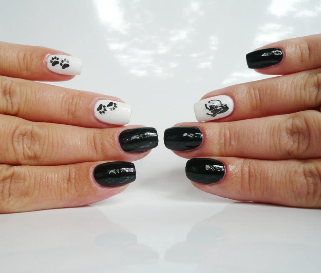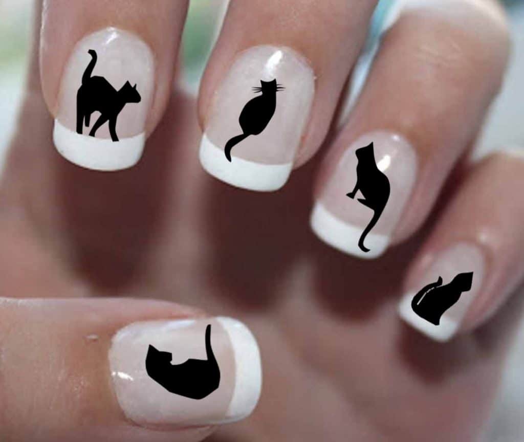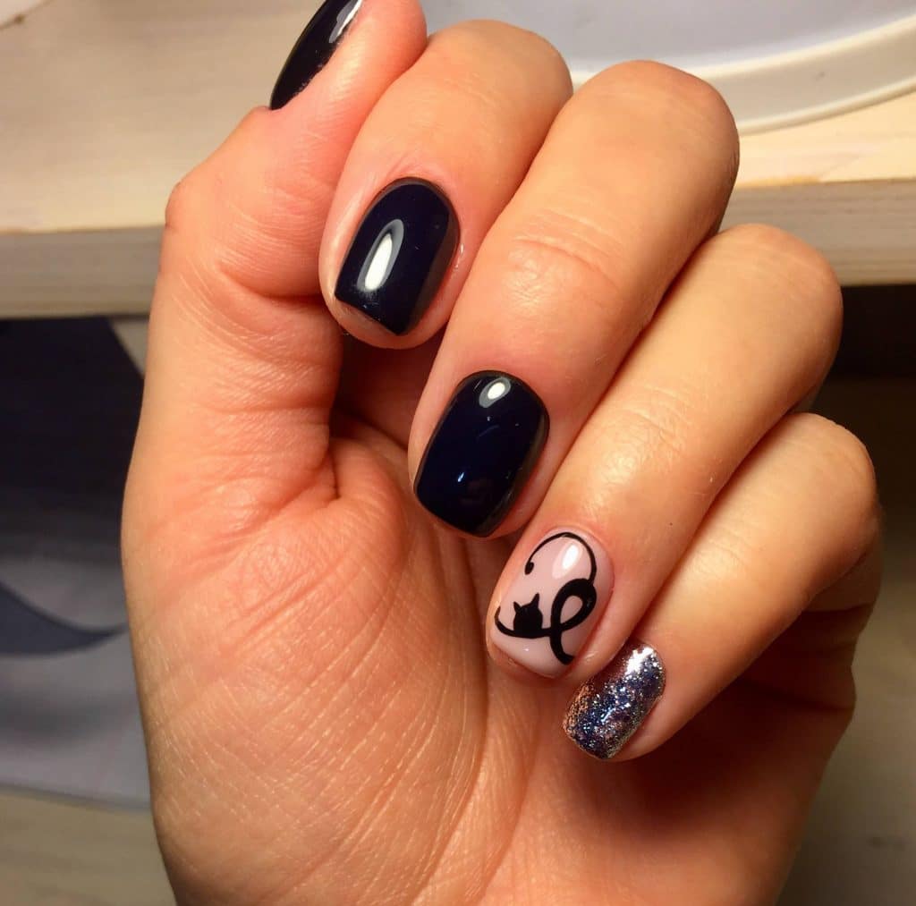Another option for cat manicure is a manicure with a cat silhouette. The silhouette can be applied to the nail with the slider sticker. (the so-called slider design), or painted by hand with a brush.