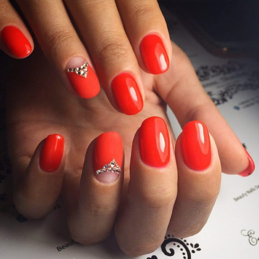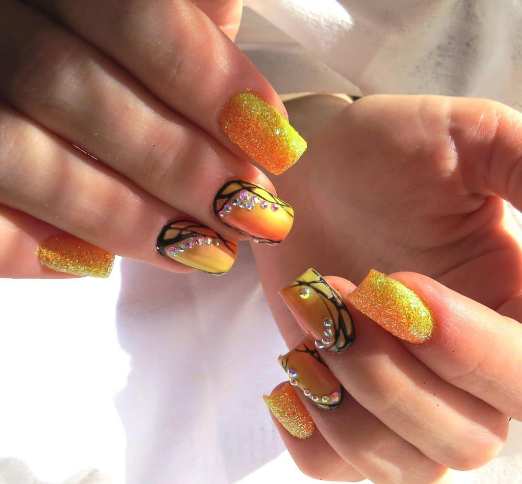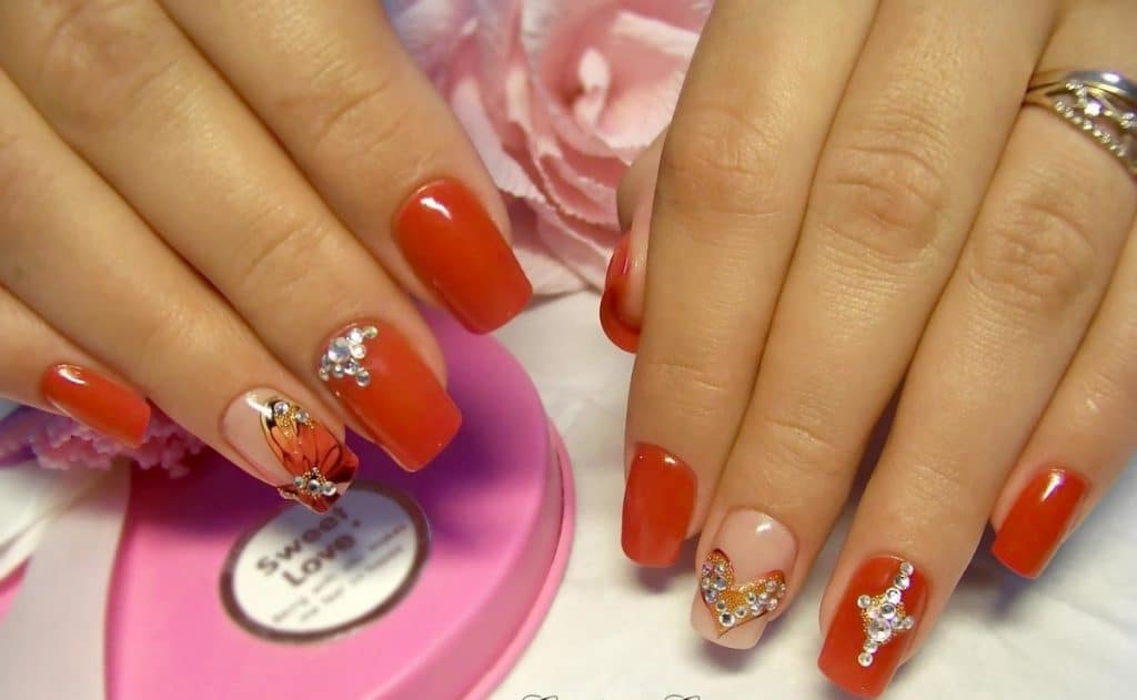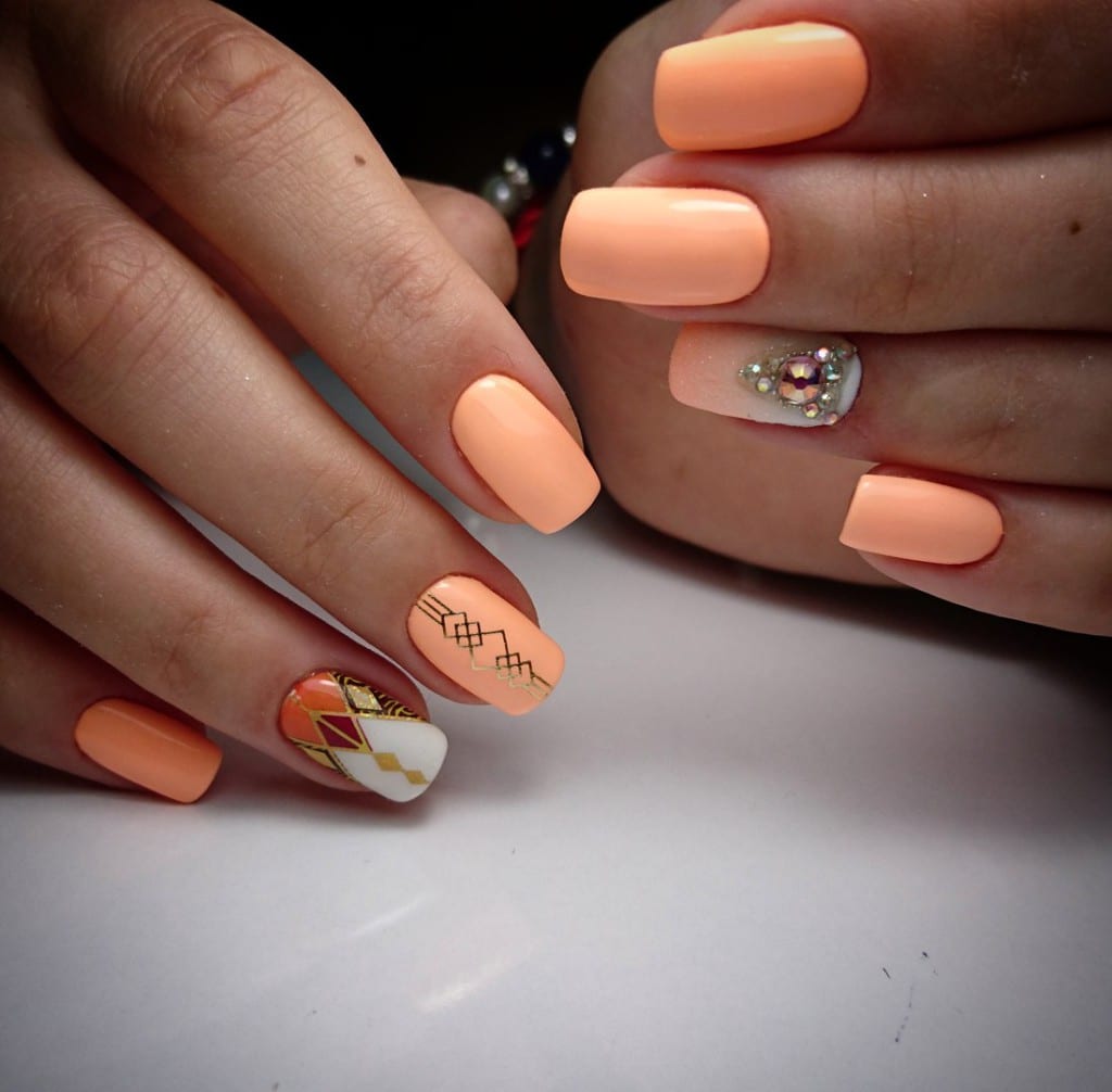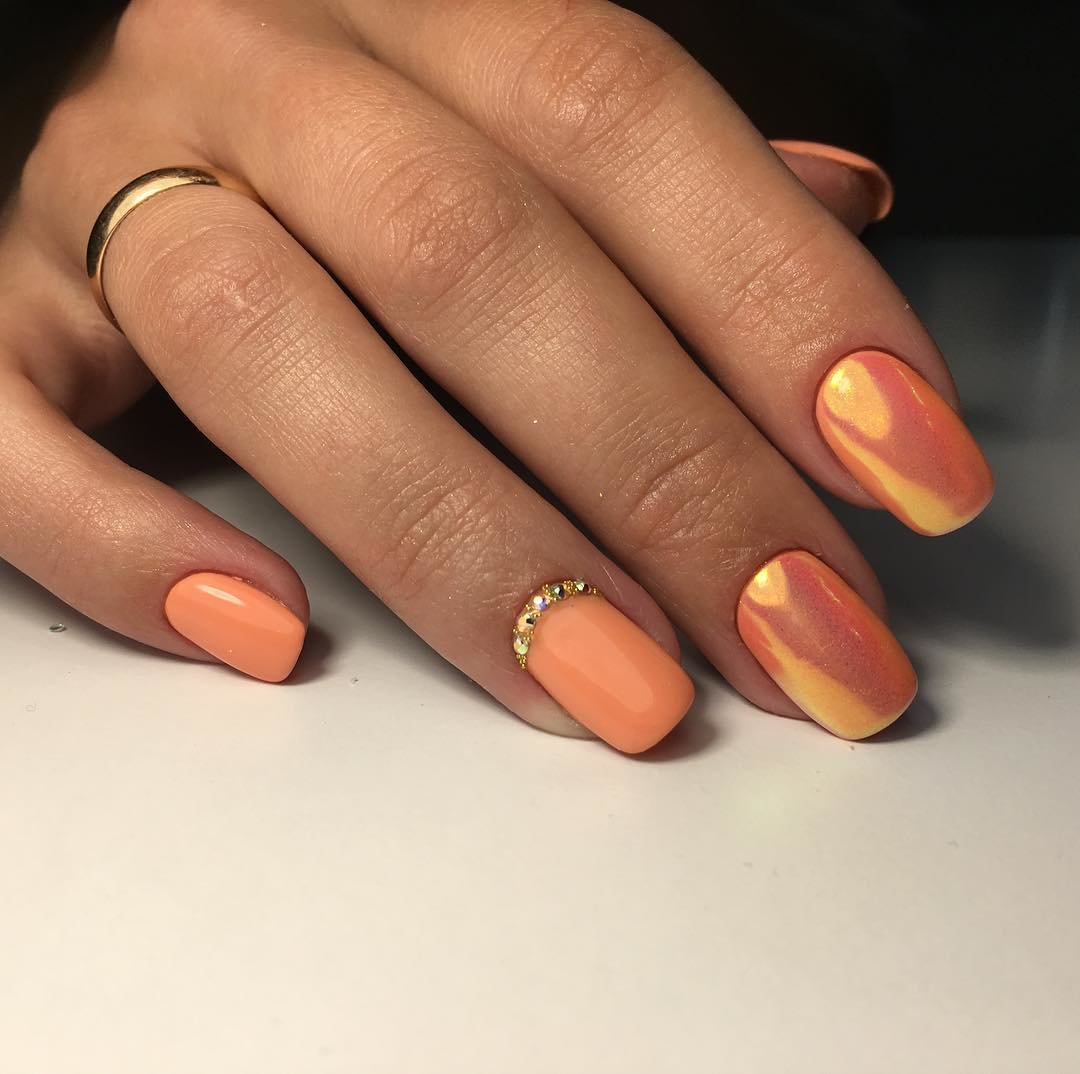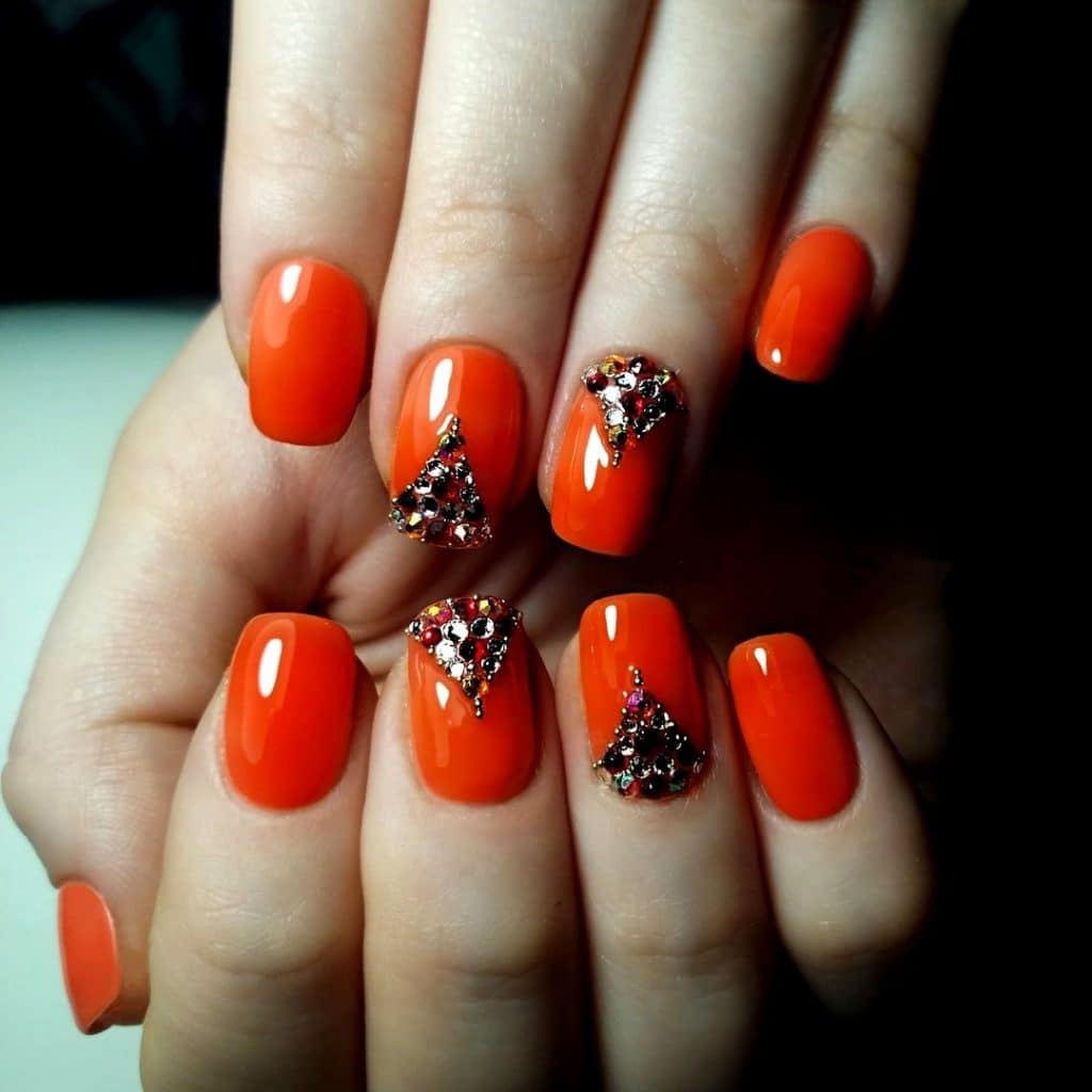 You can’t get away from them. Many girls still cannot imagine life without these sparkling crystals. With an orange tint, such a manicure will attract even more attention.