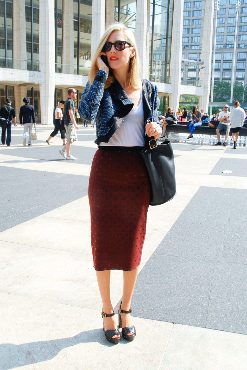 Most often, a strict appearance is required for work, and there is no way to do without a midi skirt with a high waist. In addition, of course, various blouses and shirts go to her. If relief is allowed, you can vary the skirt with the top of a free cut, but it is better to throw a jacket on top.
