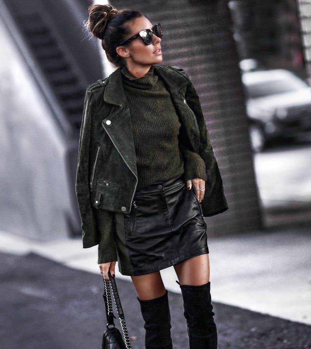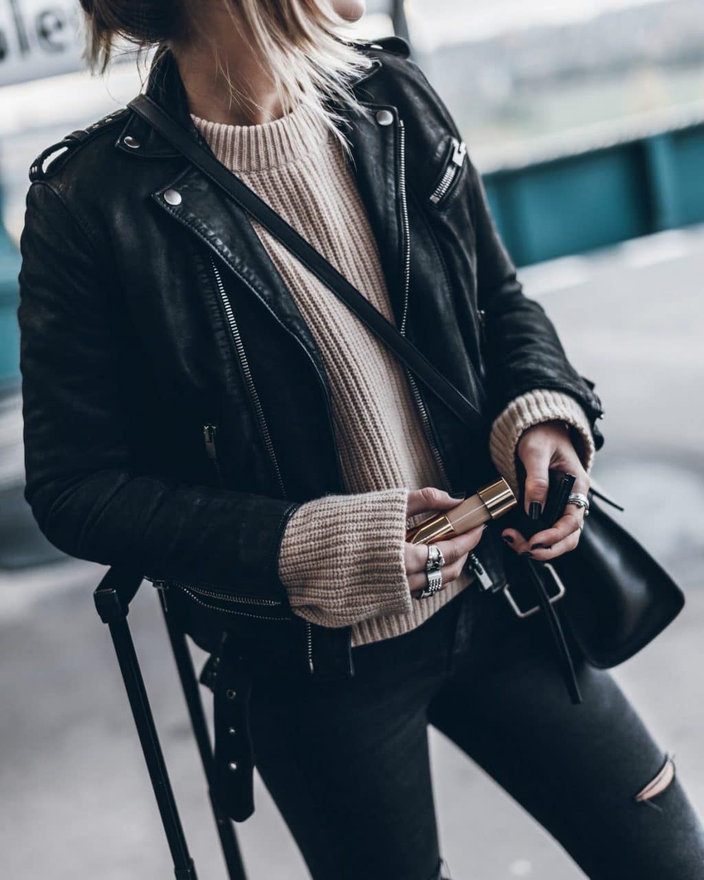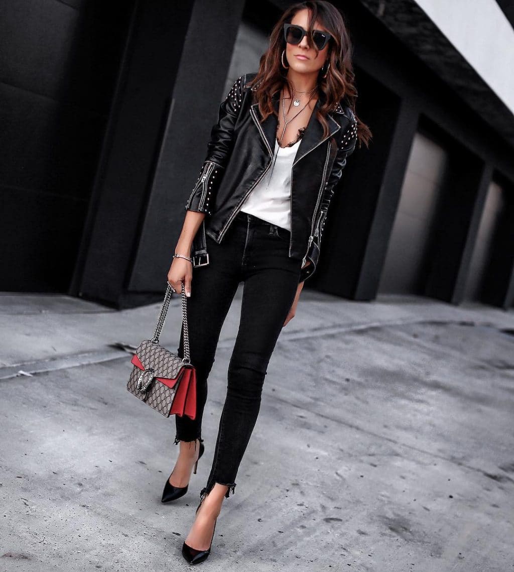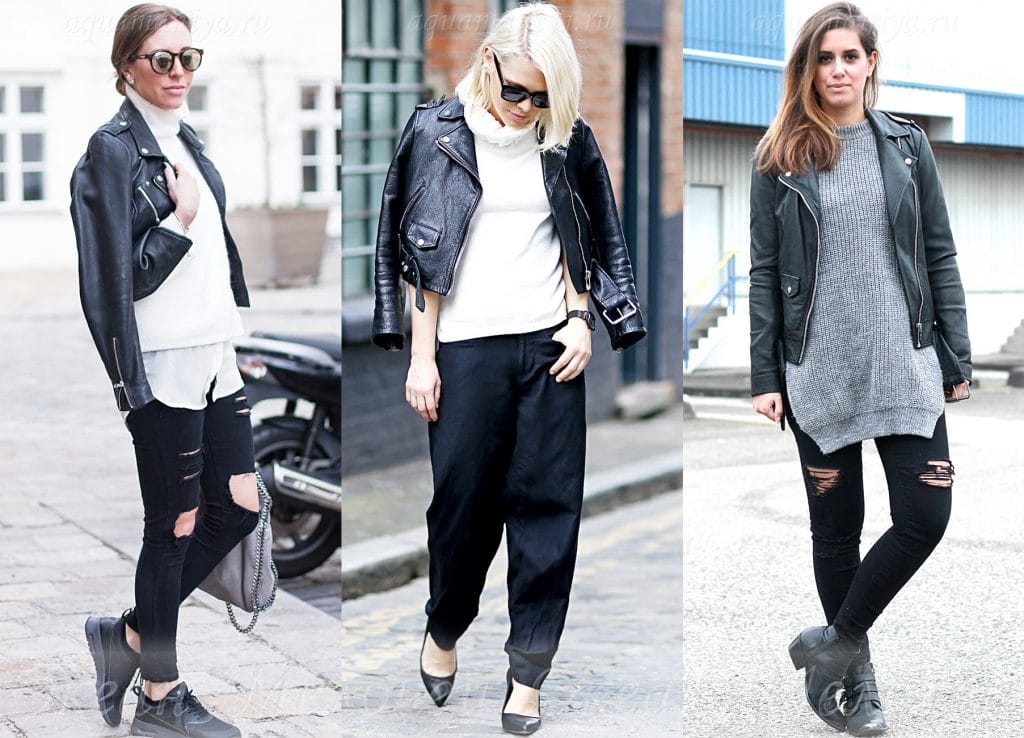 Leather jackets can be easily combined with any sweater, whether it is in shape or oversize. With an oversized sweater, your image will look the most comfortable, cozy and warm. The bottom is chosen by anyone, it will be interesting to look with a dressed jumper. If you add a stole or scarf to this, then in this case you are not afraid of cold weather. In this case, sneakers, boots or rough shoes would be perfect as shoes. On warm days, this image is combined with a skirt, any variation of the skirt model is possible here. But if you can’t imagine a voluminous sweater with a skirt, there is always a classic version with jeans or trousers.