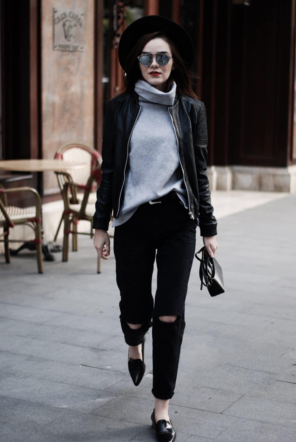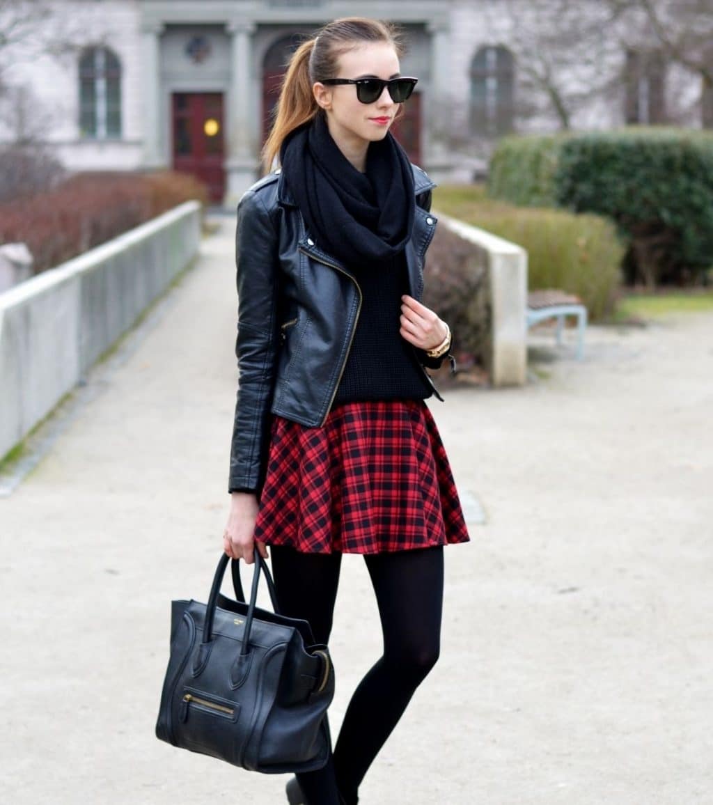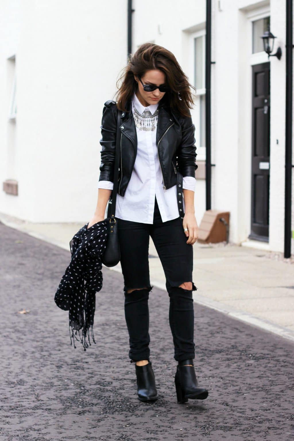 Leather jackets can be easily combined with any sweater, whether it is in shape or oversize. With an oversized sweater, your image will look the most comfortable, cozy and warm. The bottom is chosen by anyone, it will be interesting to look with a dressed jumper. If you add a stole or scarf to this, then in this case you are not afraid of cold weather. In this case, sneakers, boots or rough shoes would be perfect as shoes. On warm days, this image is combined with a skirt, any variation of the skirt model is possible here. But if you can’t imagine a voluminous sweater with a skirt, there is always a classic version with jeans or trousers.