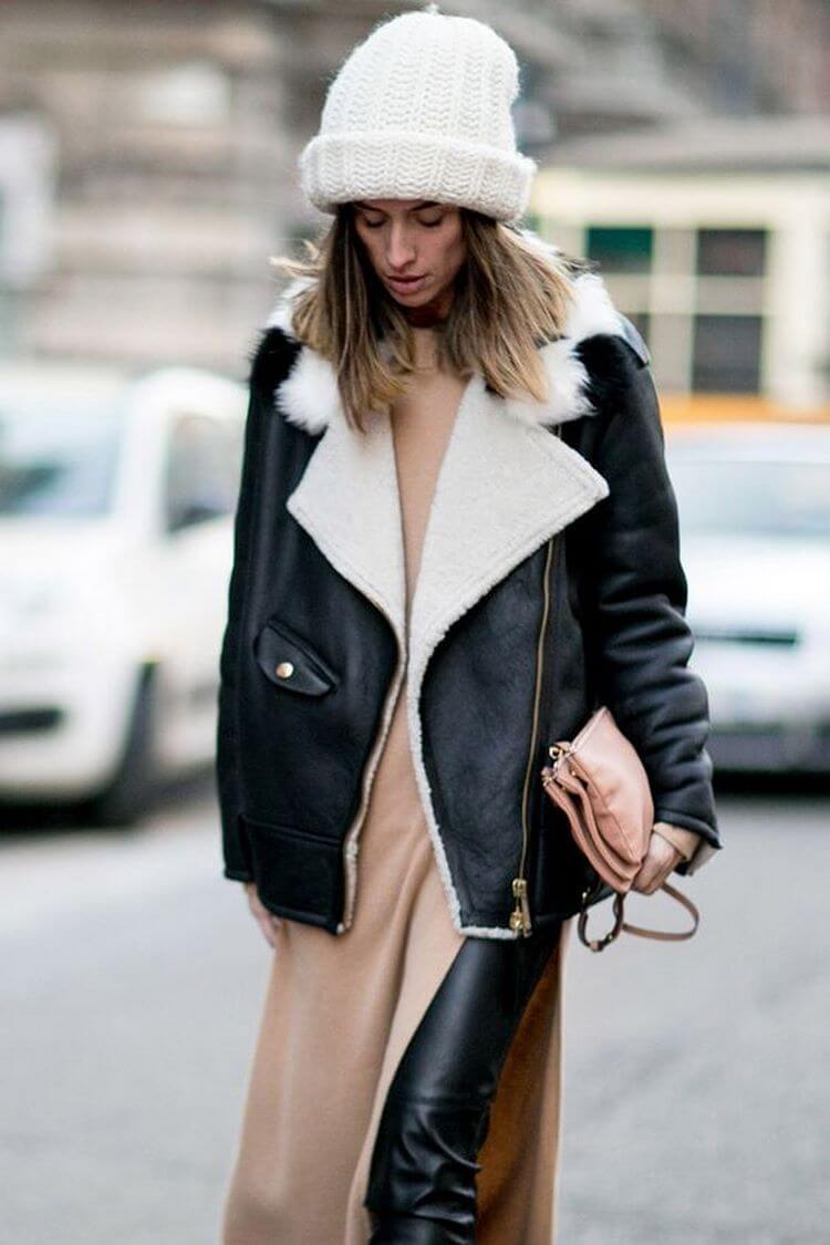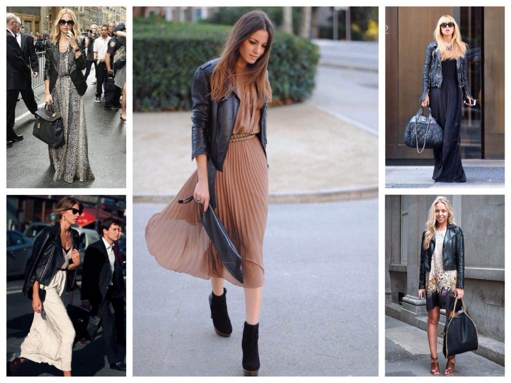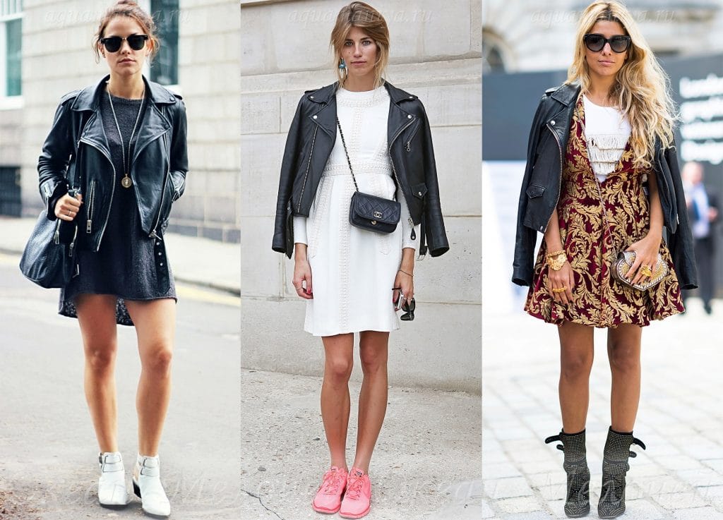 Fashionistas easily combine a leather jacket with any kind of dress, from straight to airy dresses with flounces.