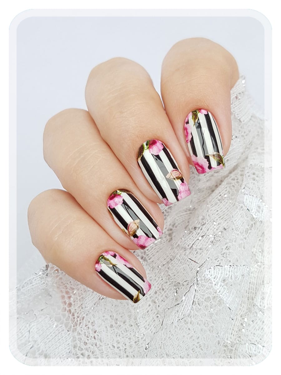 - After we apply the coating and draw strips with acrylic, we either glue the stickers and fix with a layer of varnish or gel.