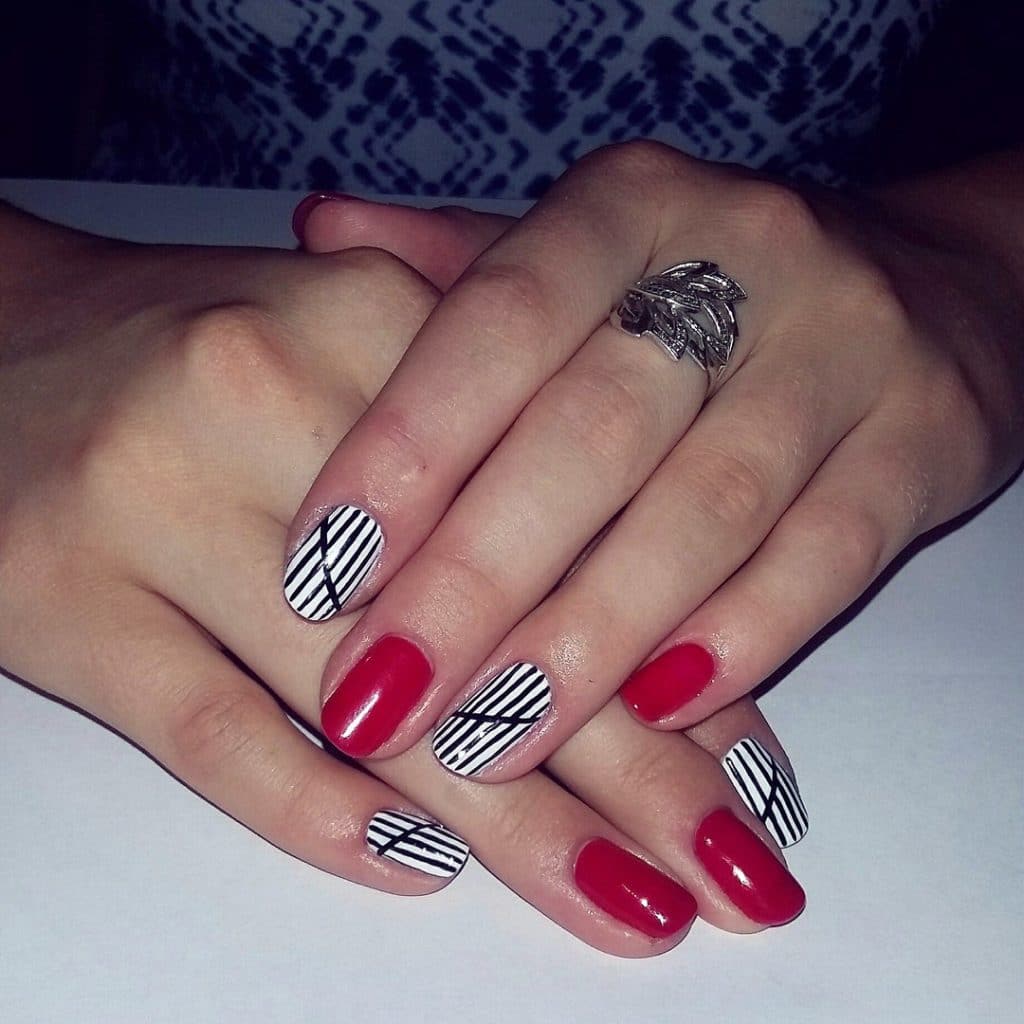 For more idle exits, the masters make even stripes on the nails of the ring fingers, while others cover with bright varnish. Clothes for this type of striped manicure should be selected in a single color - red, black or white.
