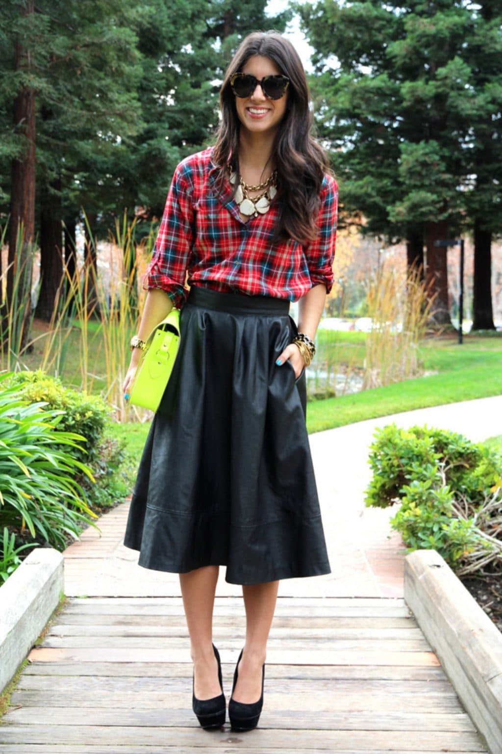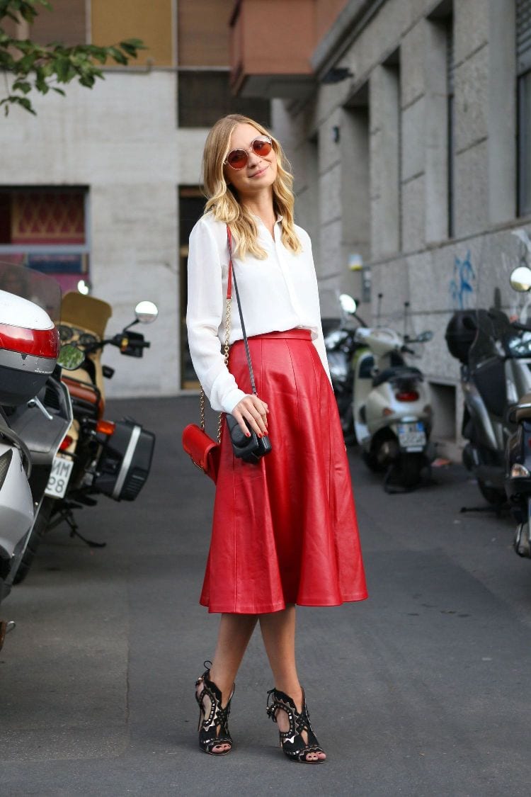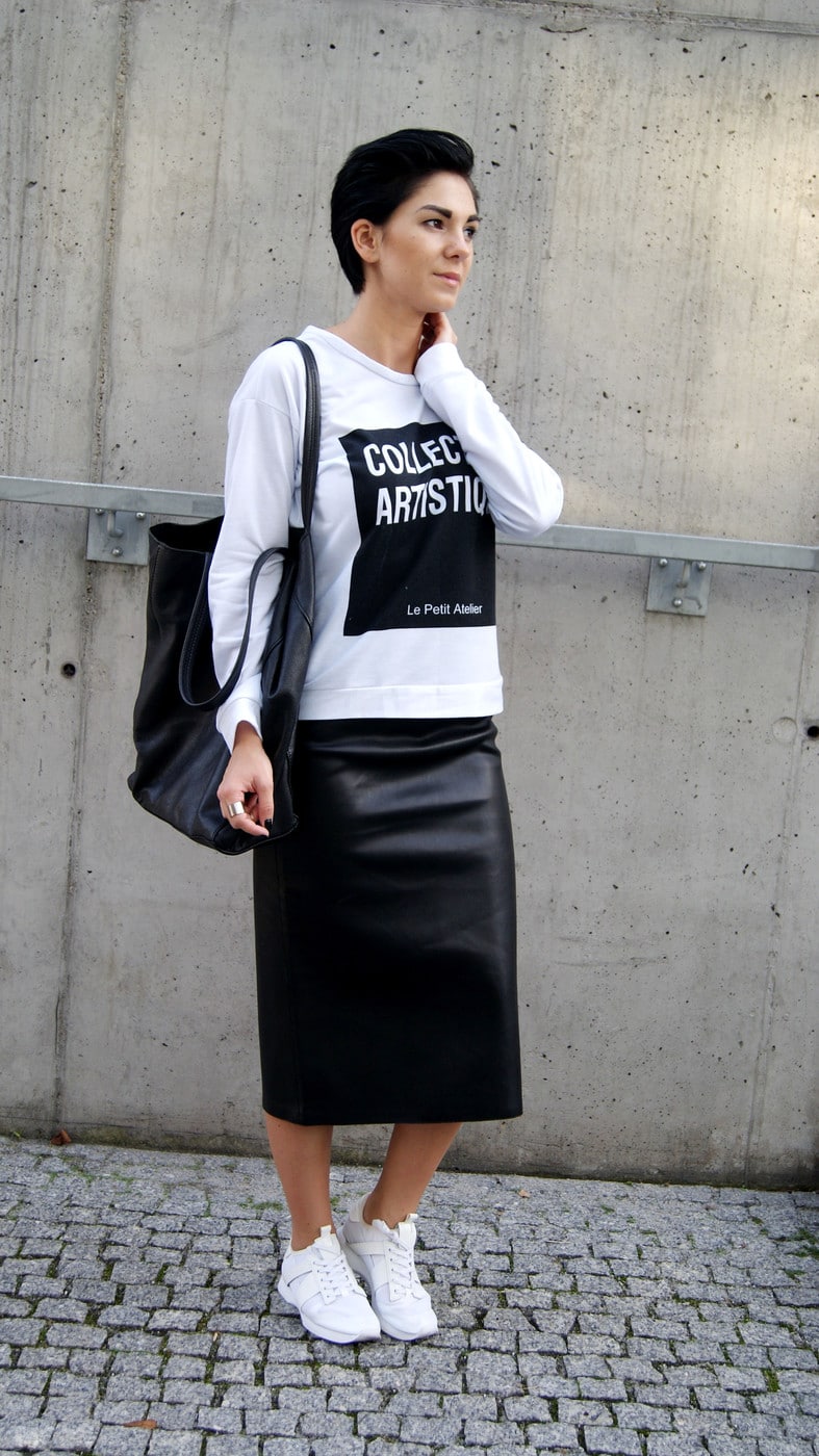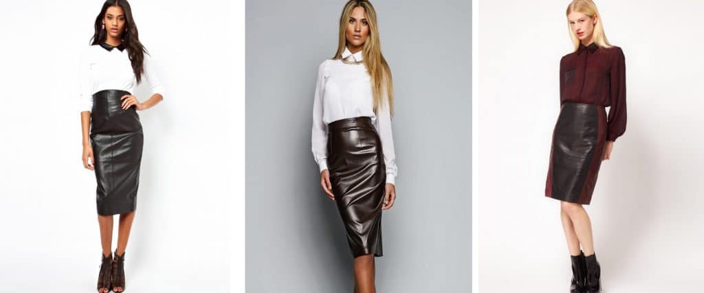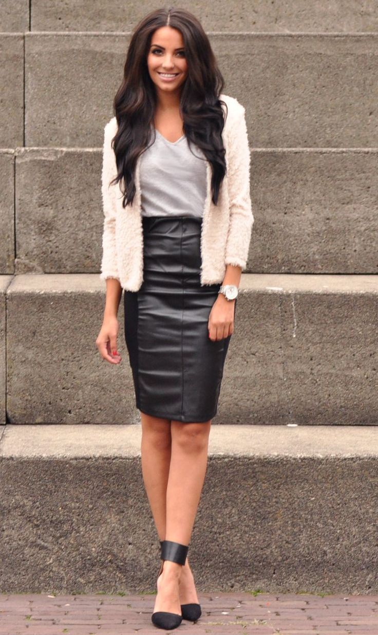 A leather skirt with a white shirt is the perfect combination for office work. In this form, you will be the embodiment of rigor and sexuality, especially if the skirt will fit the figure. In this form, you can also go on a date or an event if you choose a more delicate and flowing style of a blouse.