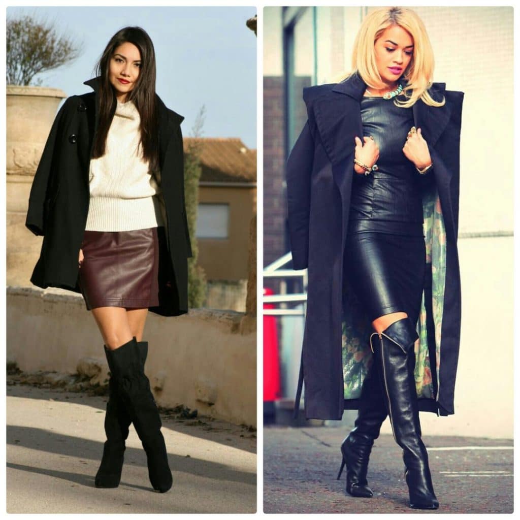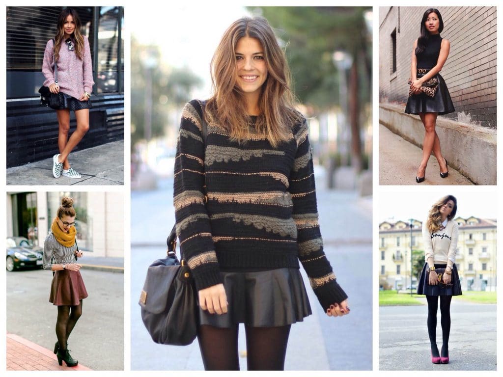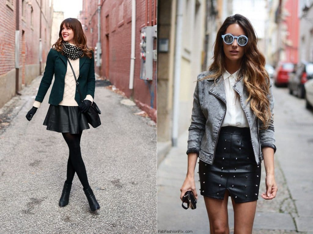 In the cold season, you can also continue to wear a leather skirt. Combine the main thing with warm, dense tights and boots. A mini skirt with over-boots and a warm voluminous sweater will look especially interesting. In such a warm and comfortable outfit, you definitely do not freeze.