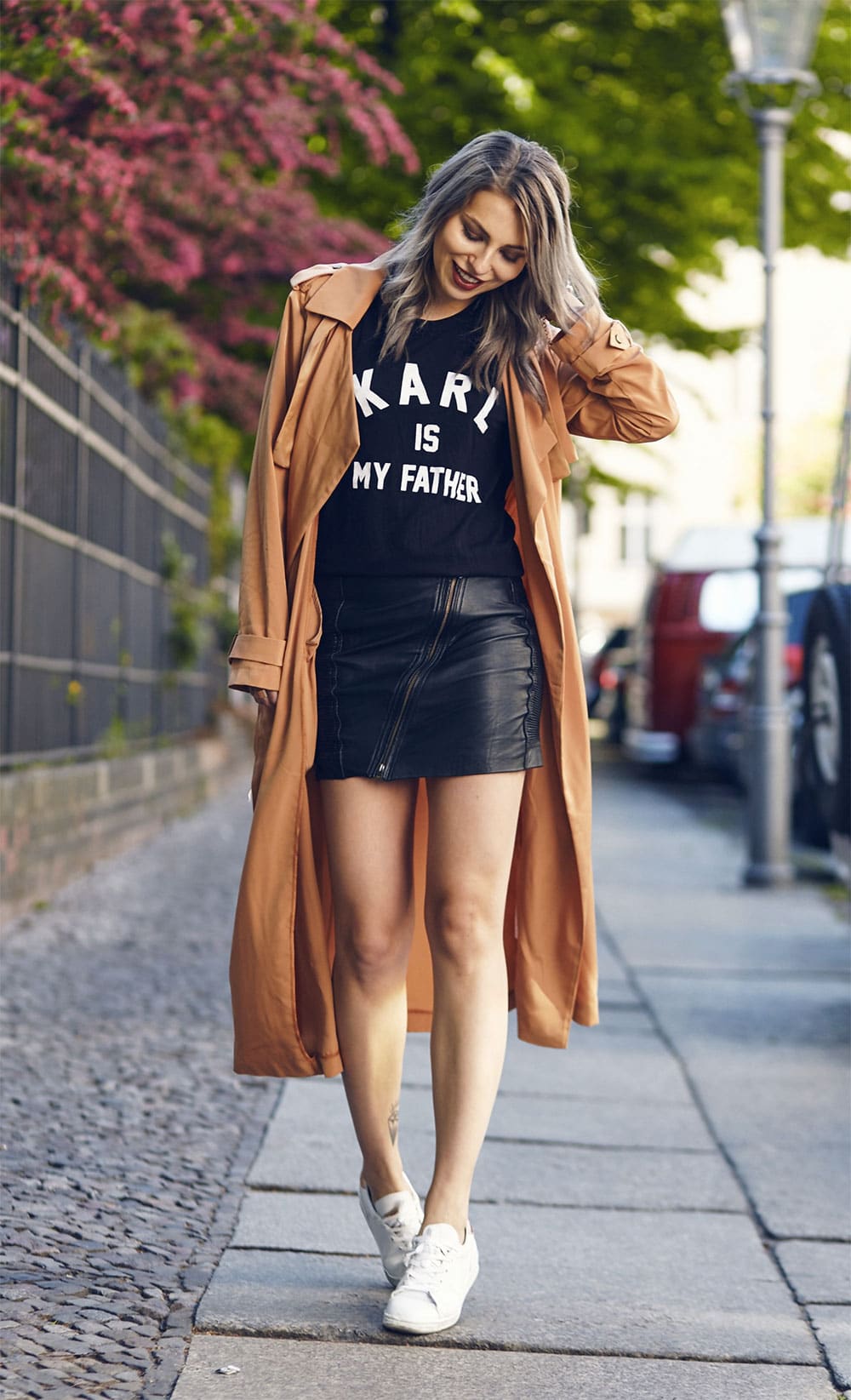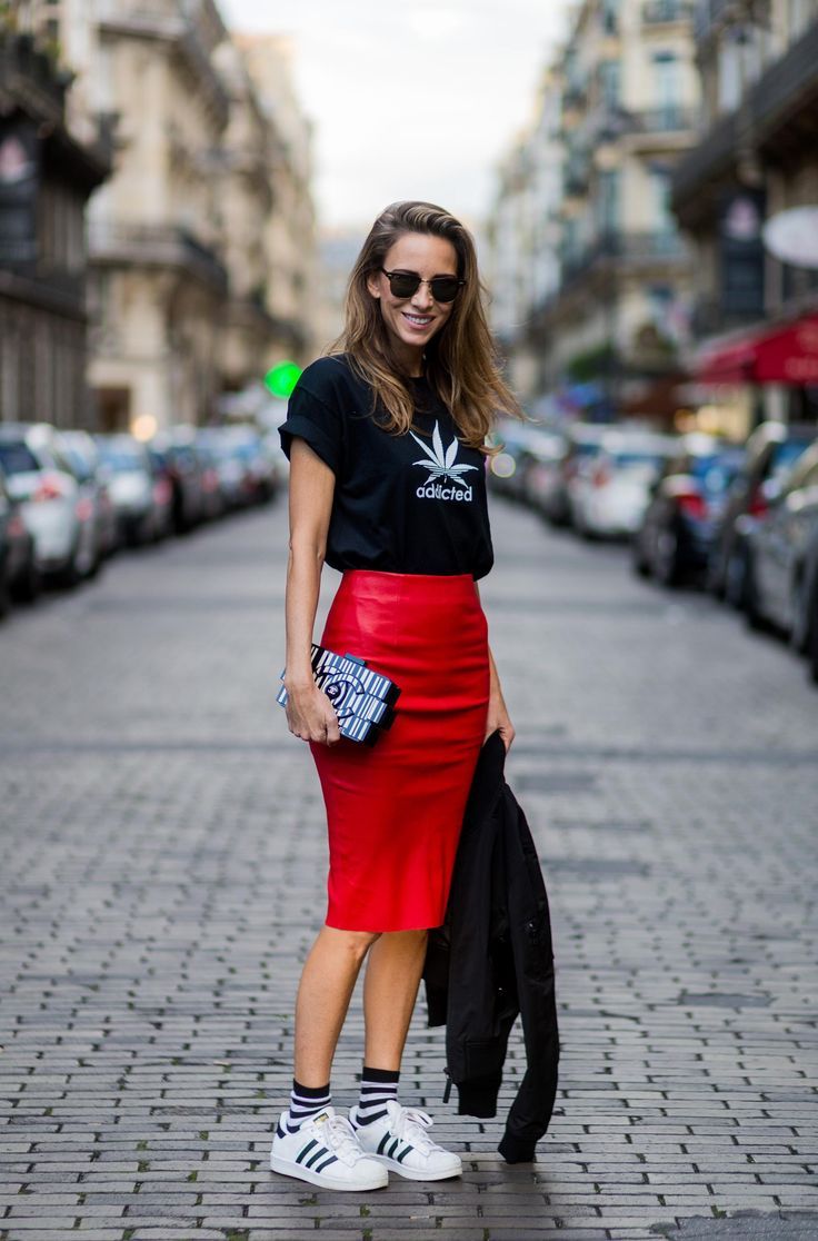 A leather skirt goes well with any t-shirt or sweaters. Here the variation of the skirt models may be different. But in this case, the shoes are chosen low speed, whether it be sneakers, sneakers, loafers or boots.