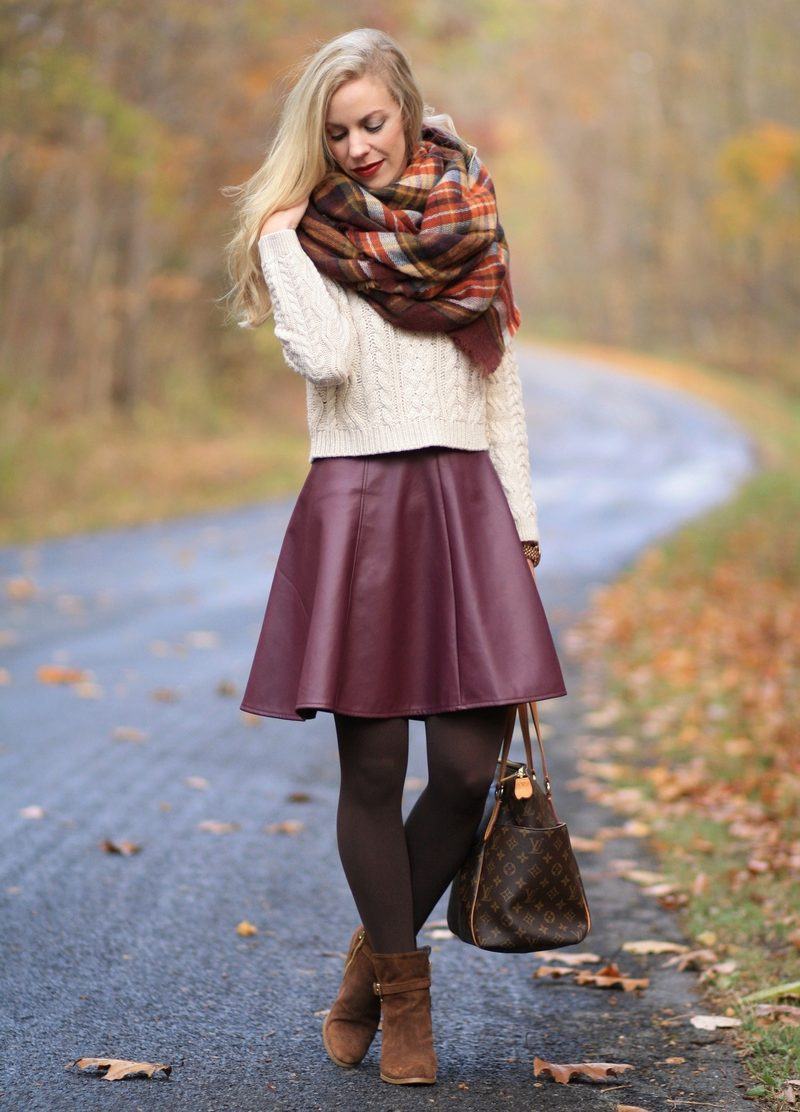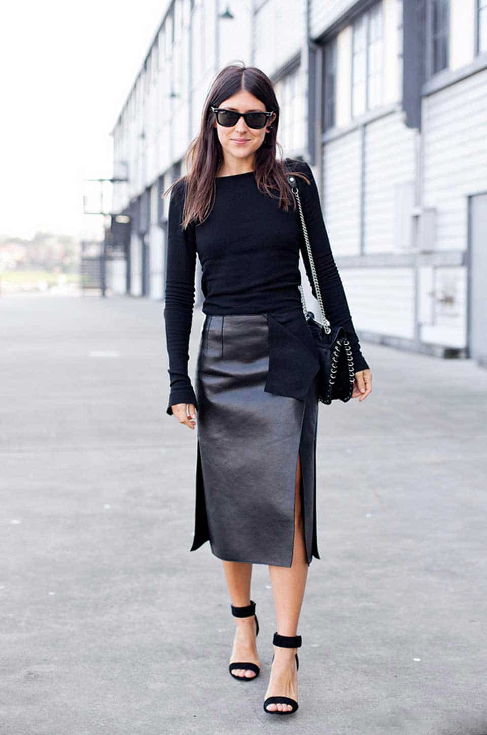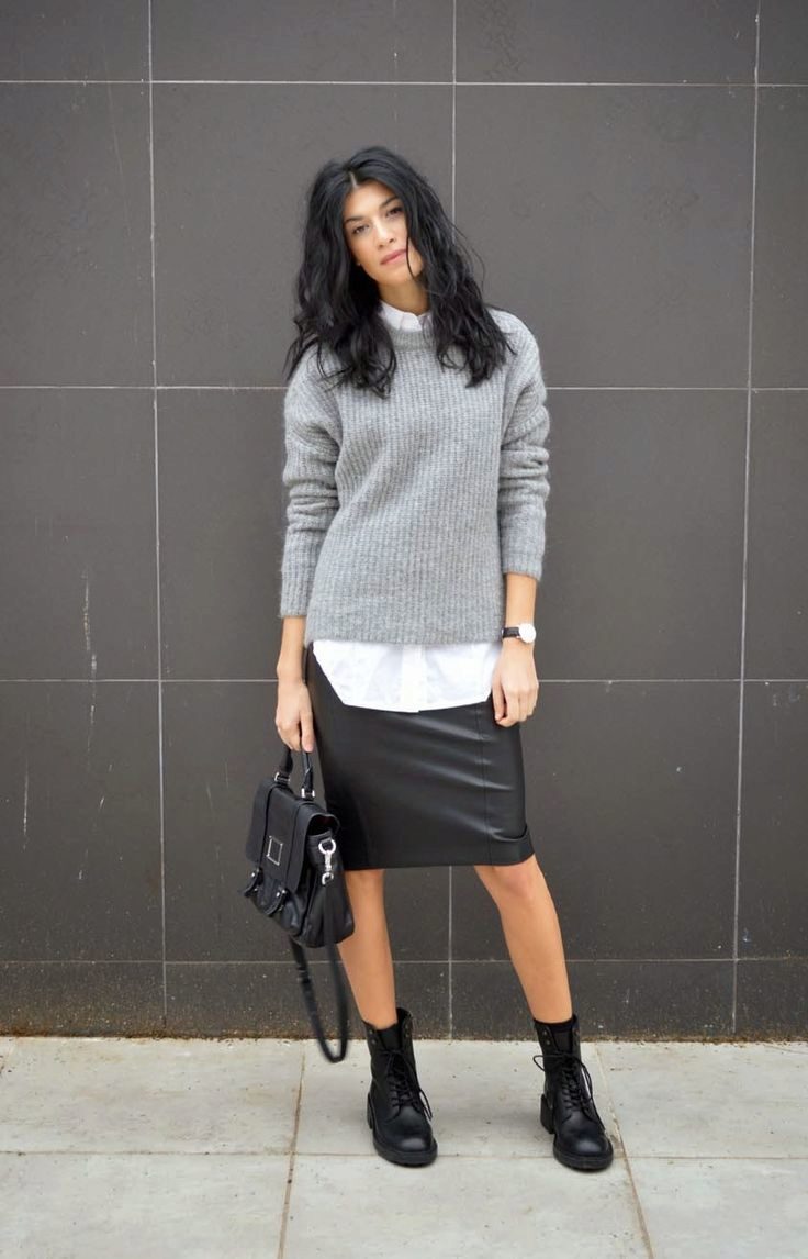A leather skirt can be easily worn for work, the main thing is to choose the right length. Of course, such a skirt is often worn with blouses or shirts, but when basic sweaters always come to the rescue outside the cold window.