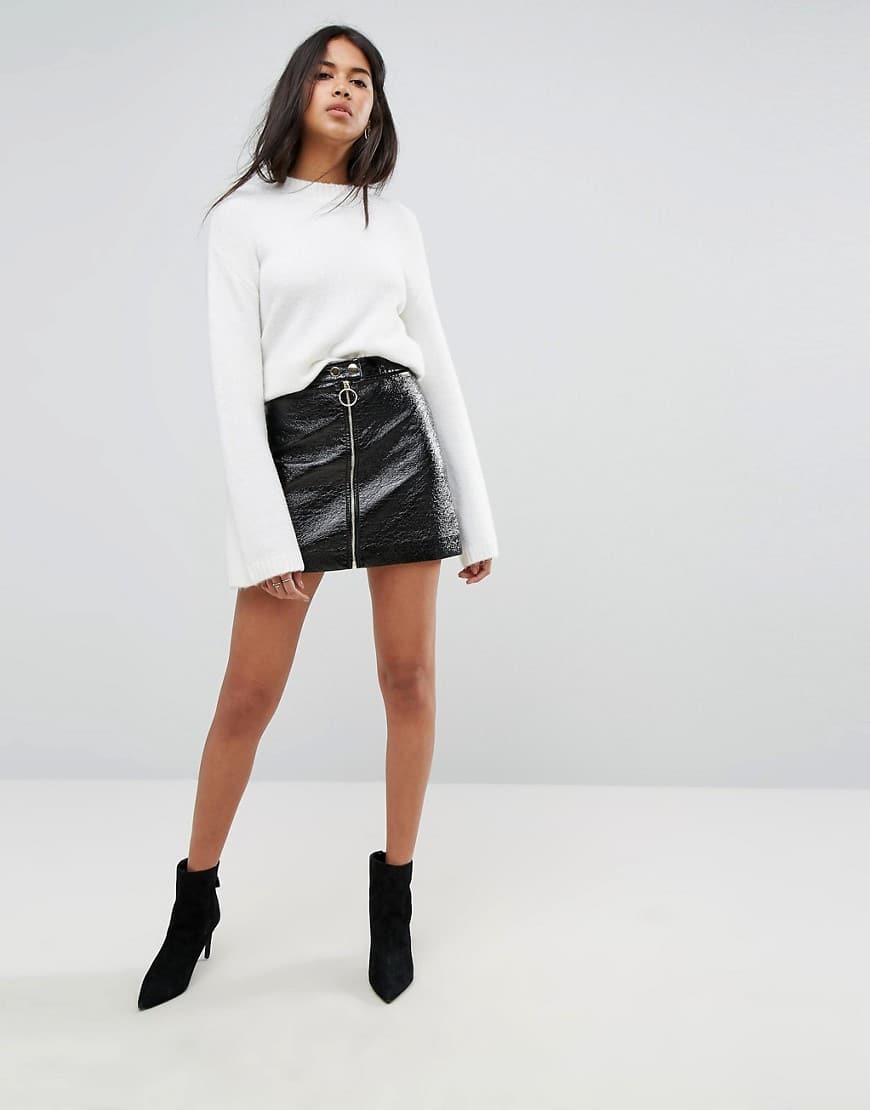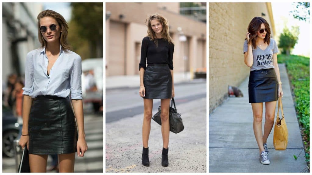 Mini leather skirts are chosen by confident girls seeking to show perfectly even and long legs. You can complete it with many things. It can be a top in linen style, a turtleneck that emphasizes the charm of a female figure, a voluminous sweater, a chiffon blouse.