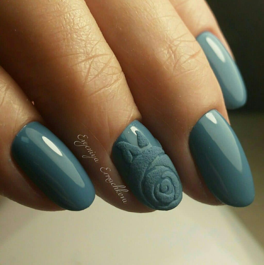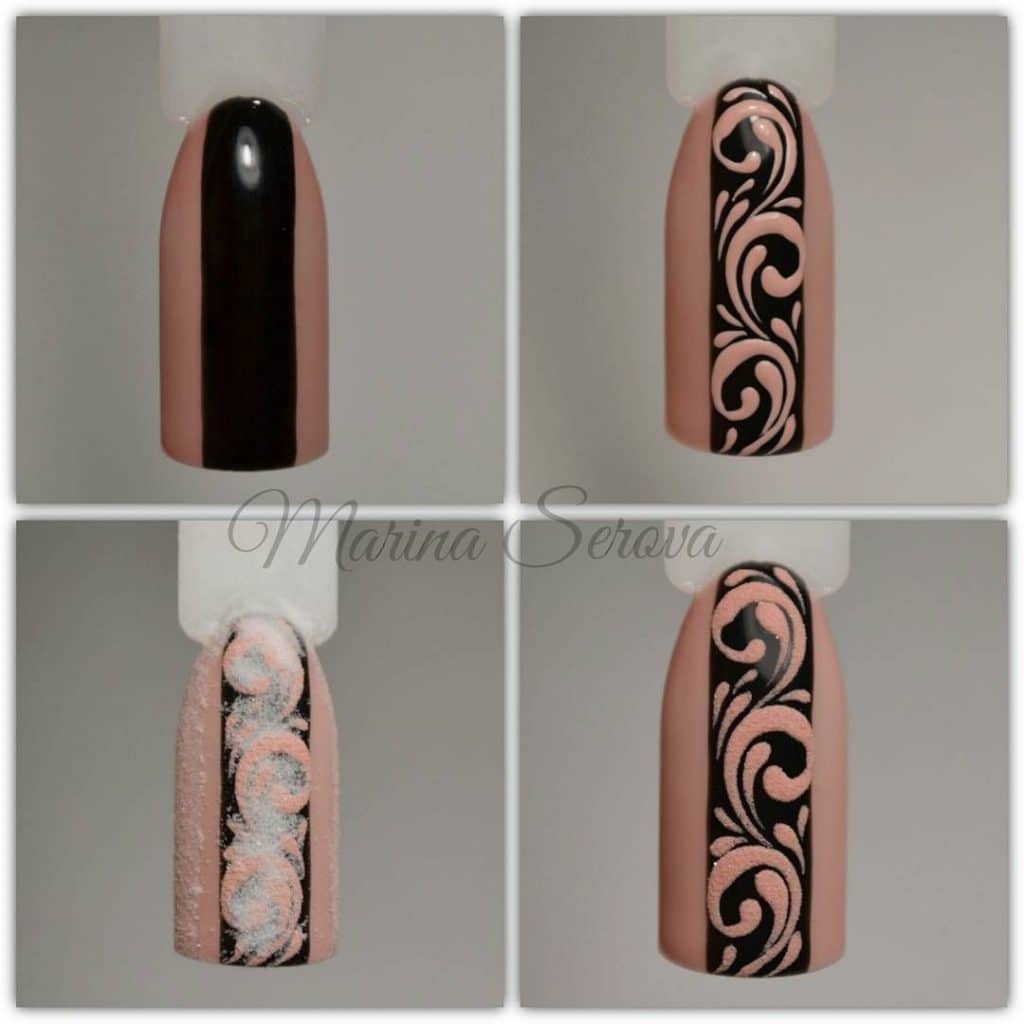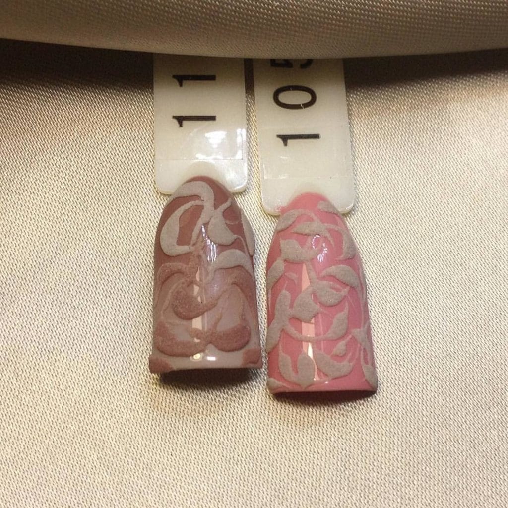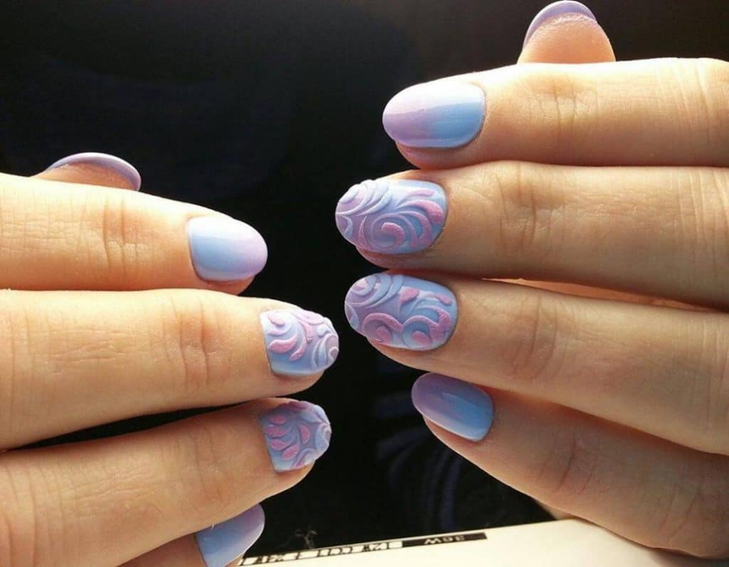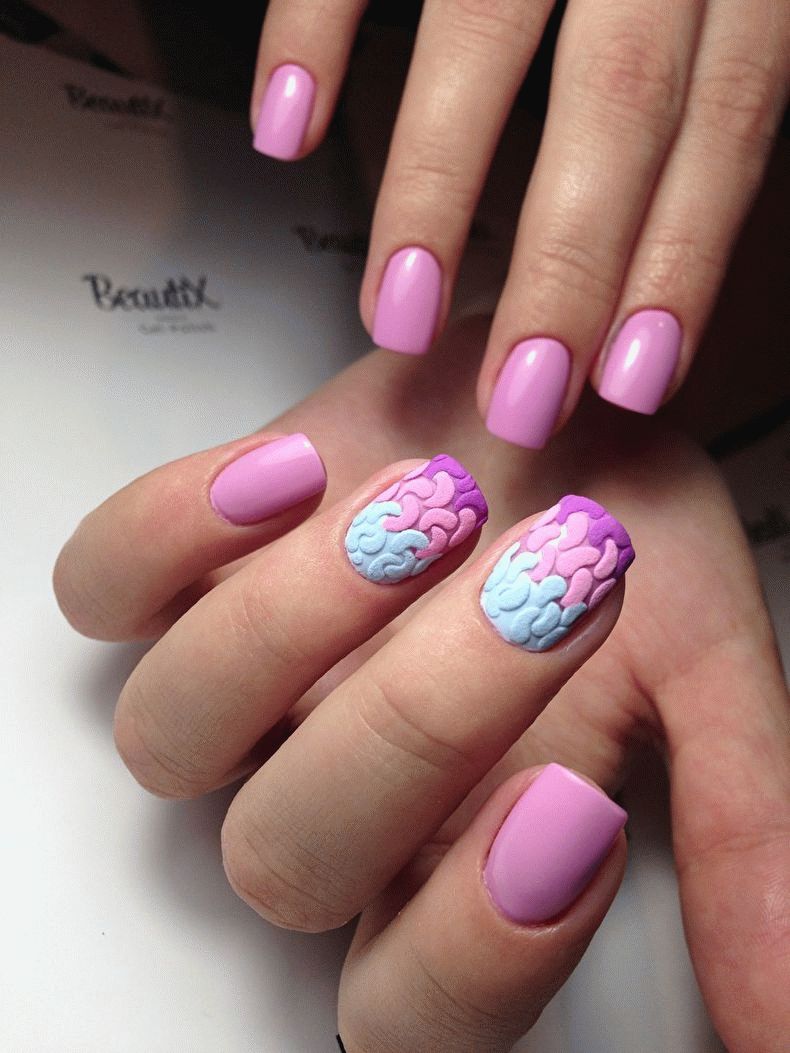 A manicure with acrylic powder can be attributed to 3d designs in view of the fact that with the help of powder a three-dimensional pattern is created.