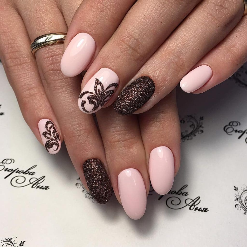 Another option for manicure with acrylic powder are volumetric monograms. This manicure looks very impressive. Moreover, the powder can be of any shade, both complementing and slightly refreshing the manicure.