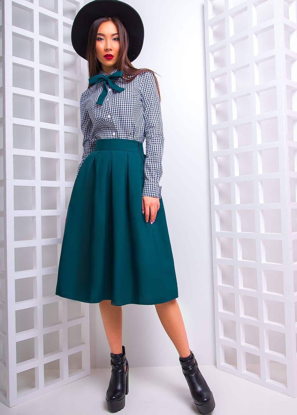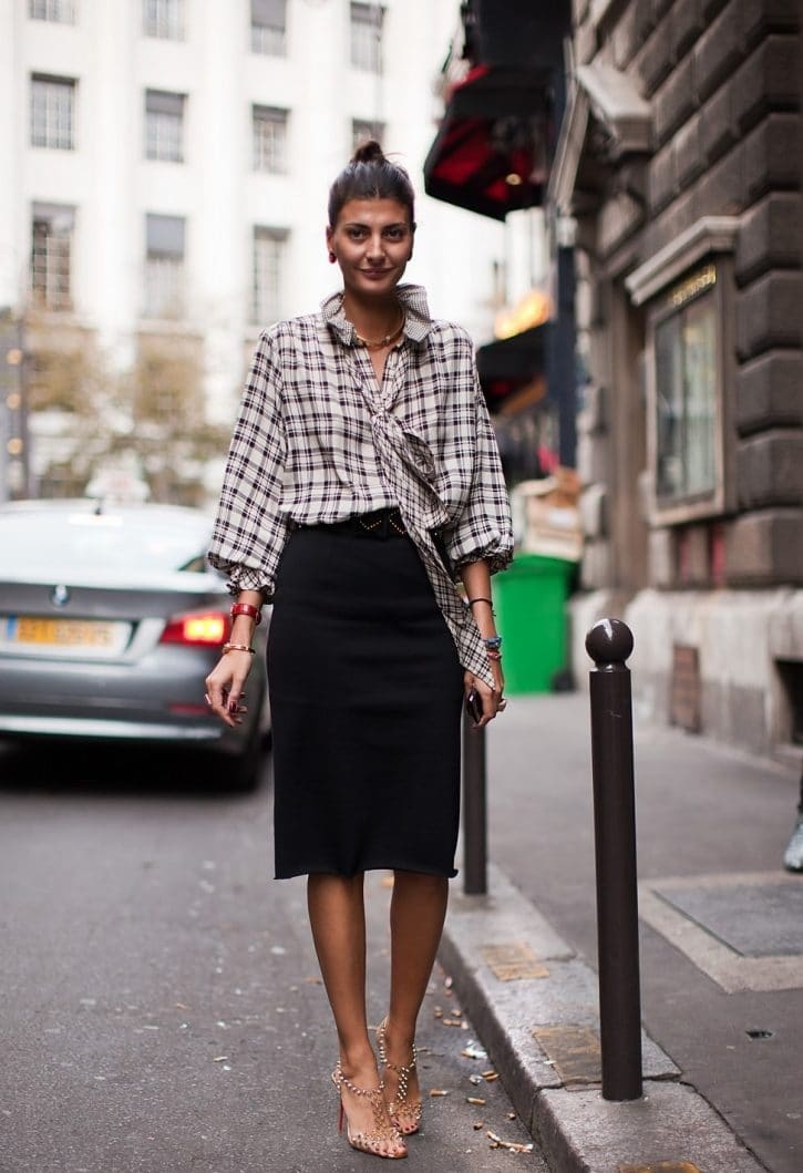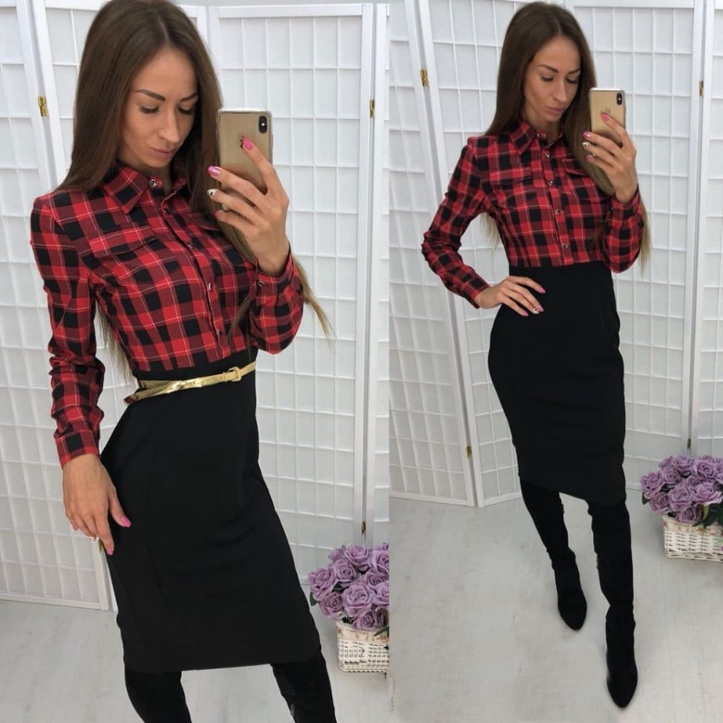 Choosing a plaid shirt for a work outfit is more likely to work with a loose dress code. For work with a plaid shirt, it is better to combine plain skirts, a pencil skirt will be perfect. As shoes fit classic pumps or ballet shoes.