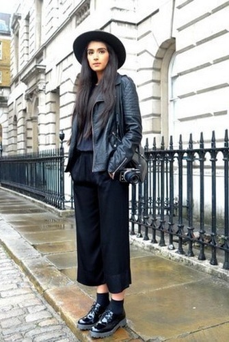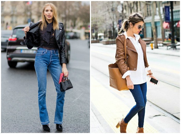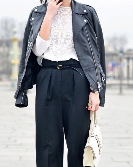Yes, this is not a mistake, namely trousers, not jeans (of course, no one canceled them either, but more on that later). With a biker jacket, wide pants will look best. For the most daring, it is proposed to choose the original colors of the trousers. If you need a more austere look, then simply complement it with a shirt.
