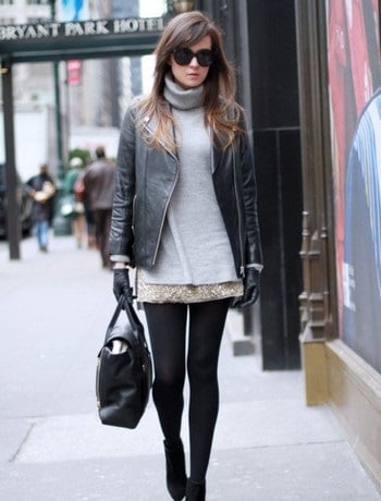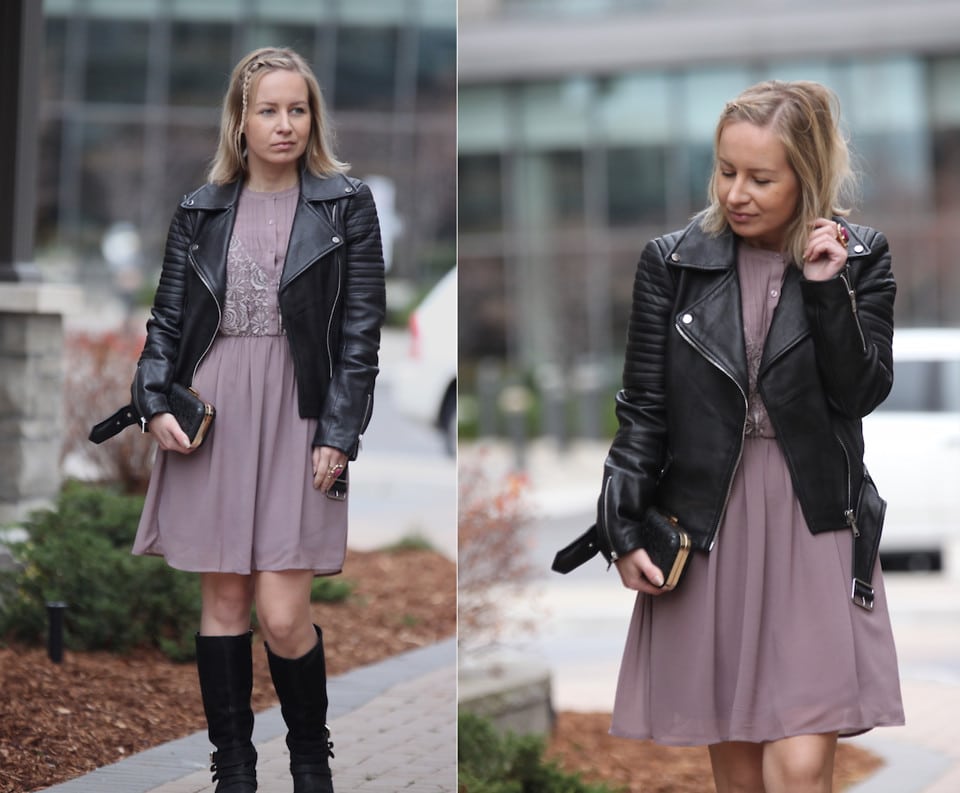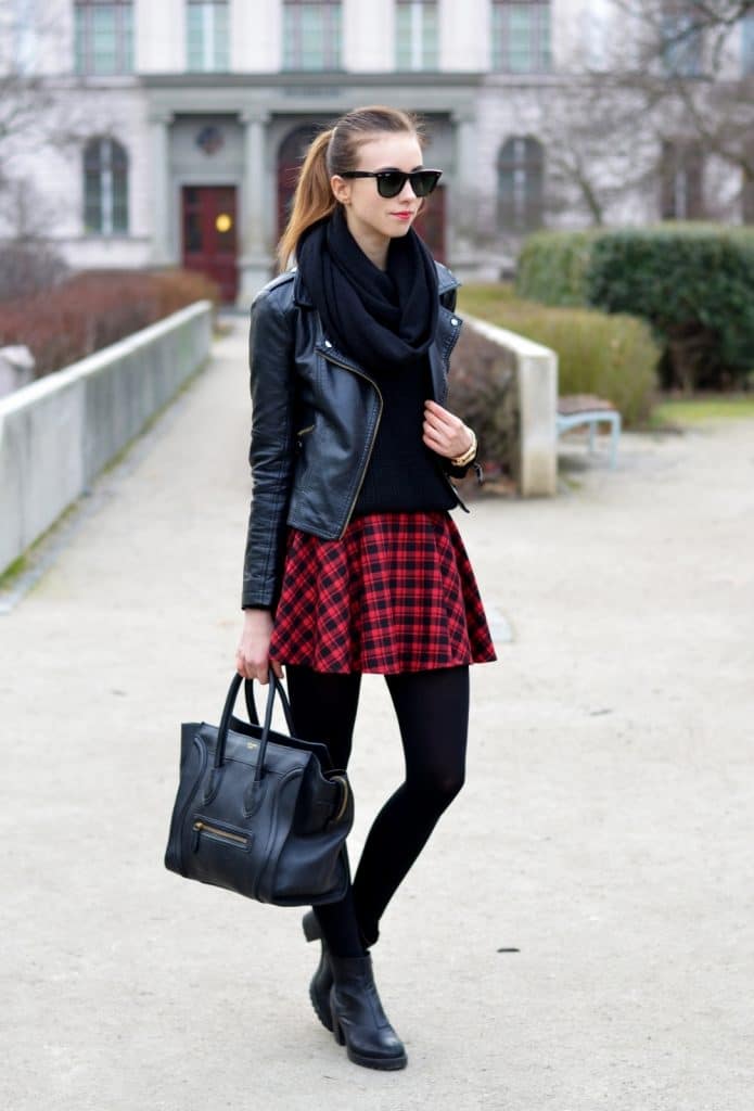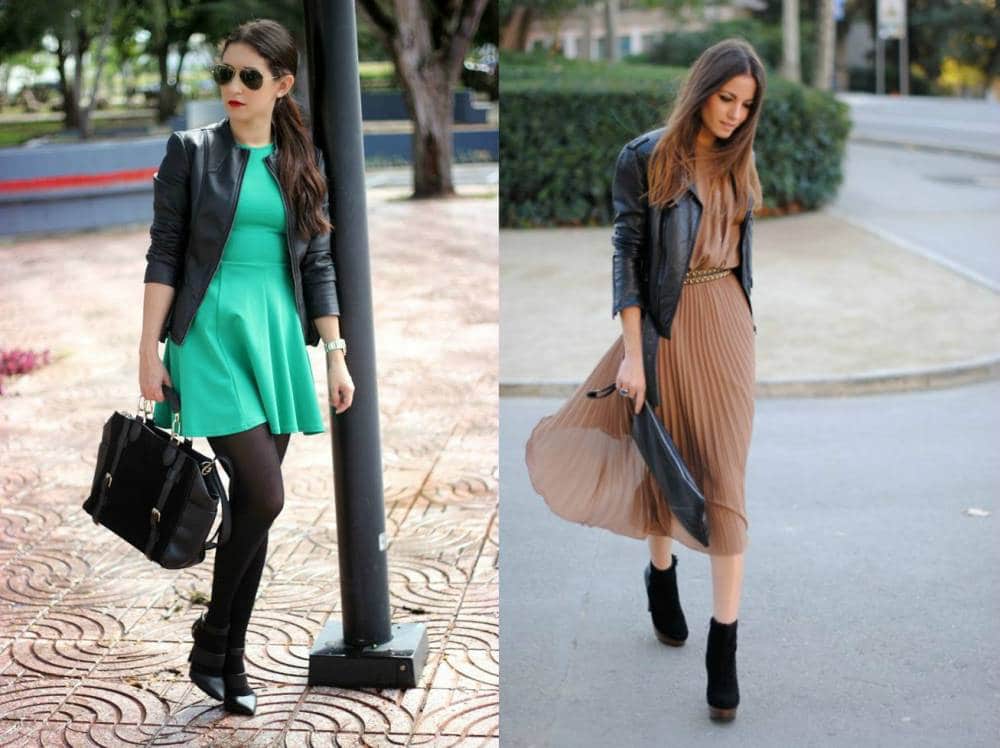 Biker jacket will look good with a long dress on the floor. In cool weather, this could very well be a knitted dress. Also, flared dress looks cute and original just below the knees or mid-thigh, complete with a leather jacket.