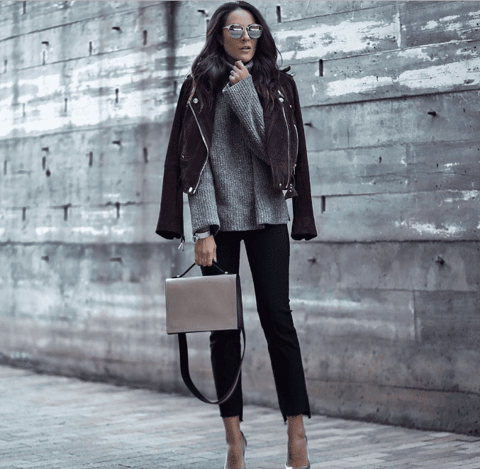 This combination will add romanticism to the image. Large knit with a high neck as if created for this jacket. Such an image is hardly suitable for a business lunch, but for a romantic walk on a cool morning this is ideal.