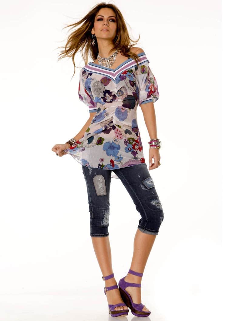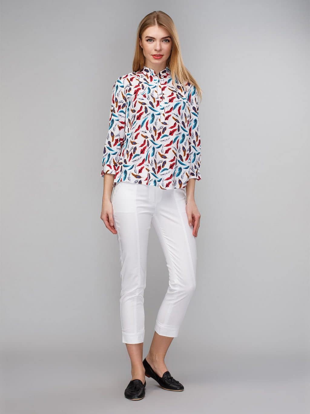 Floral prints shirts, harmoniously are combined from white breeches. And withshoes under such top can to experiment.