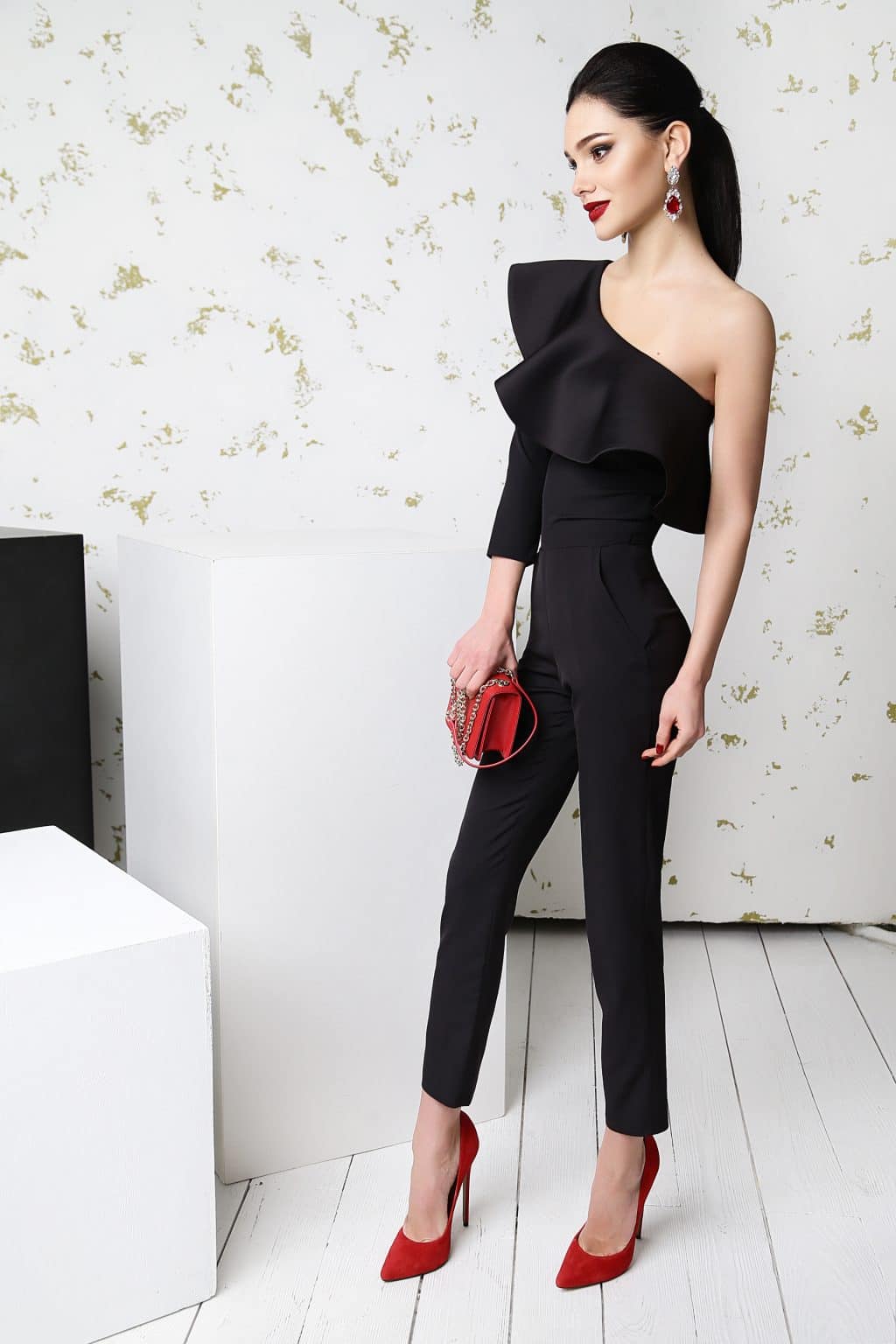 A black jumpsuit can be worn as an independent image for a special occasion. Just imagine how strictly and tastefully you will look!