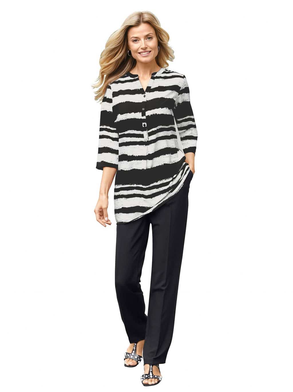 Under long blouses, stylists advise put on narrow jeans or pants. So, as itself blouse It has more air form.