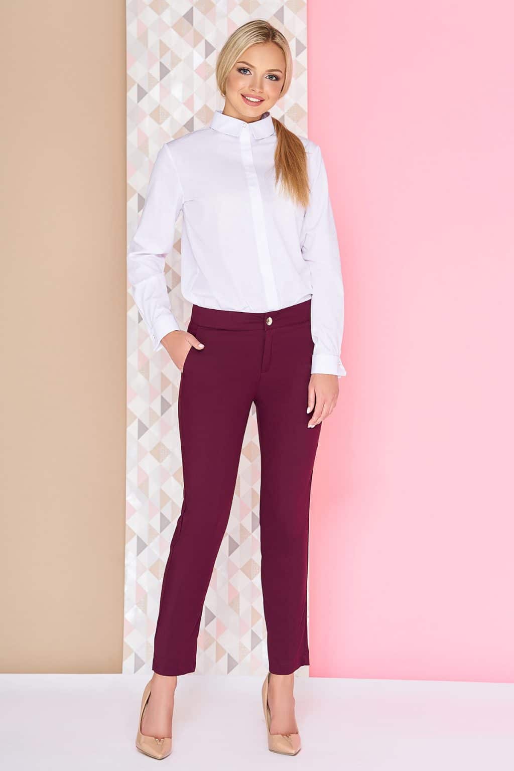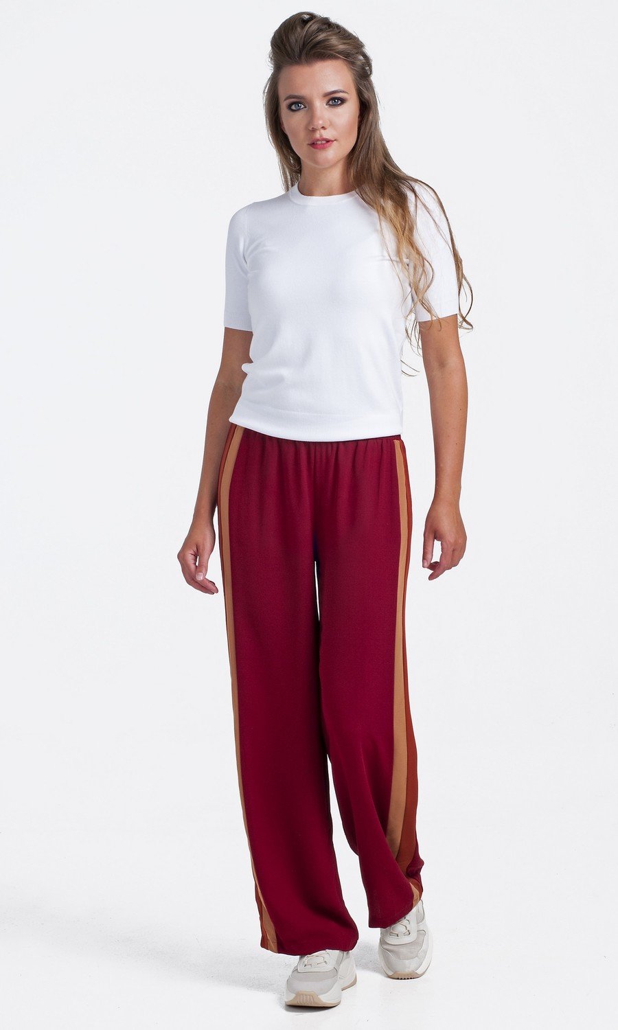 Some models of pants with stripes are narrower than others. Such trousers in burgundy color are well suited for office bow. One only needs to add to them a stylish blouse in tone, or in a universal color.