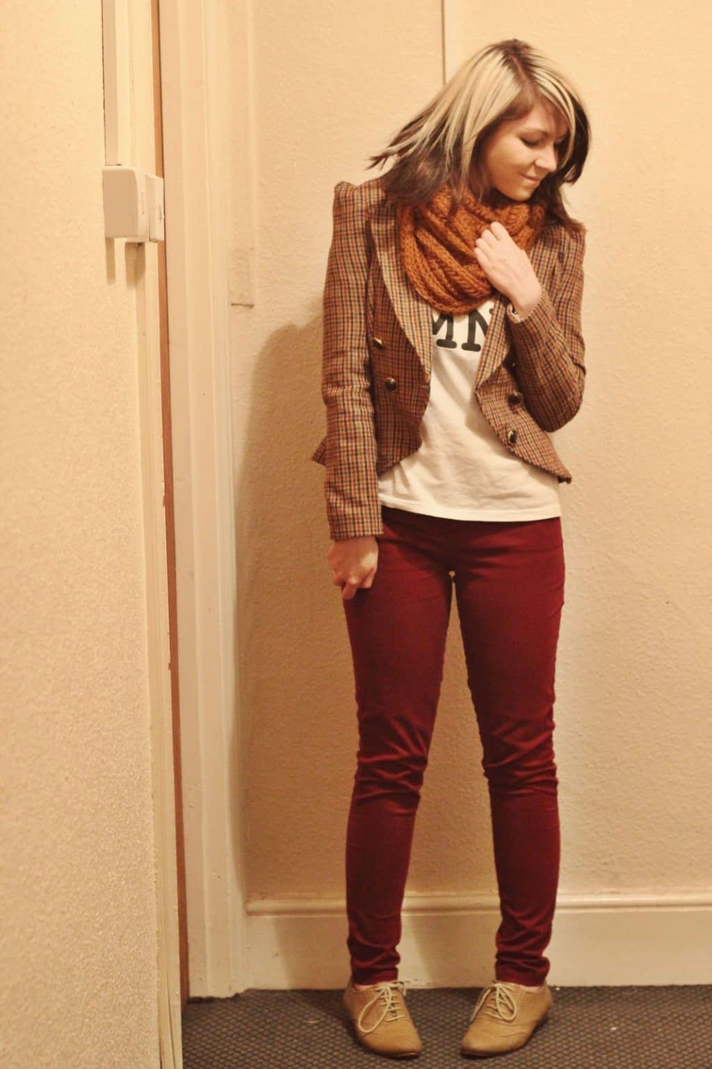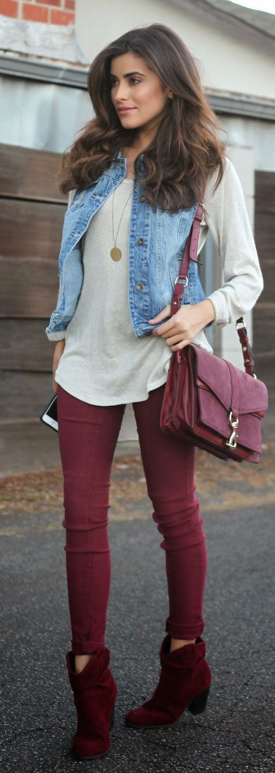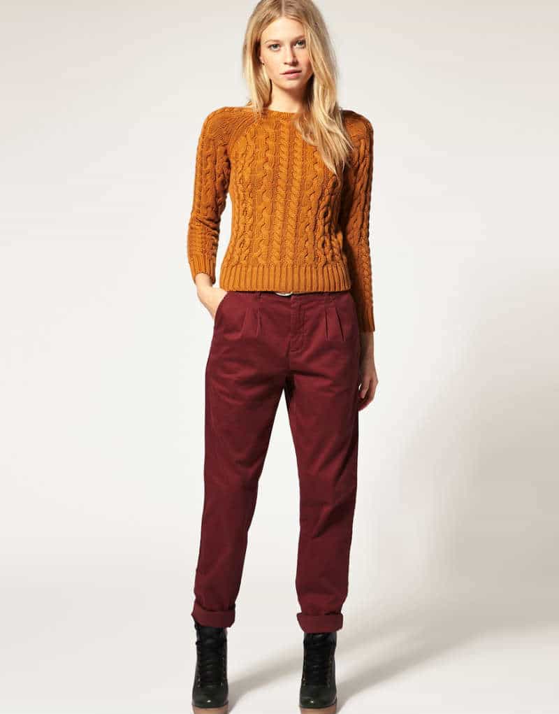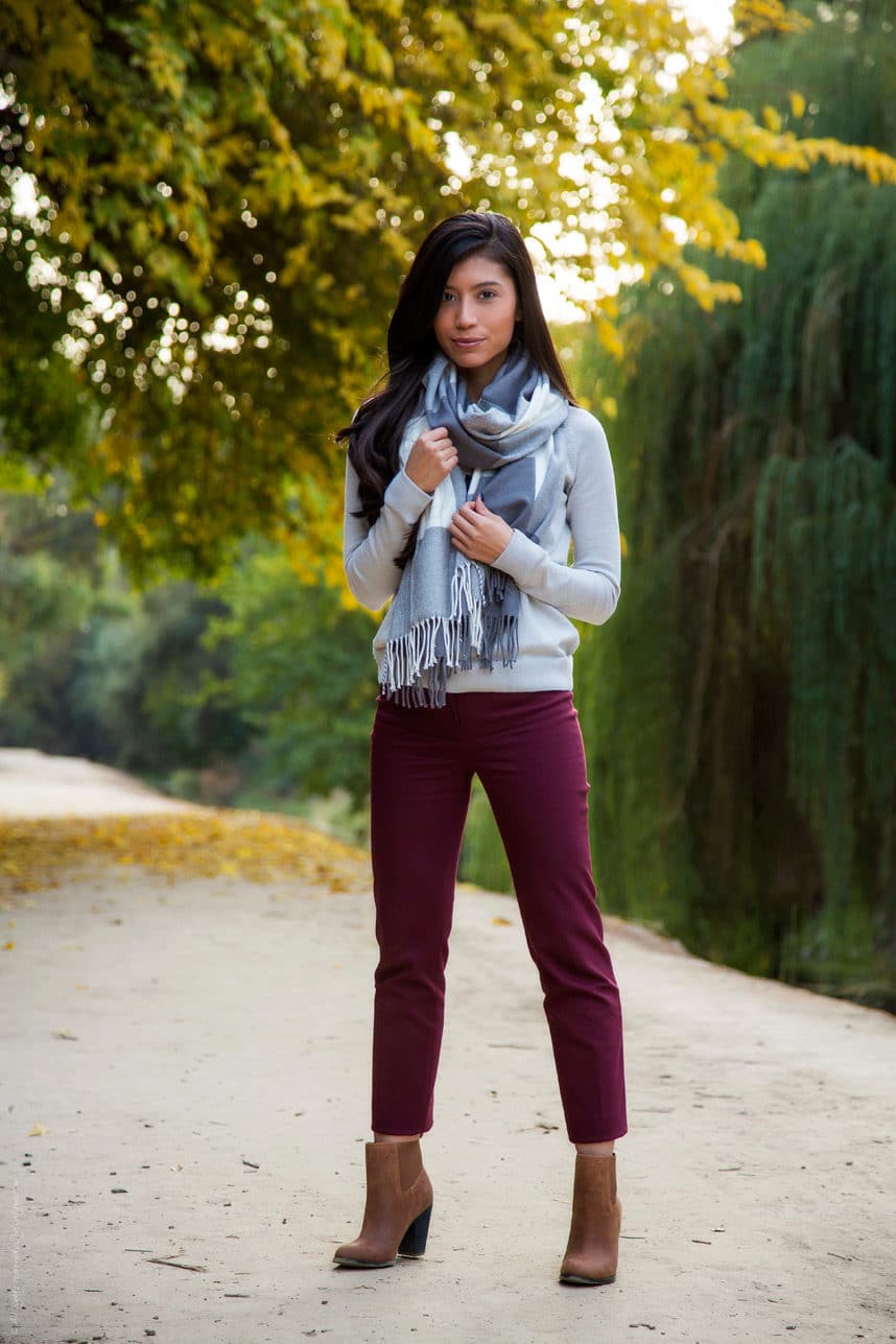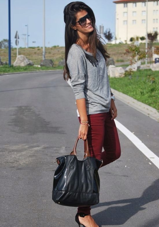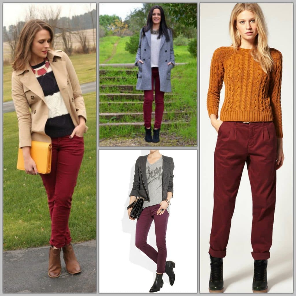 You can combine warmer sweaters with burgundy trousers, using scarves with them.