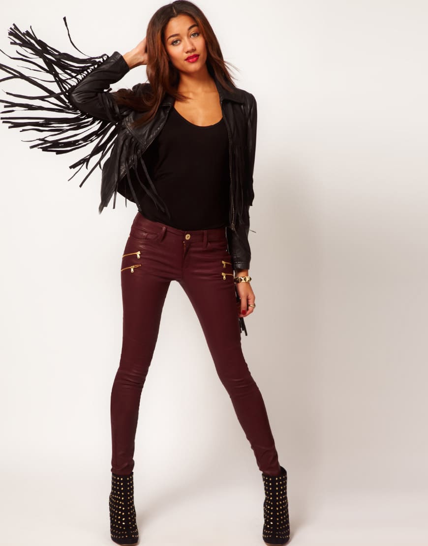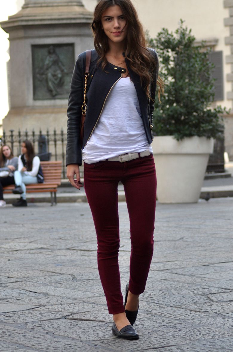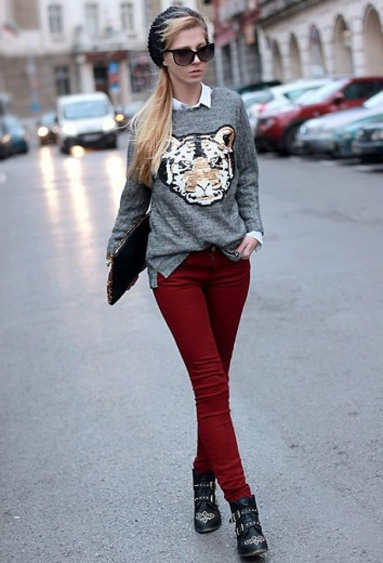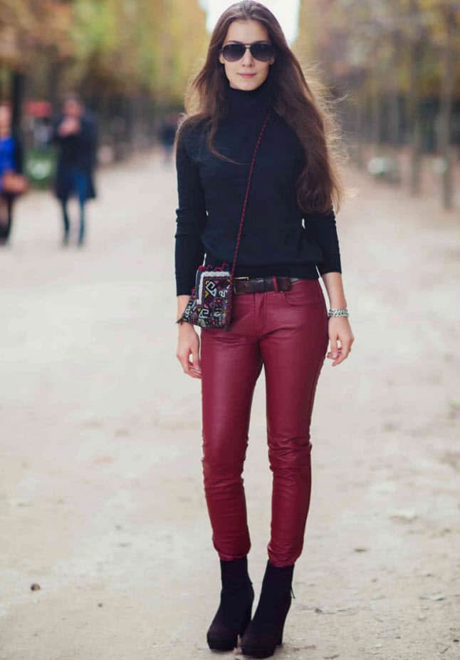 Skinny trousers in burgundy are beneficial to combine with sweaters in a catchy color scheme.