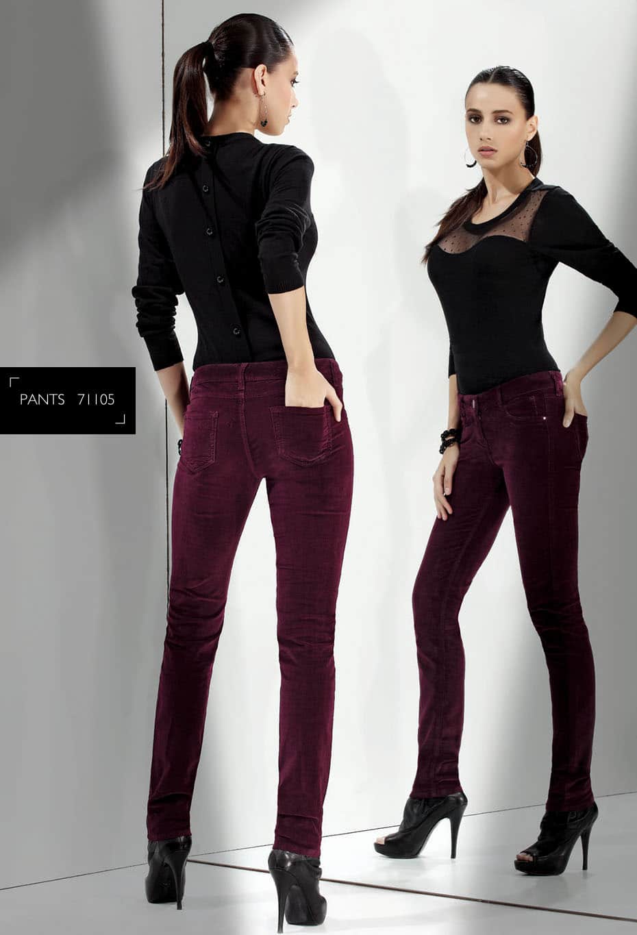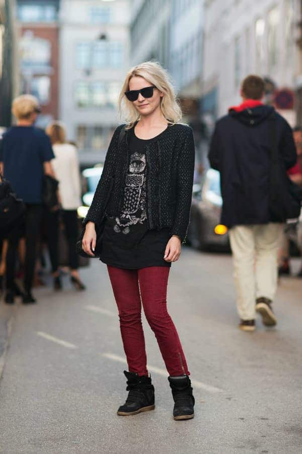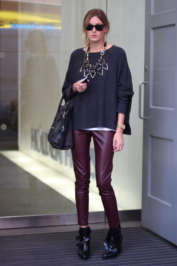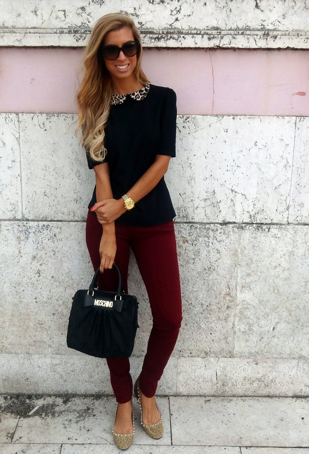 Skinny trousers in burgundy are beneficial to combine with sweaters in a catchy color scheme.