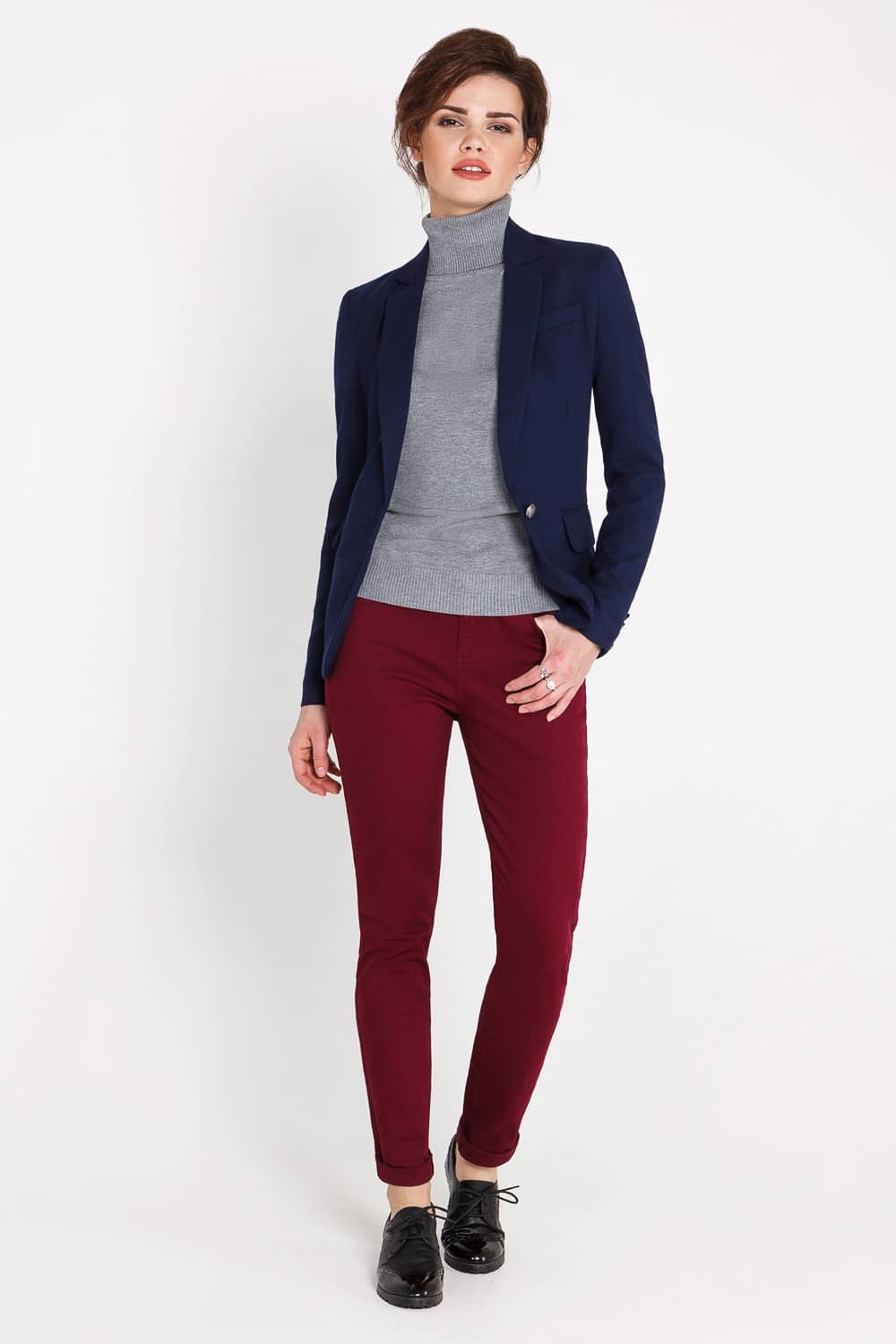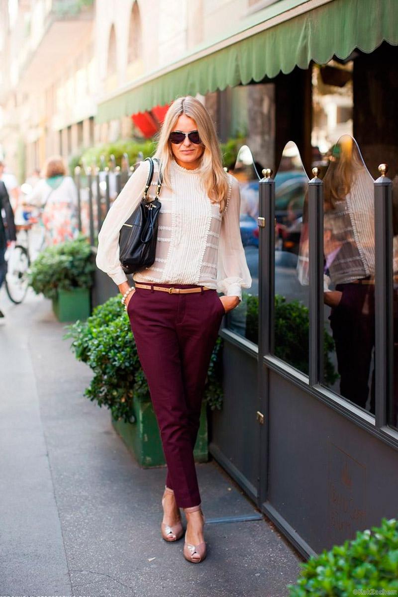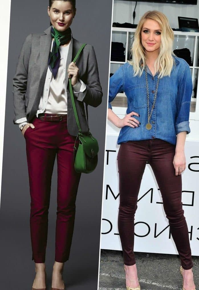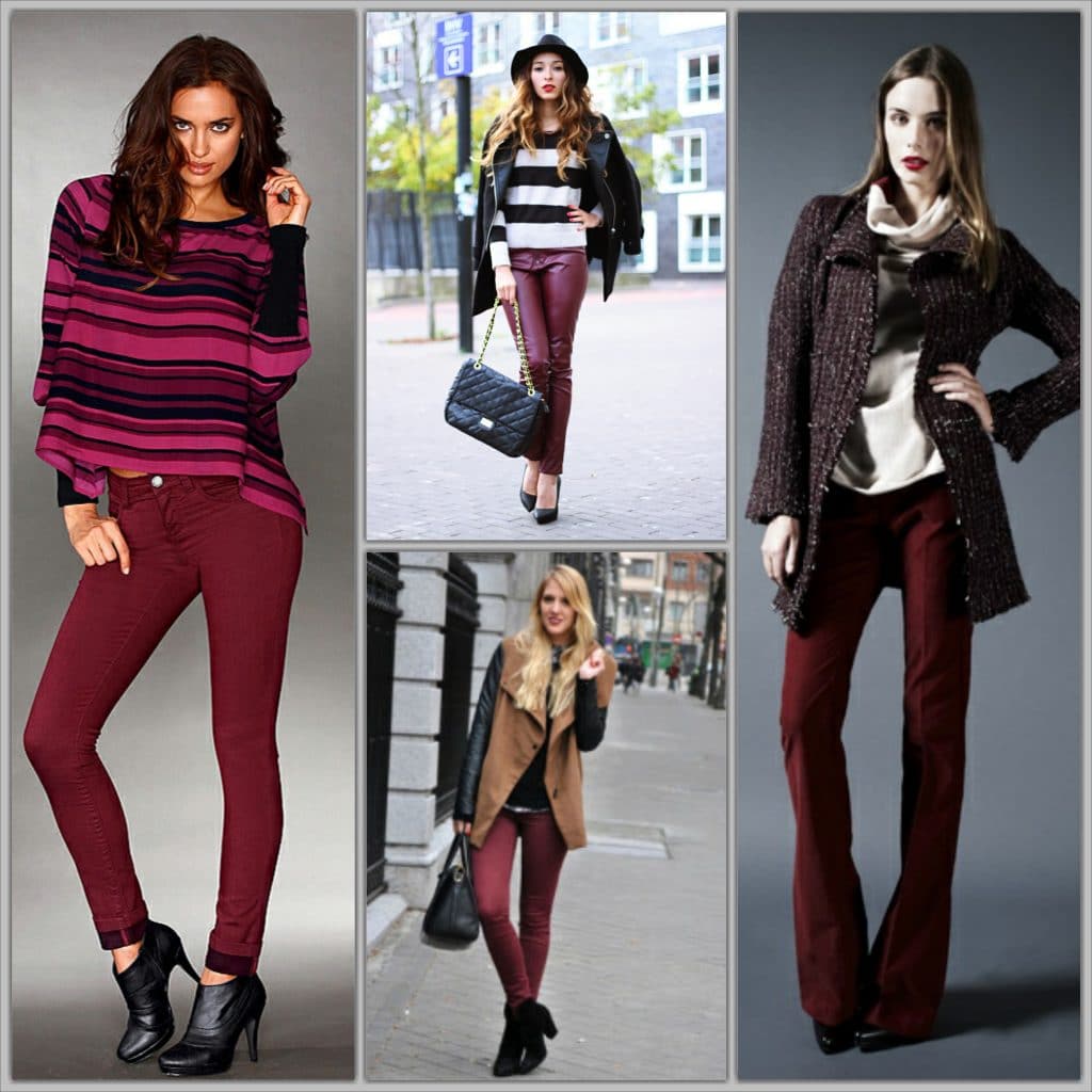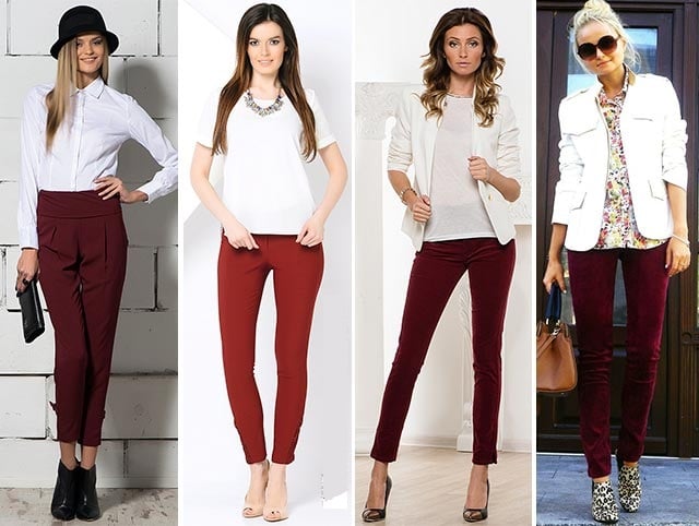 When choosing a burgundy color for trousers, be prepared for the fact that you will inevitably attract a lot of attention. Therefore, your image should be worked out to the smallest detail.