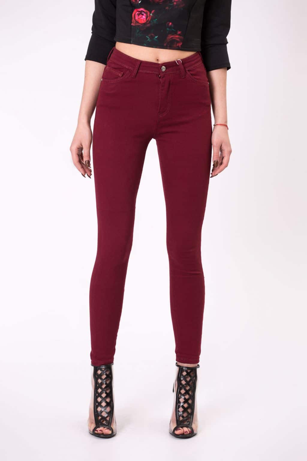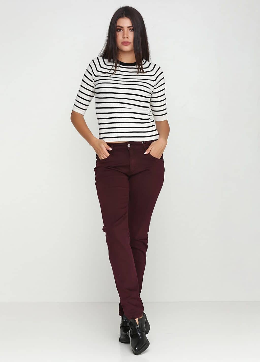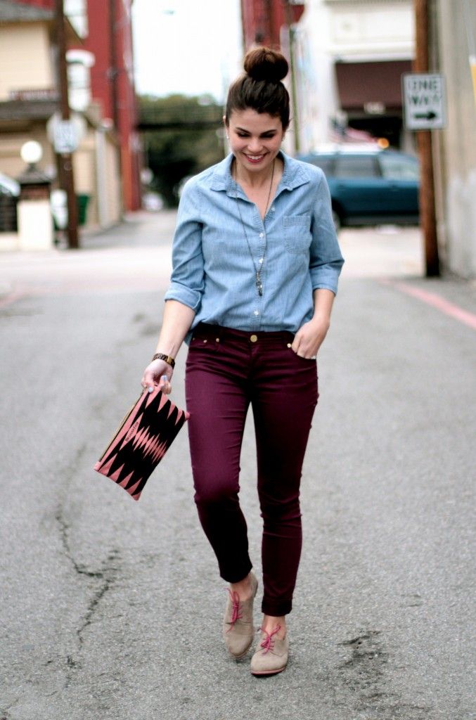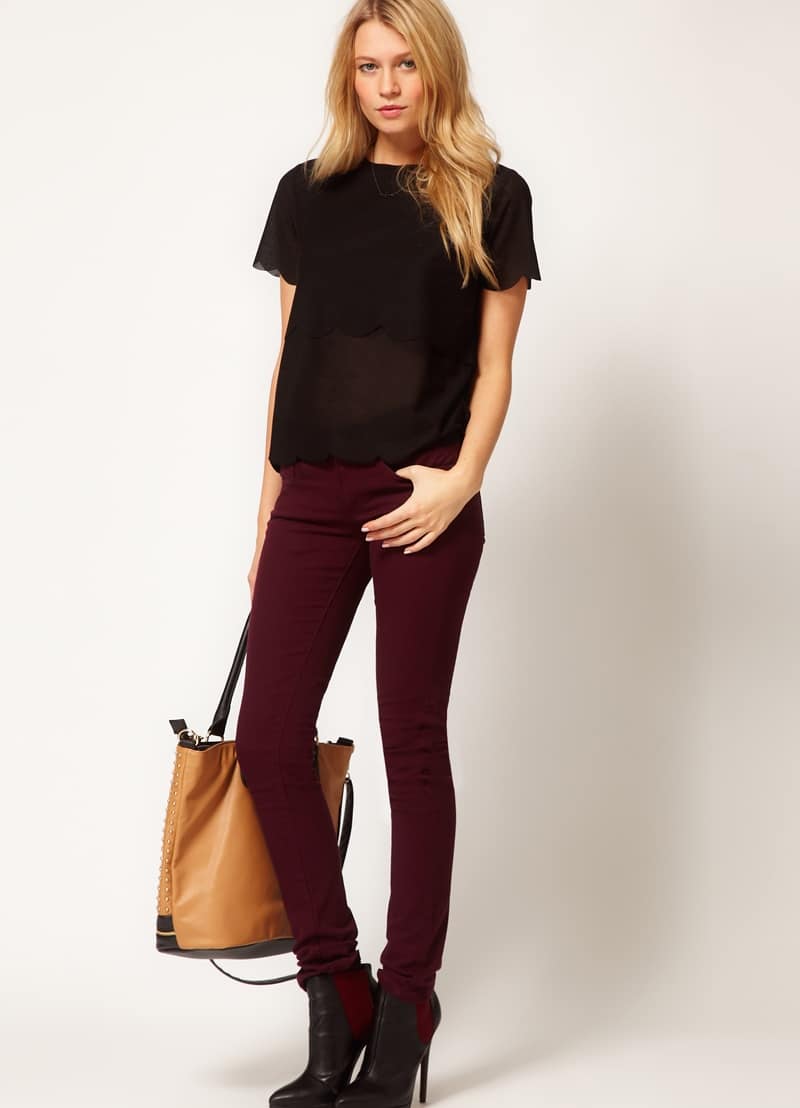 Jeans in burgundy will look unusual. After all, we are all used to seeing them in traditional blue