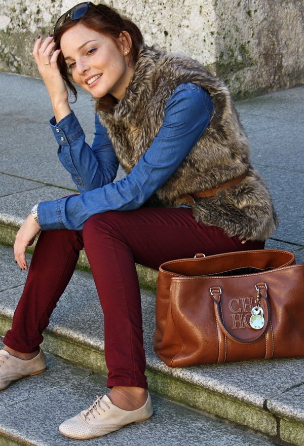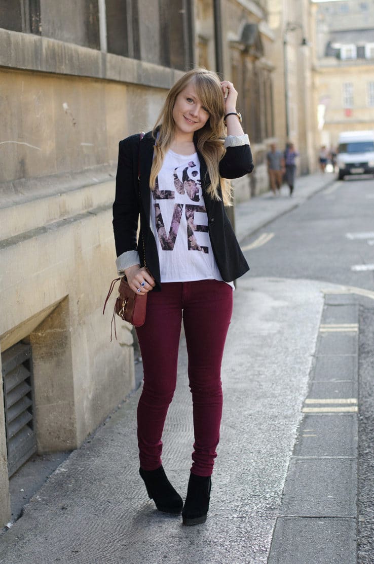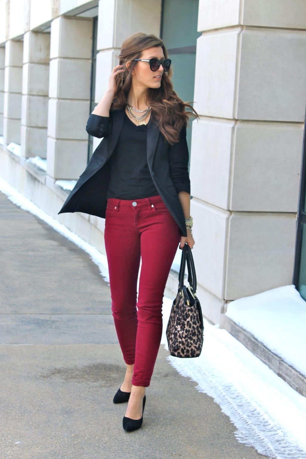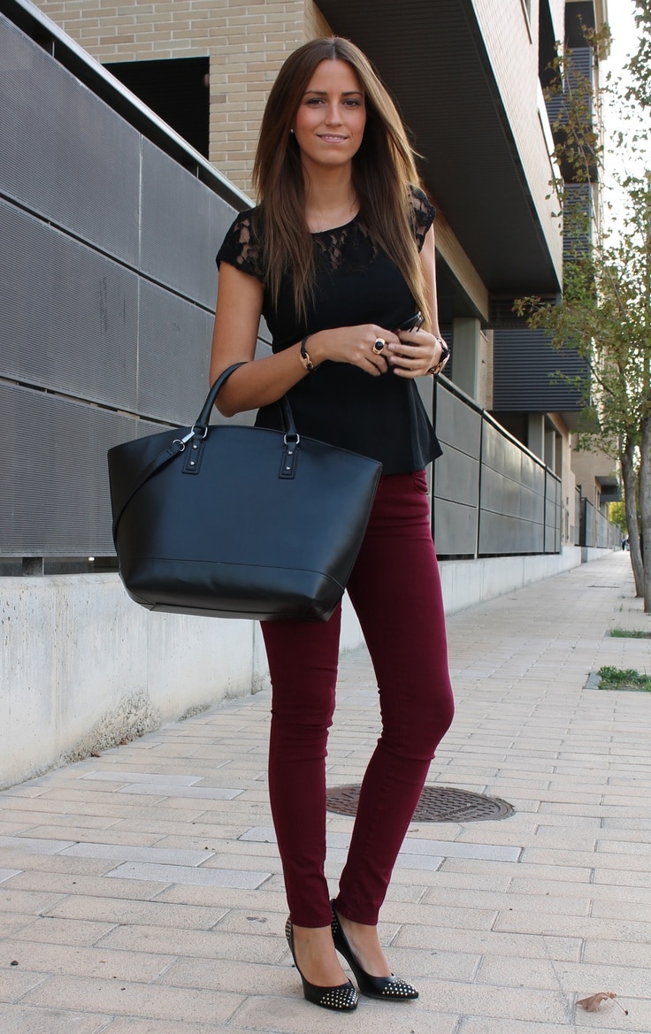 Jeans in burgundy will look unusual. After all, we are all used to seeing them in traditional blue
