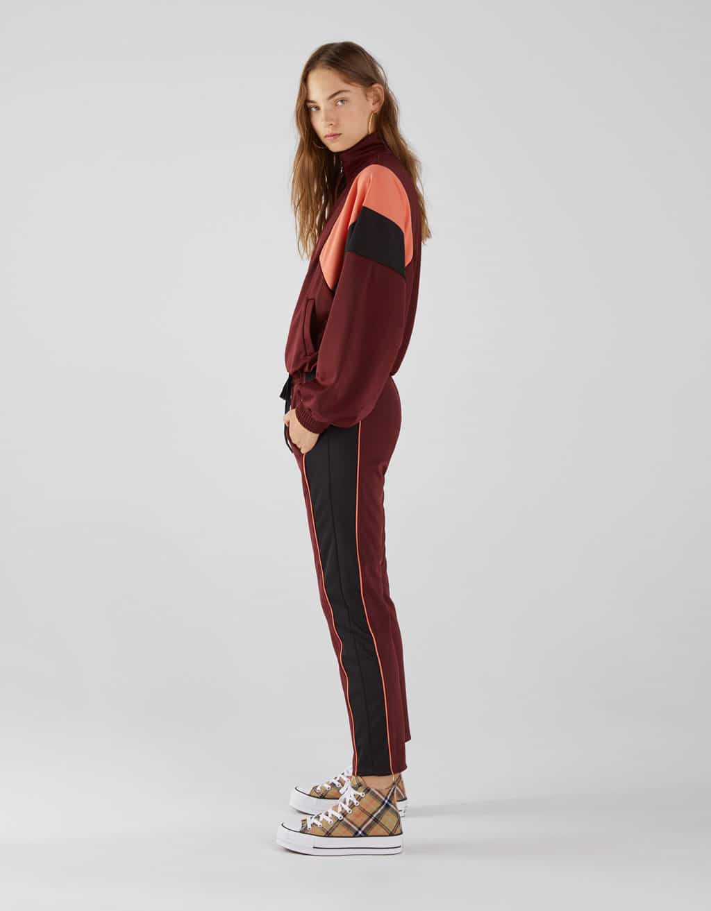 To dilute the standards of tracksuits, you just need to purchase burgundy pants with stripes. In combination with a white T-shirt and matching sneakers, you will look bright, but at the same time sporty.