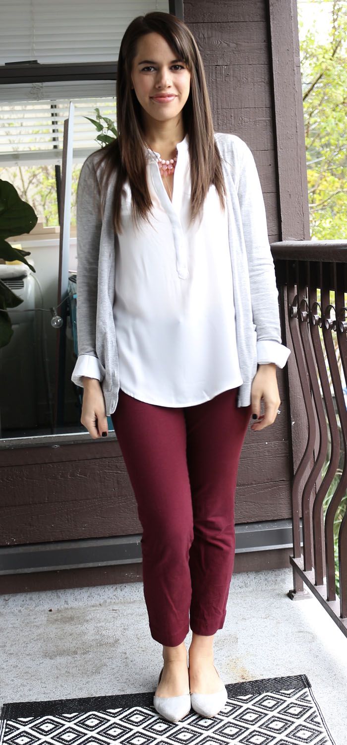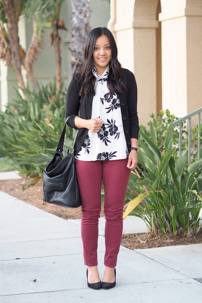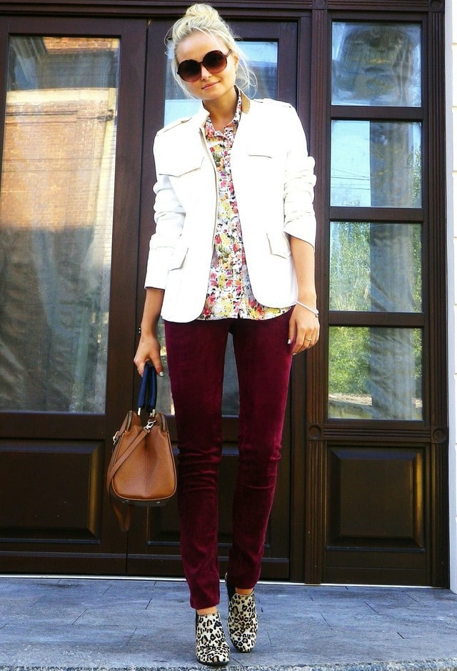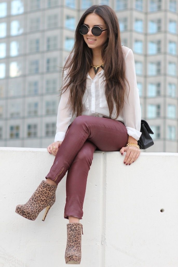 A white, silk blouse in combination with a burgundy color will add some zest to your look.