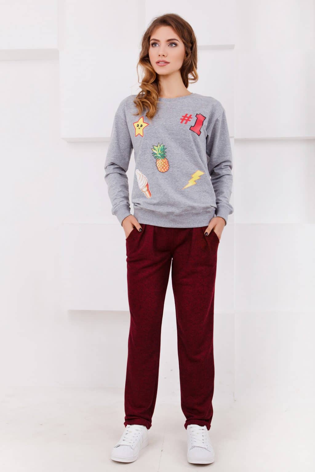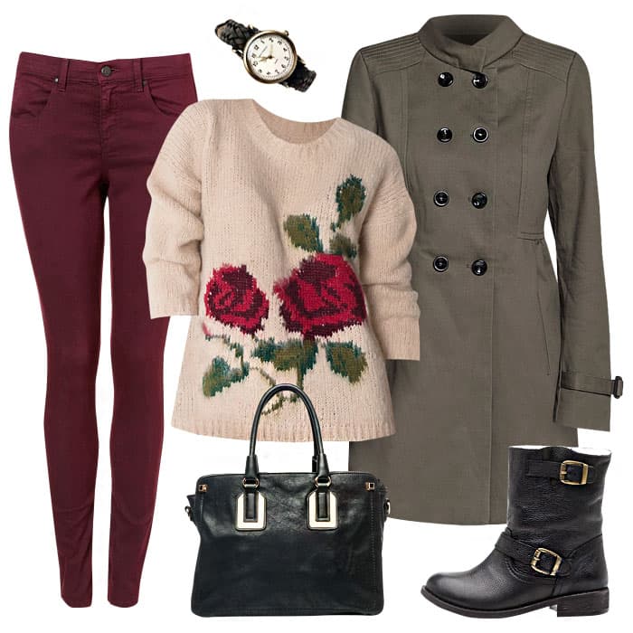 It is important to remember that in your image there is already a bright detail of clothes - these are burgundy trousers. And you need to choose such companion clothes that will emphasize the burgundy color. And do not drown him.