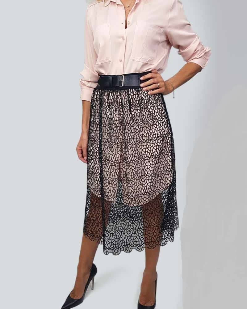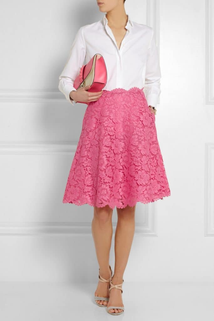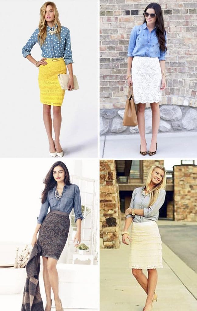 A lace skirt looks great with a strict shirt. The thinner the shirt fabric, the more romantic the image will be, and vice versa: with shirts made of thicker fabrics, you can easily create a business bow.