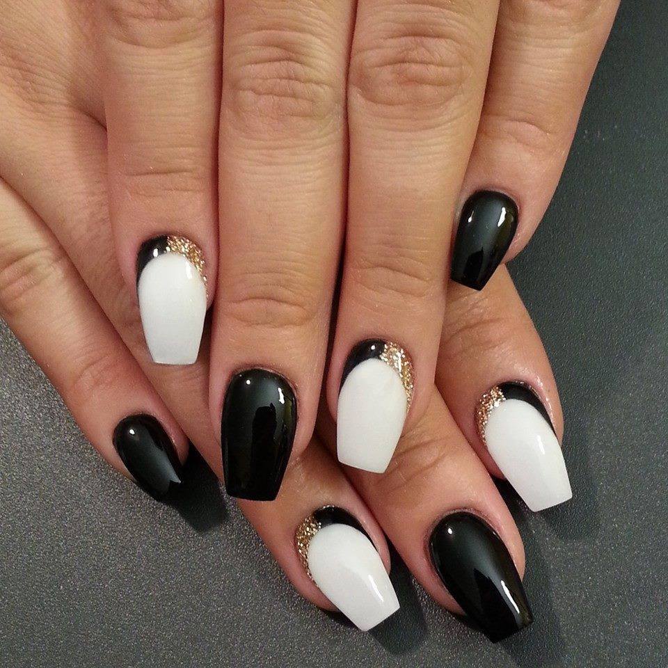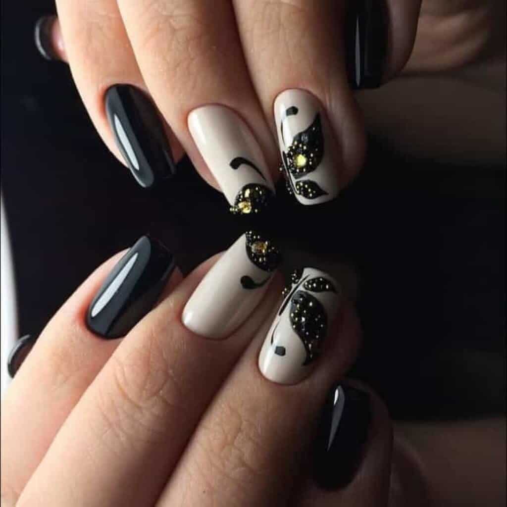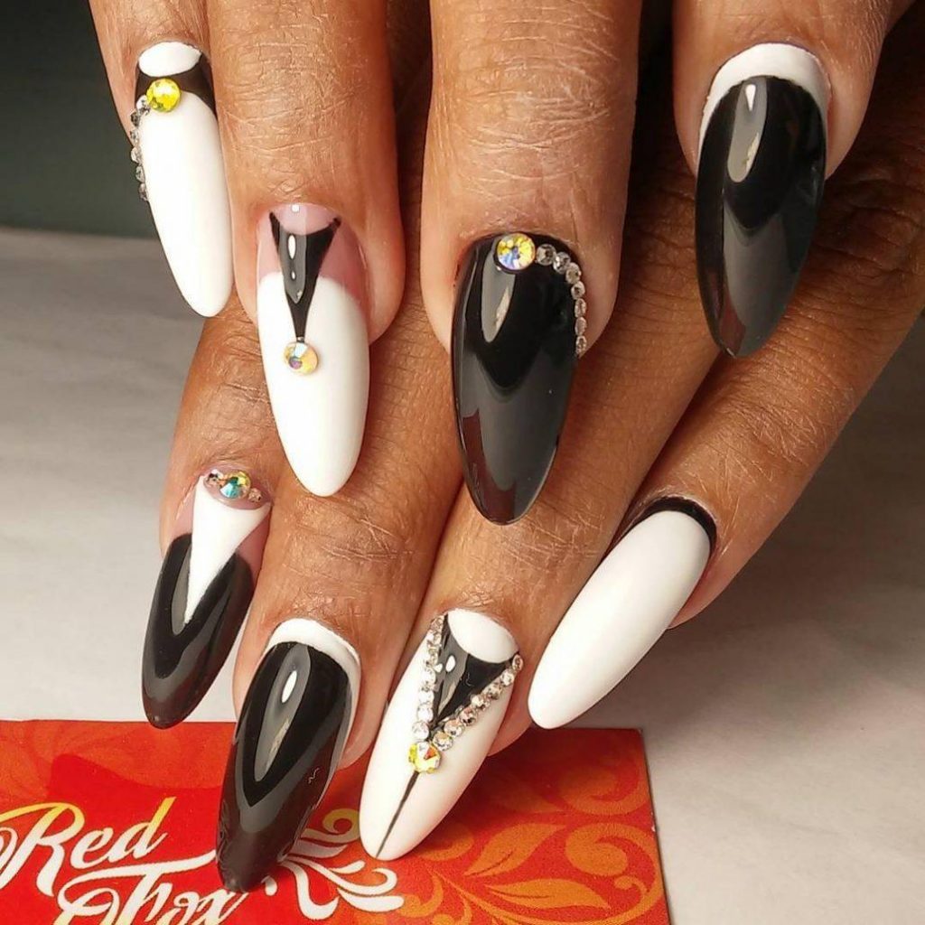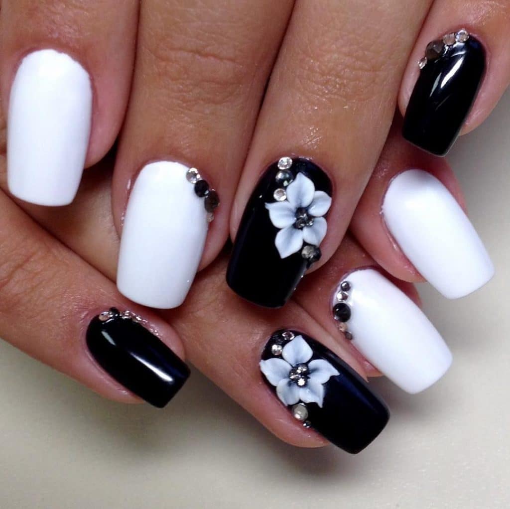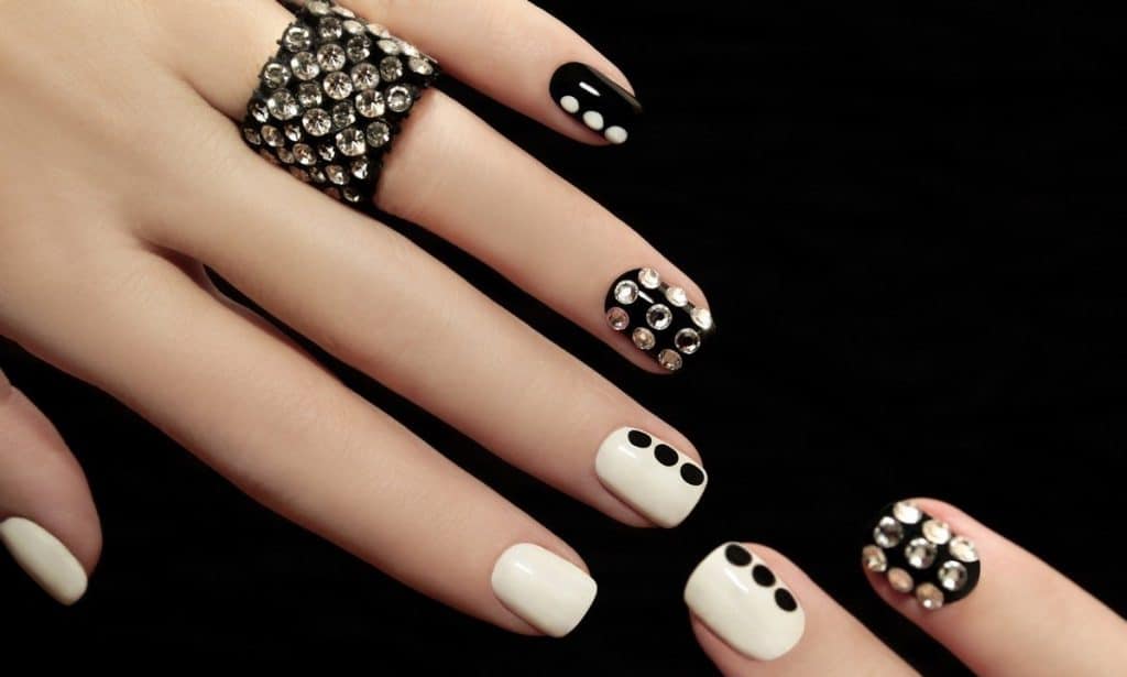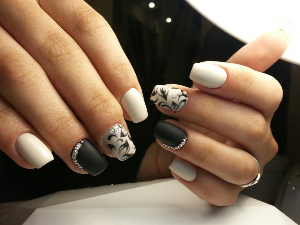 A great option for an evening or holiday manicure is a black and white manicure decorated with rhinestones or sparkles.