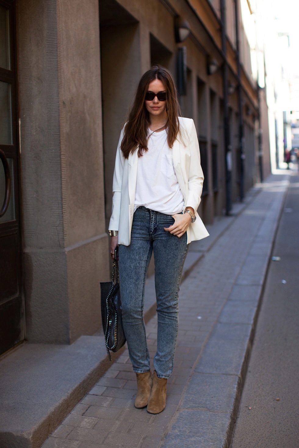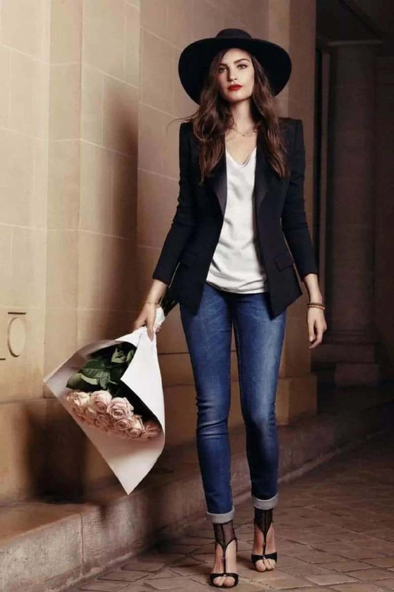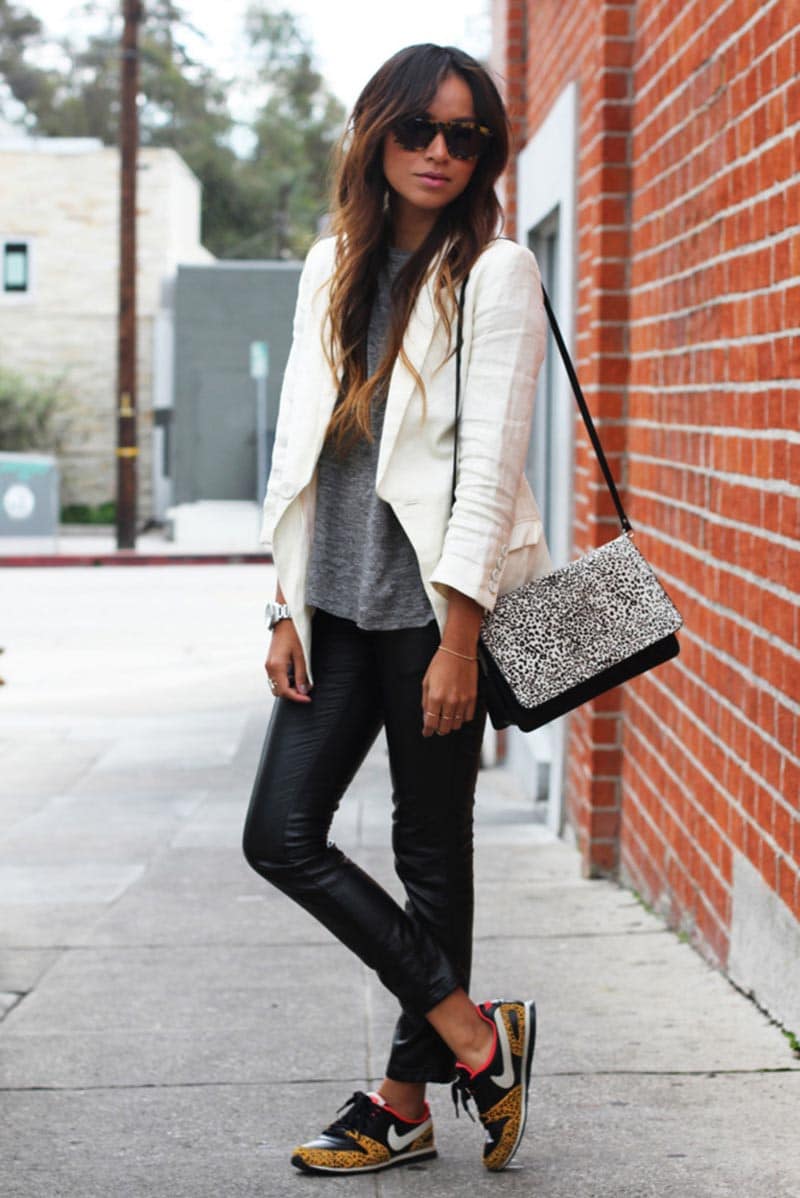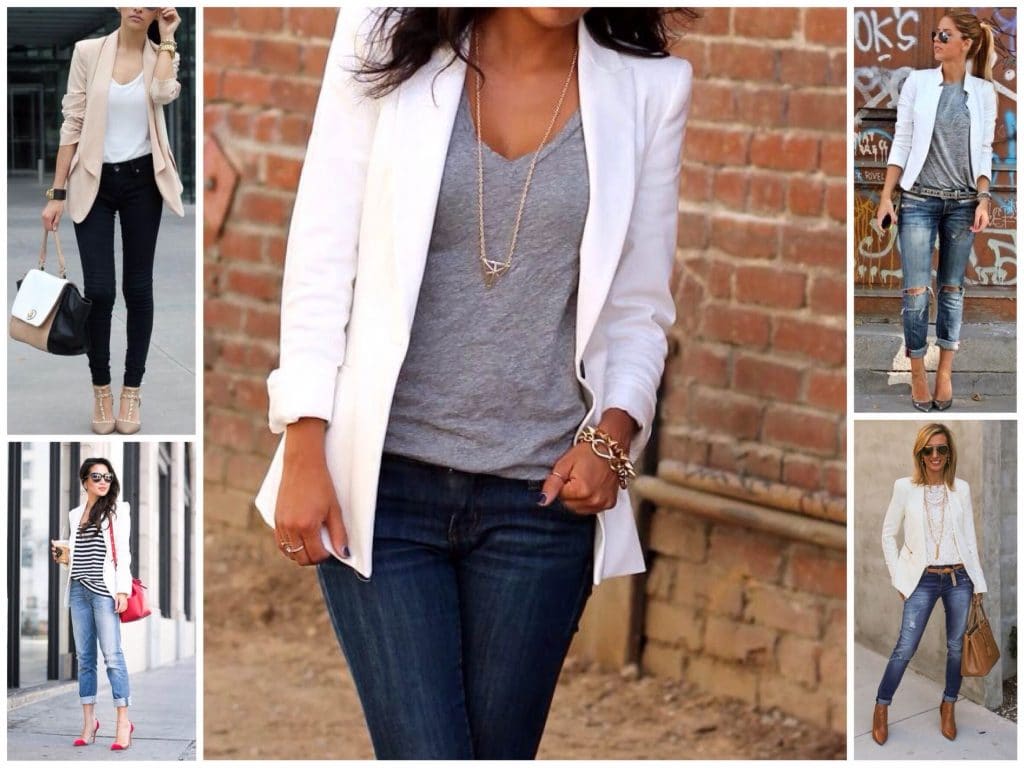 Jeans, a T-shirt, a jacket and sneakers or pumps combine perfectly. This is the easiest way to make the jacket not office, but casual and even sport chic.