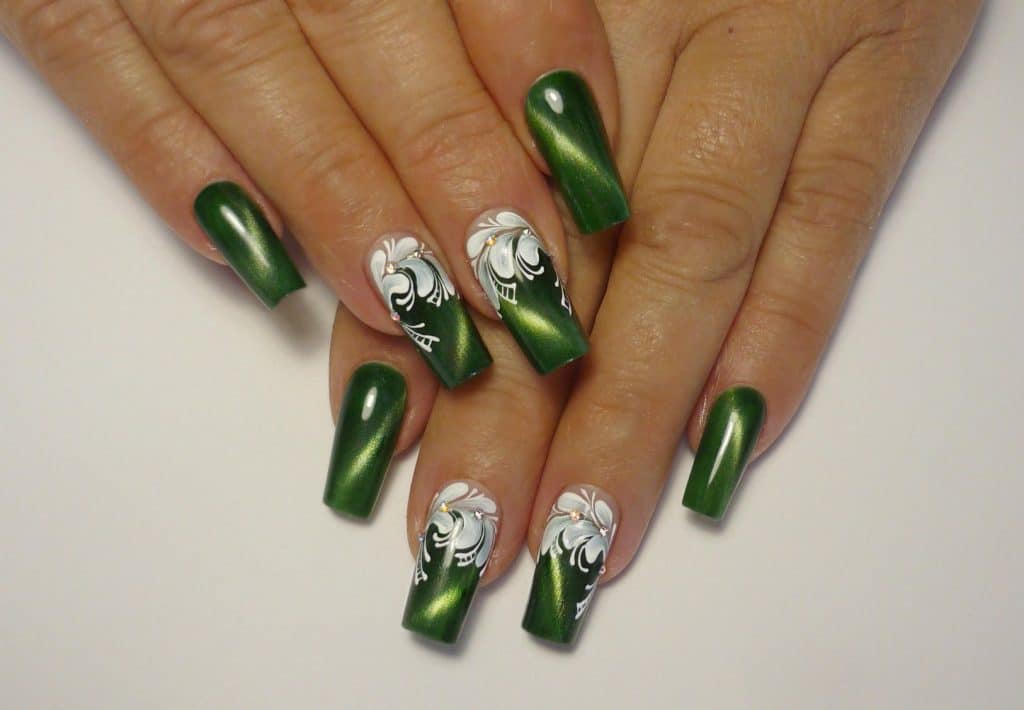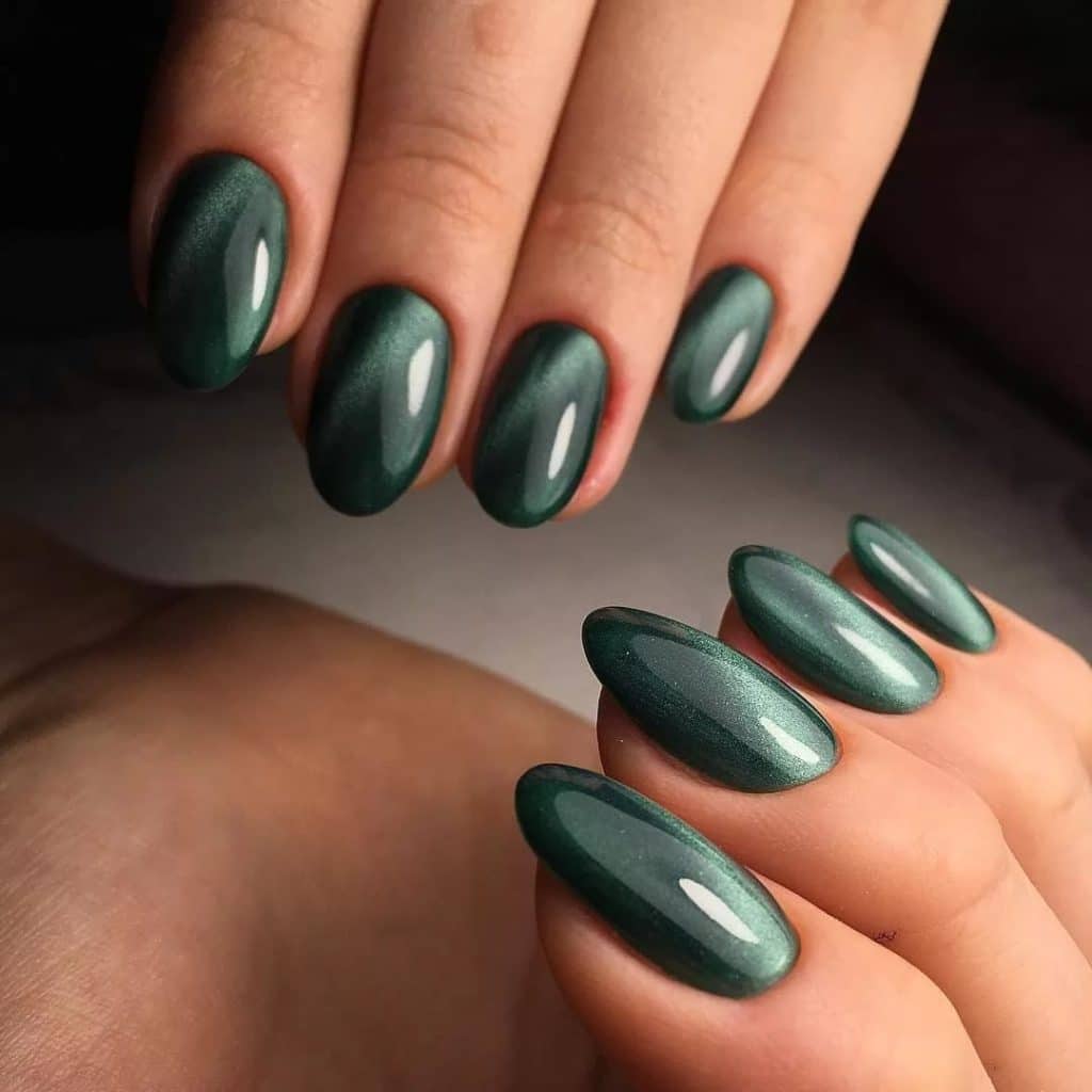 For the warmer months, warm tones of emerald color are usually used. An excellent solution would be to highlight one of the nails with white varnish. And in winter it will be especially relevant to make a manicure in the technique of "cat's eye"