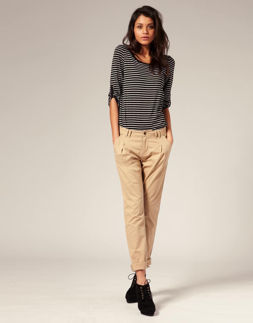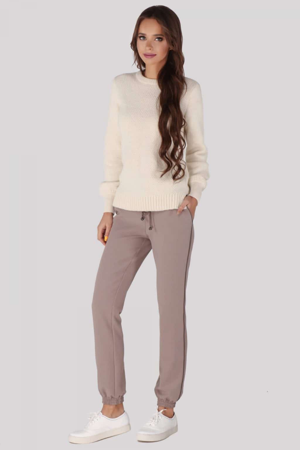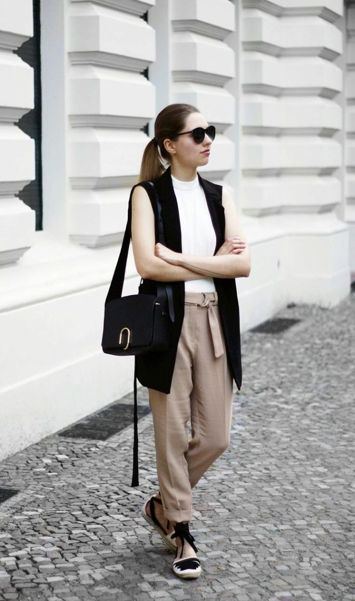 As we said earlier, beige pants can be worn in cooler times. And when yellow foliage is already lying on the street, but the weather still pleases us with a little warmth, you can put on beige trousers in combination with a warm sweater and shoes with stable heels.