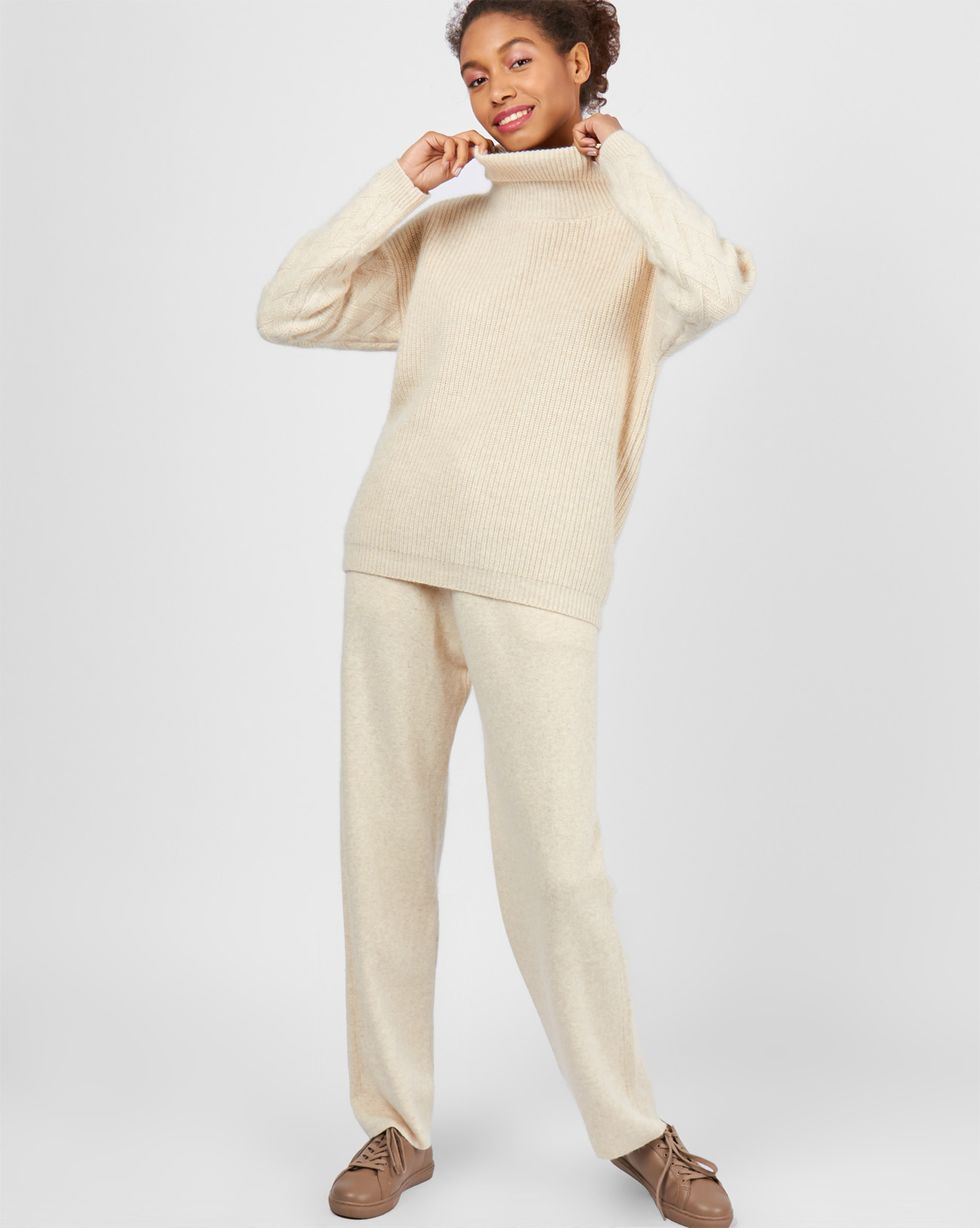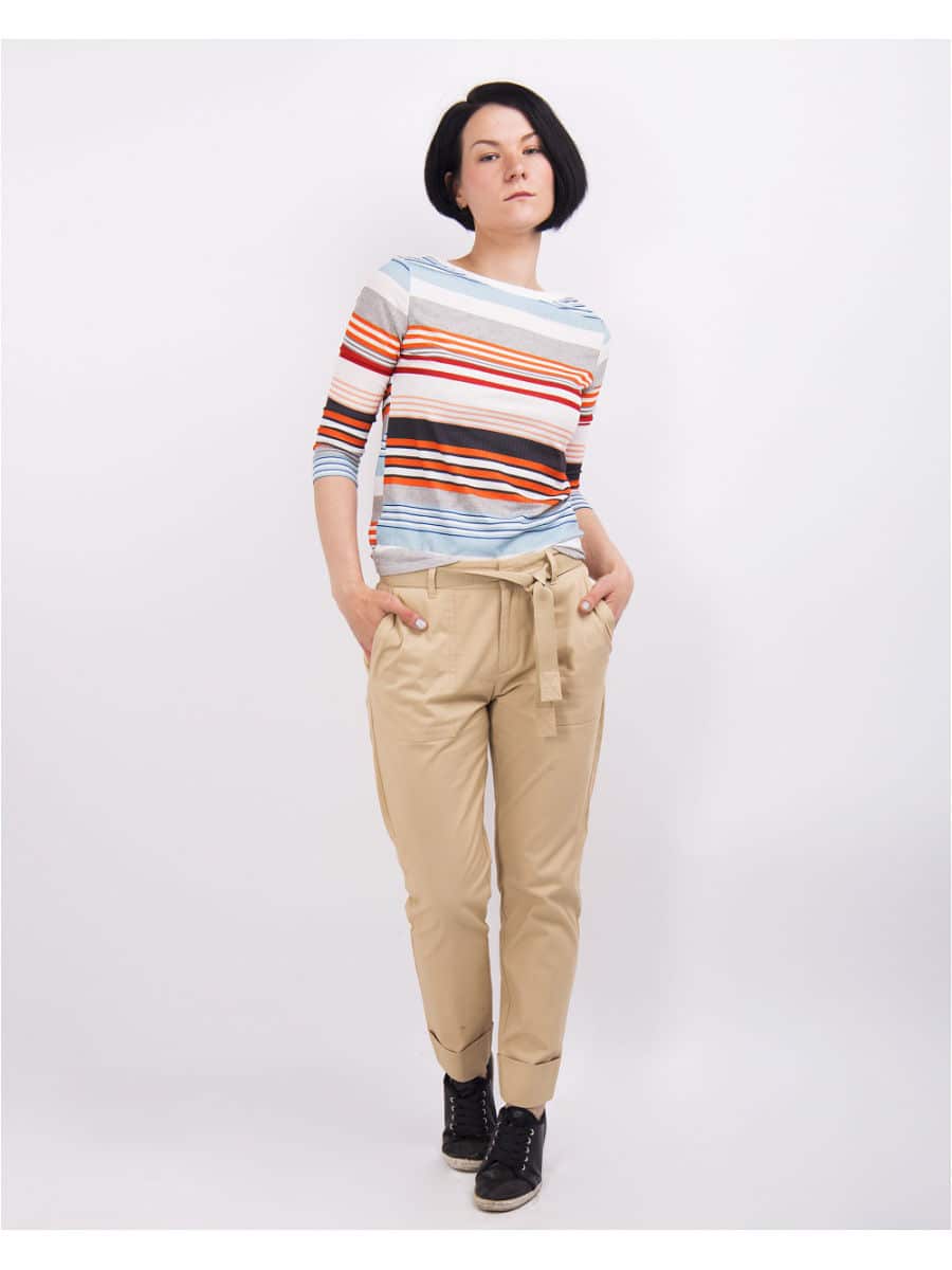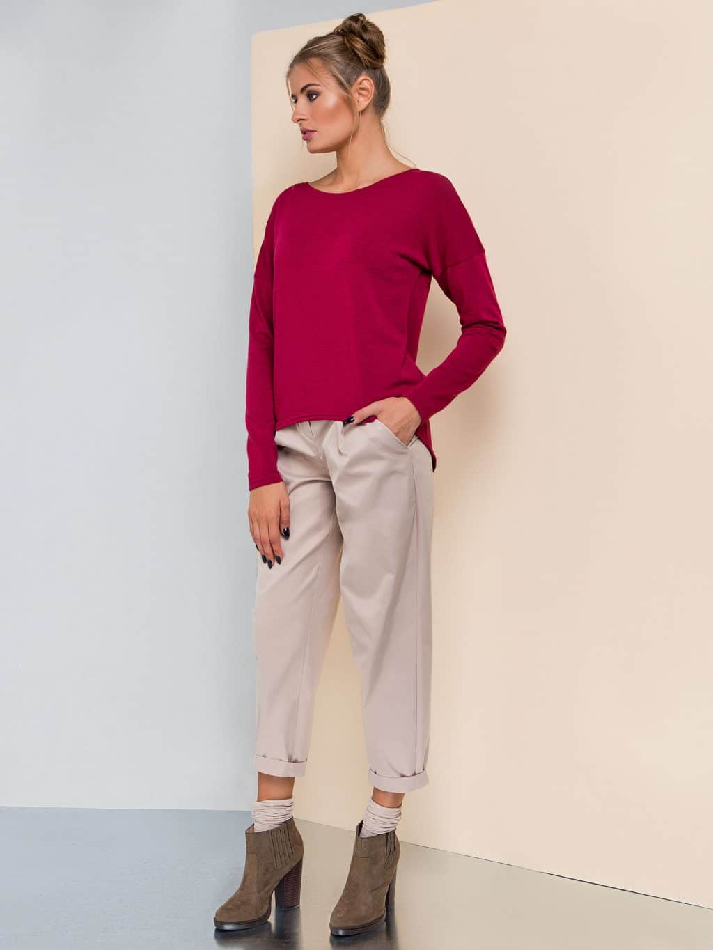 As we said earlier, beige pants can be worn in cooler times. And when yellow foliage is already lying on the street, but the weather still pleases us with a little warmth, you can put on beige trousers in combination with a warm sweater and shoes with stable heels.