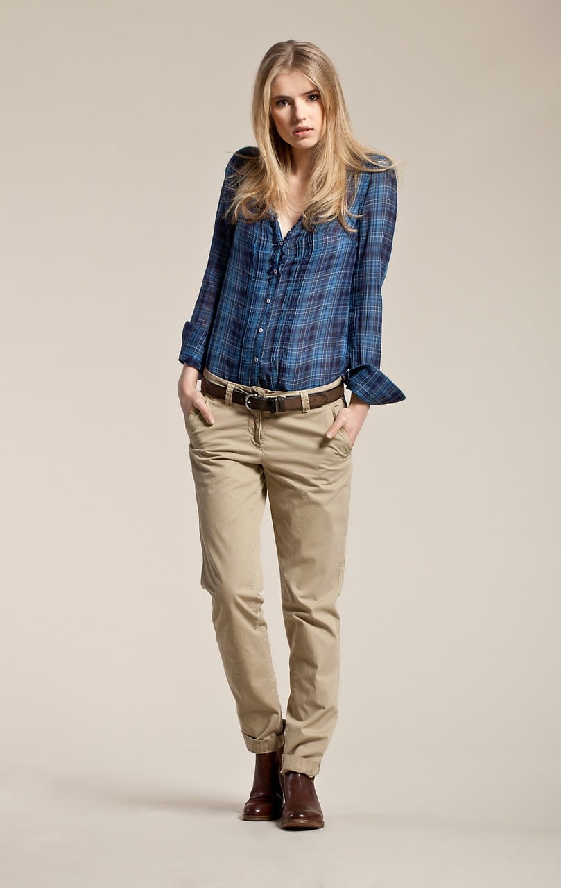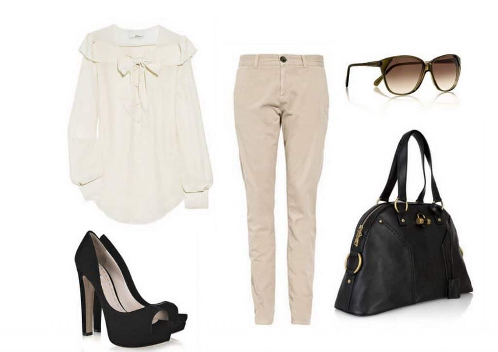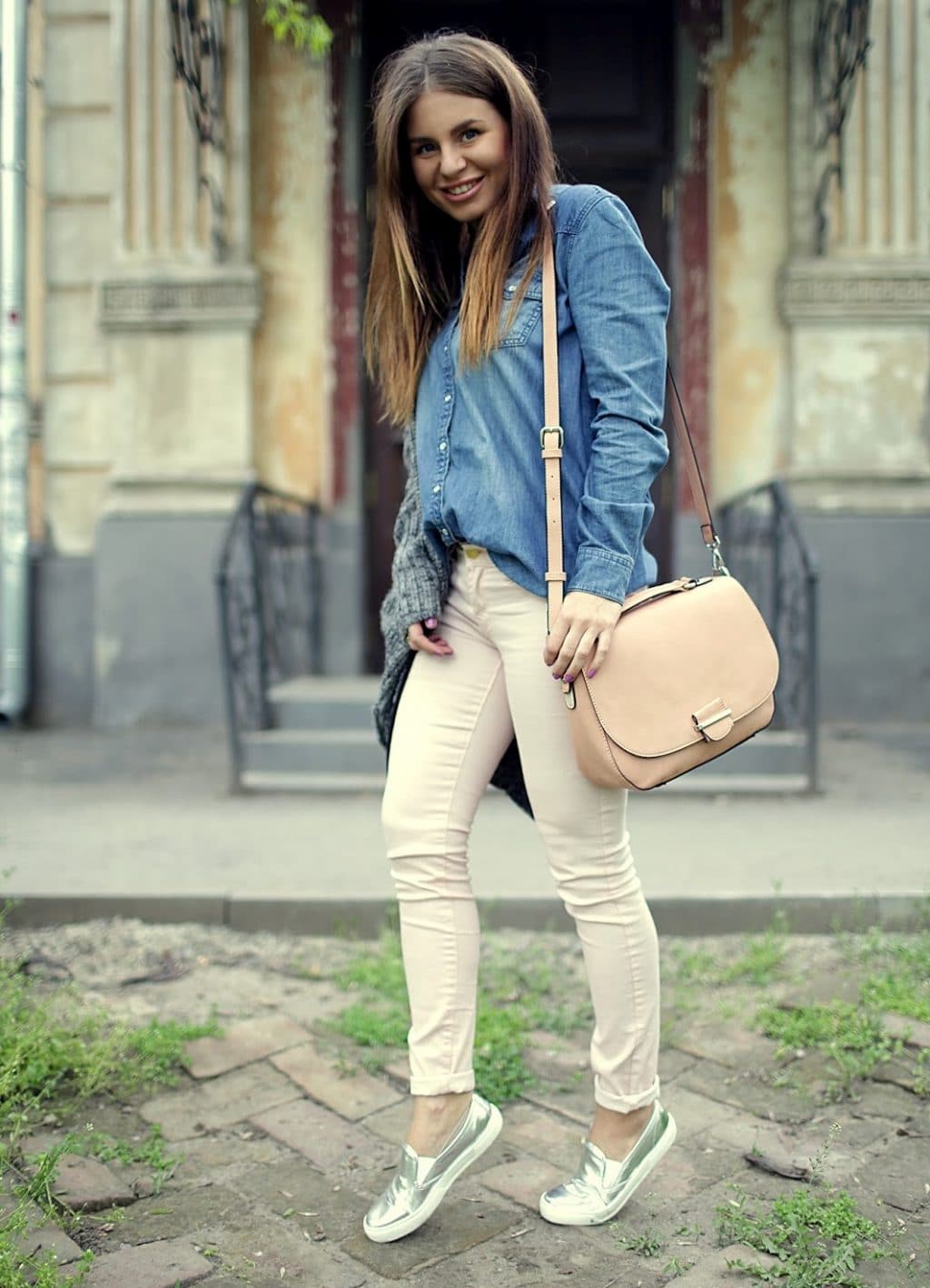 In warm weather, you can combine beige pants and sweatshirts. A denim shirt, mocassins and a bulk bag will be a great combination.