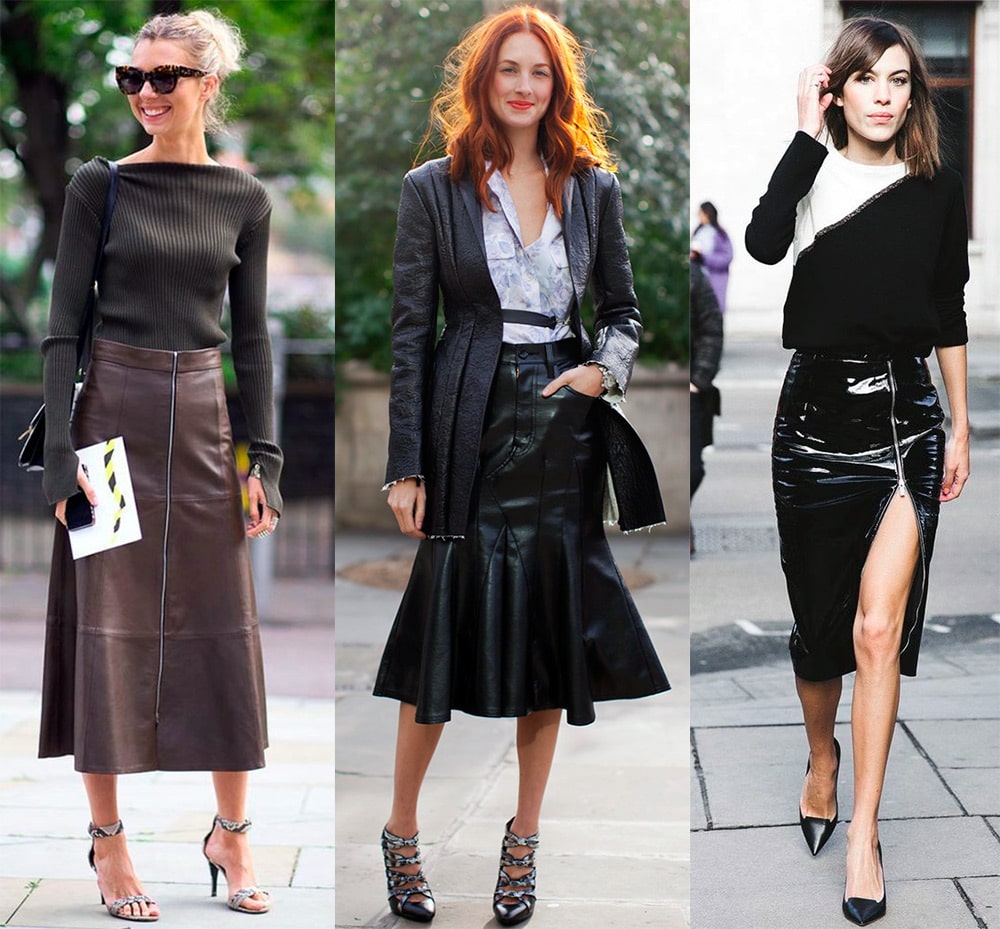 Midi leather skirts are mostly worn in cool weather. Such a skirt will definitely add femininity to your look. This season fashion leather jackets, combine such a jacket with a leather midi skirt if you are not afraid of bold decisions.