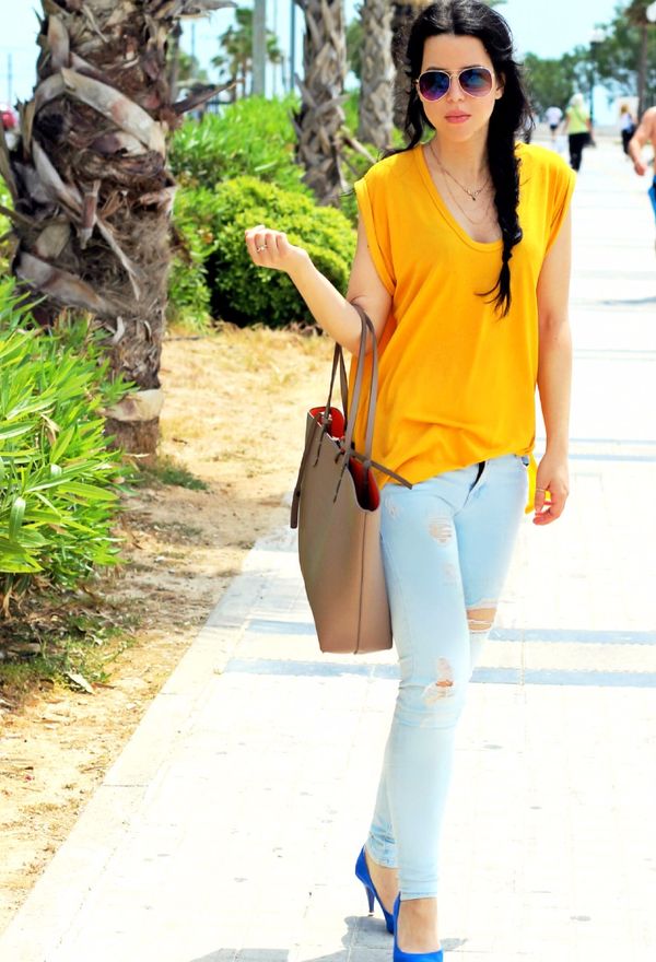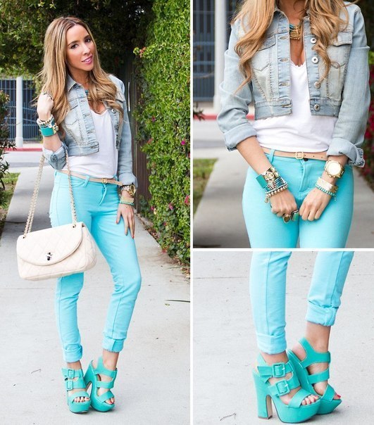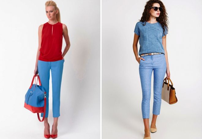 Pairing a bright top with blue trousers is a very time-consuming task. It is very important to skillfully select the color of the top so that it does not overshadow the color of the trousers themselves.