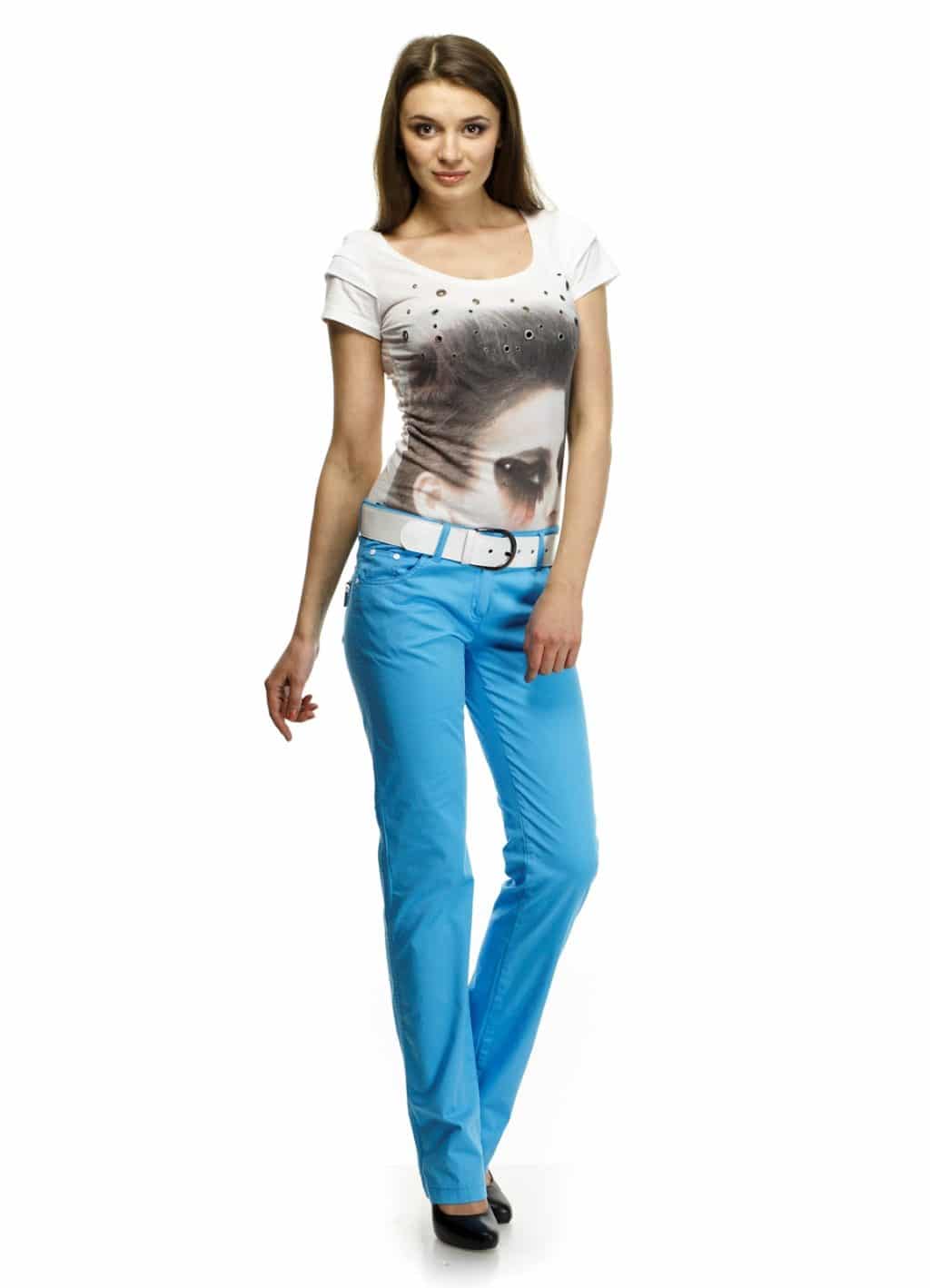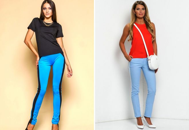 There are different shades of blue trousers. From light blue almost white to deep blue saturated tone. This color is perfect for any figure and is equally popular with both young girls and the older generation.