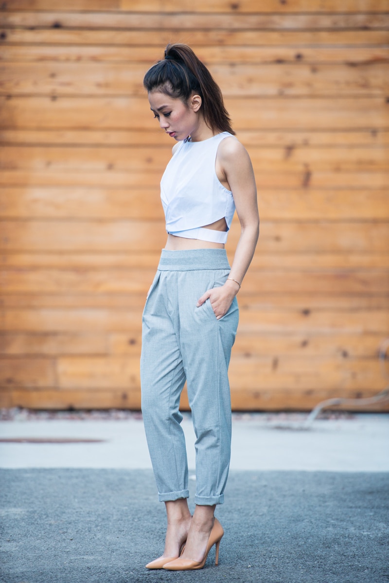 The style of trousers under such a top can be different. From sporty options to stricter, classic trousers.