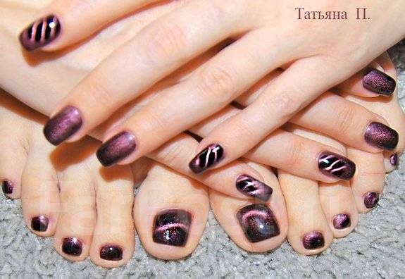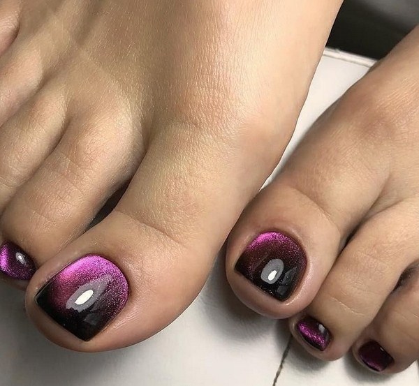 This cat-eye pedicure has been at its peak for more than one season. This pedicure is universal, it is suitable for any season. Pedicure cat's eye is very simple to perform and does not require special skills, just hold a magnet and the mysterious pedicure cat's eye is ready.Such a pedicure makes nails look like a gem, which shimmers in the light with different colors, attracting attention and captivating with its depth.